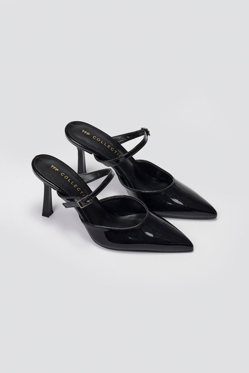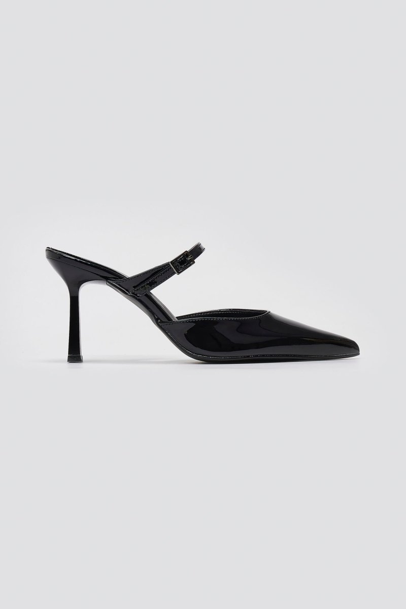 Κομψά μυτερά mules με λεπτό ψηλό τακούνι και διακριτική λεπτομέρεια λουριού. Μίνιμαλ σχεδιασμός, μοντέρνα κομψότητα και διαχρονική φινέτσα σε ένα.