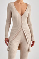 Σετ ρούχων γκοφρέ με άνοιγμα στη φούστα - Καφέ