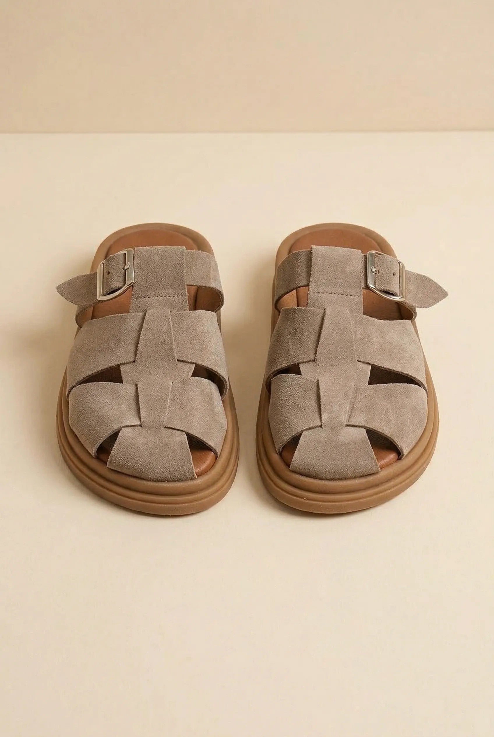 The Estil Suede Clogs Buckle Detail in Taupe are sophisticated, handcrafted sandals that combine timeless European design with everyday comfort. Featuring genuine suede leather construction and distinctive buckle detailing, these Greek-made clogs offer a refined aesthetic perfect for casual and semi-formal occasions. The thoughtfully designed cut-outs provide breathability while maintaining an elegant silhouette.