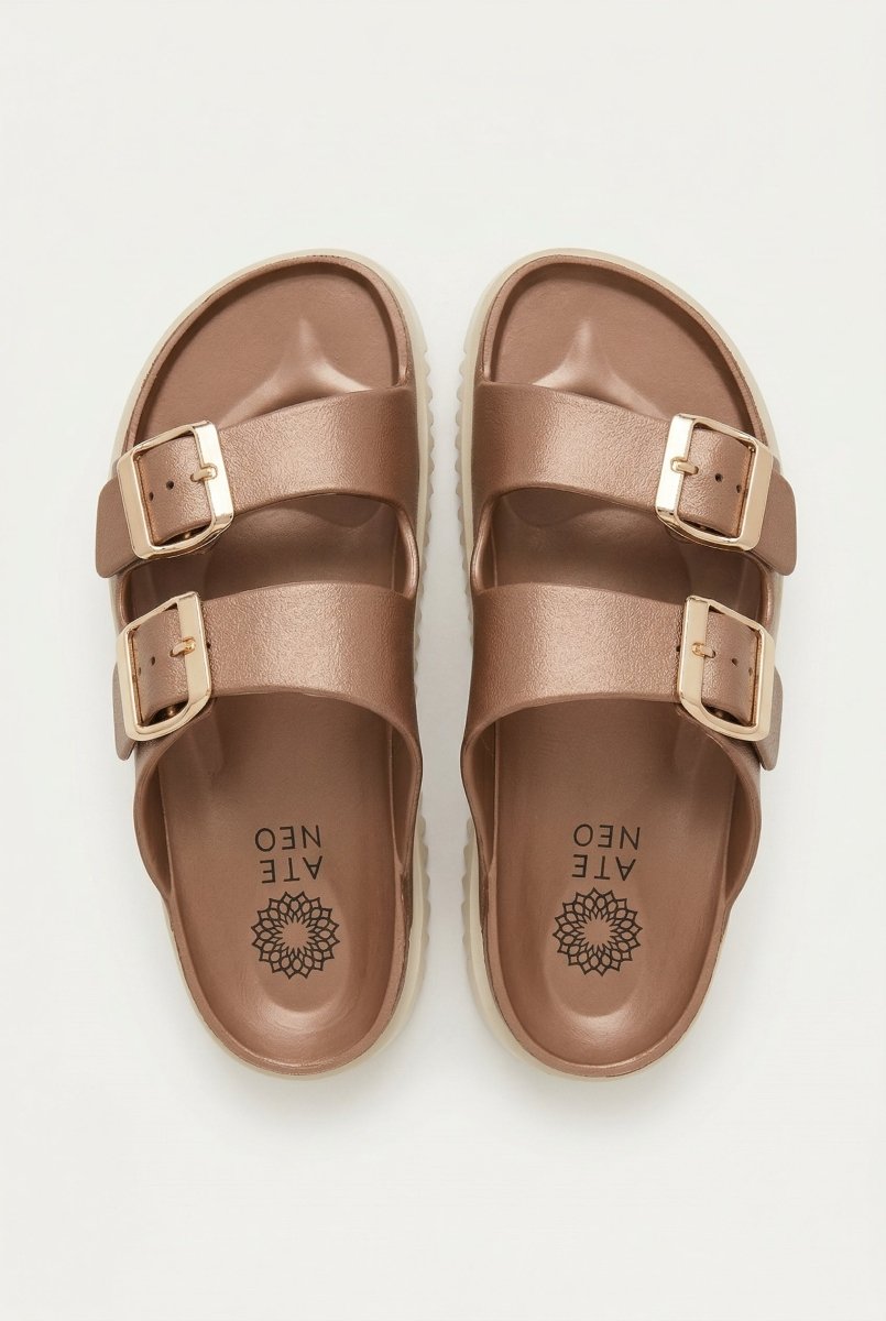 The ATENEO Flatform Buckle Sandals in Matte Rose Gold combine contemporary style with everyday comfort. These beach-inspired flatform sandals feature distinctive wide buckle straps and a thoughtfully designed anatomical footbed, making them an ideal choice for relaxed summer wear. The lightweight sole ensures effortless everyday wearability, whether you're heading to the beach, running errands, or enjoying casual outings.
