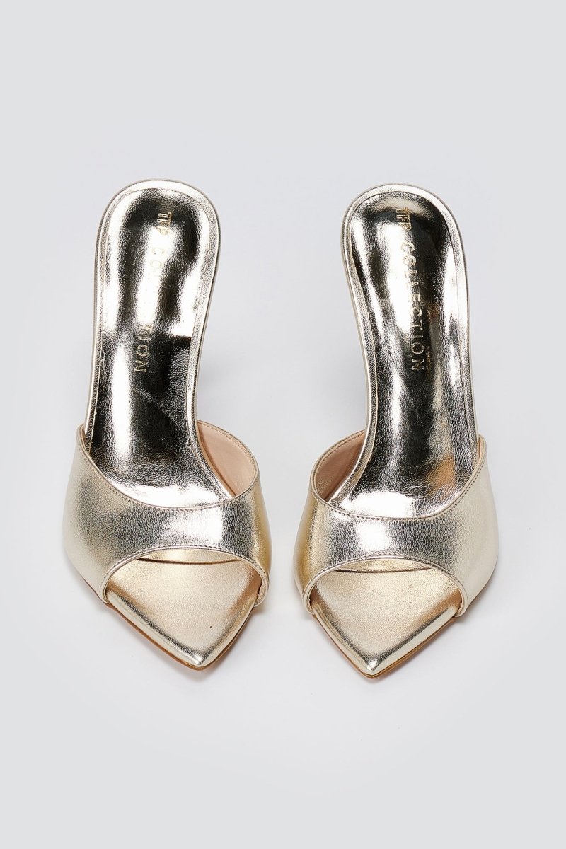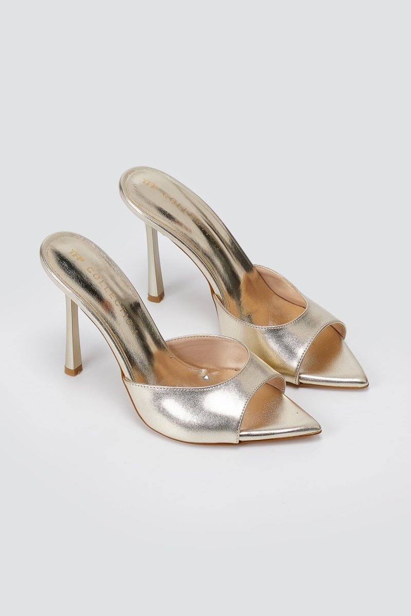 The TFP Stiletto Mules in Gold deliver sophisticated elegance with a sleek, minimalist design. Featuring a slim high heel and easy slip-on construction, these mules combine refined comfort with modern style, making them the perfect choice for contemporary women seeking versatile footwear that transitions seamlessly from office to evening occasions.