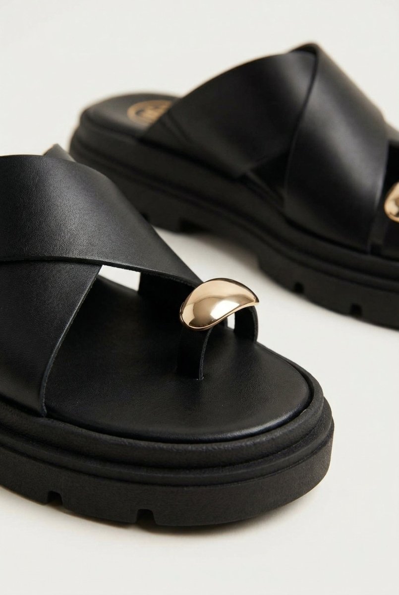 - Bold metal toe ring detail adds a striking modern accent