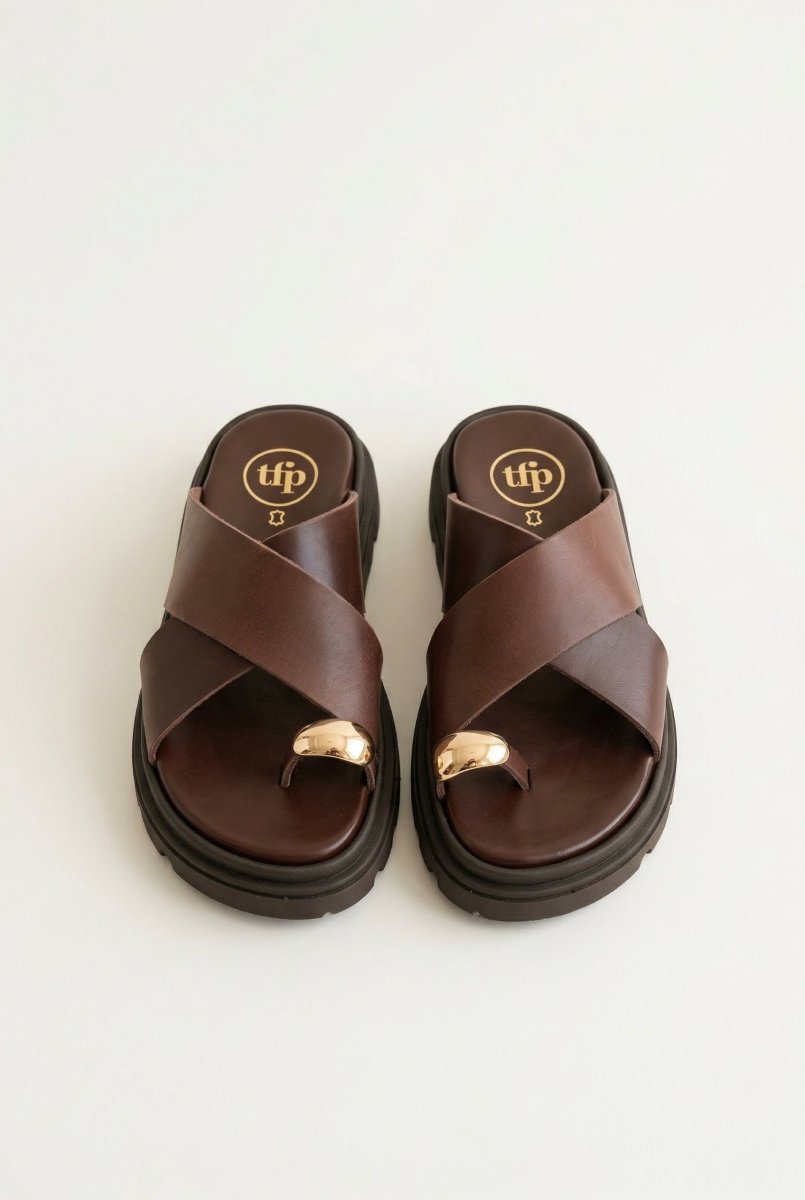 The TFP Toe Ring Flatform Sandals in Brown Matte deliver contemporary style with functional design. Featuring crossover wide straps and distinctive metal toe ring detail, these sandals combine bold aesthetics with everyday wearability. Perfect for creating elevated summer looks, these flatform sandals transition seamlessly from casual outings to more polished occasions.