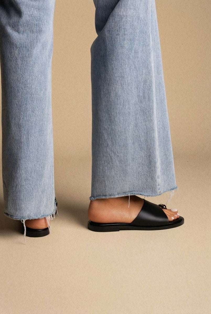 The Estil Toe Ring Sandals in Black Matte deliver sophisticated summer style with practical comfort. These leather sandals feature a distinctive toe ring design paired with a wide supportive strap and subtle metallic accent, creating a refined aesthetic perfect for modern women. The soft cushioned footbed ensures all-day wearability, making these sandals an ideal choice for warm-weather occasions.