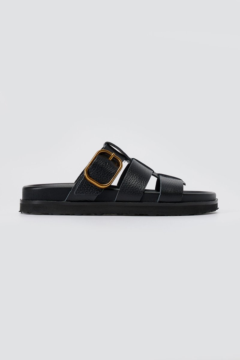 These sandals are true to size. We recommend selecting your standard shoe size for an optimal fit. The adjustable triple-strap system allows for personalized comfort, accommodating various foot widths and preferences. The buckle detail enables fine-tuning of the fit throughout the day.