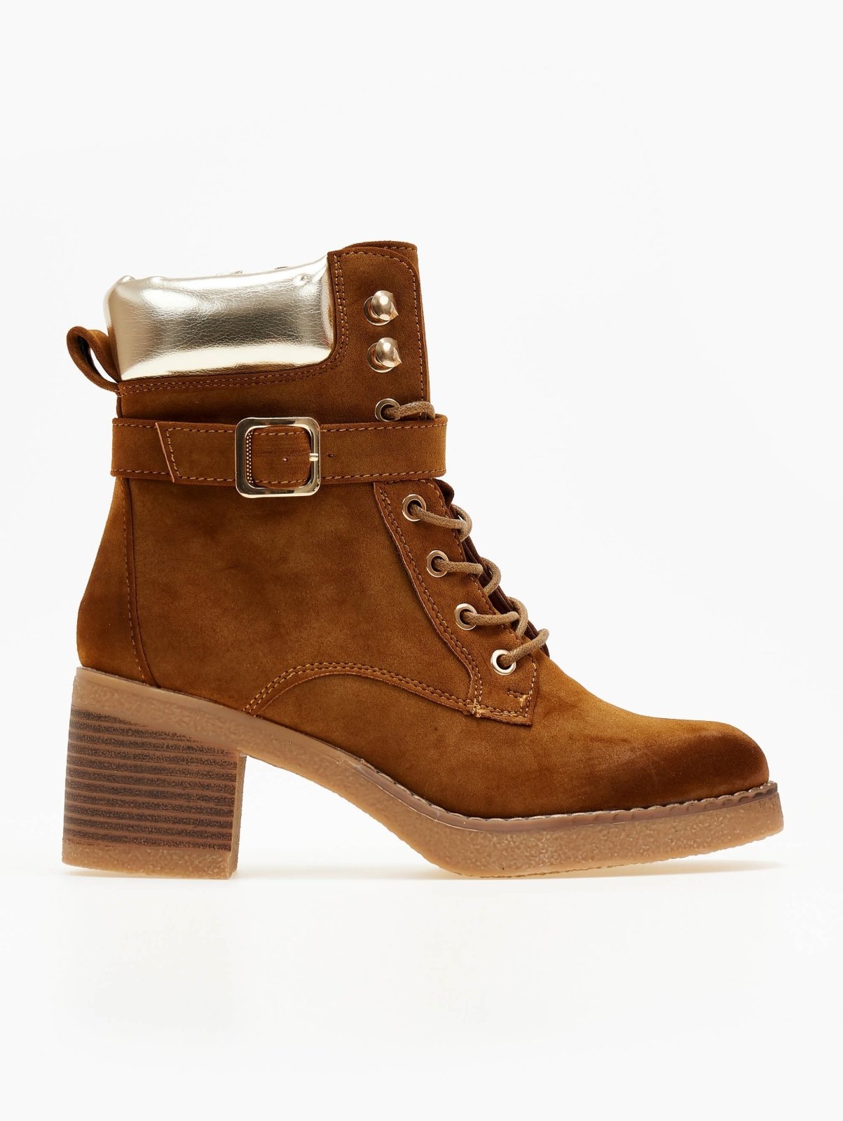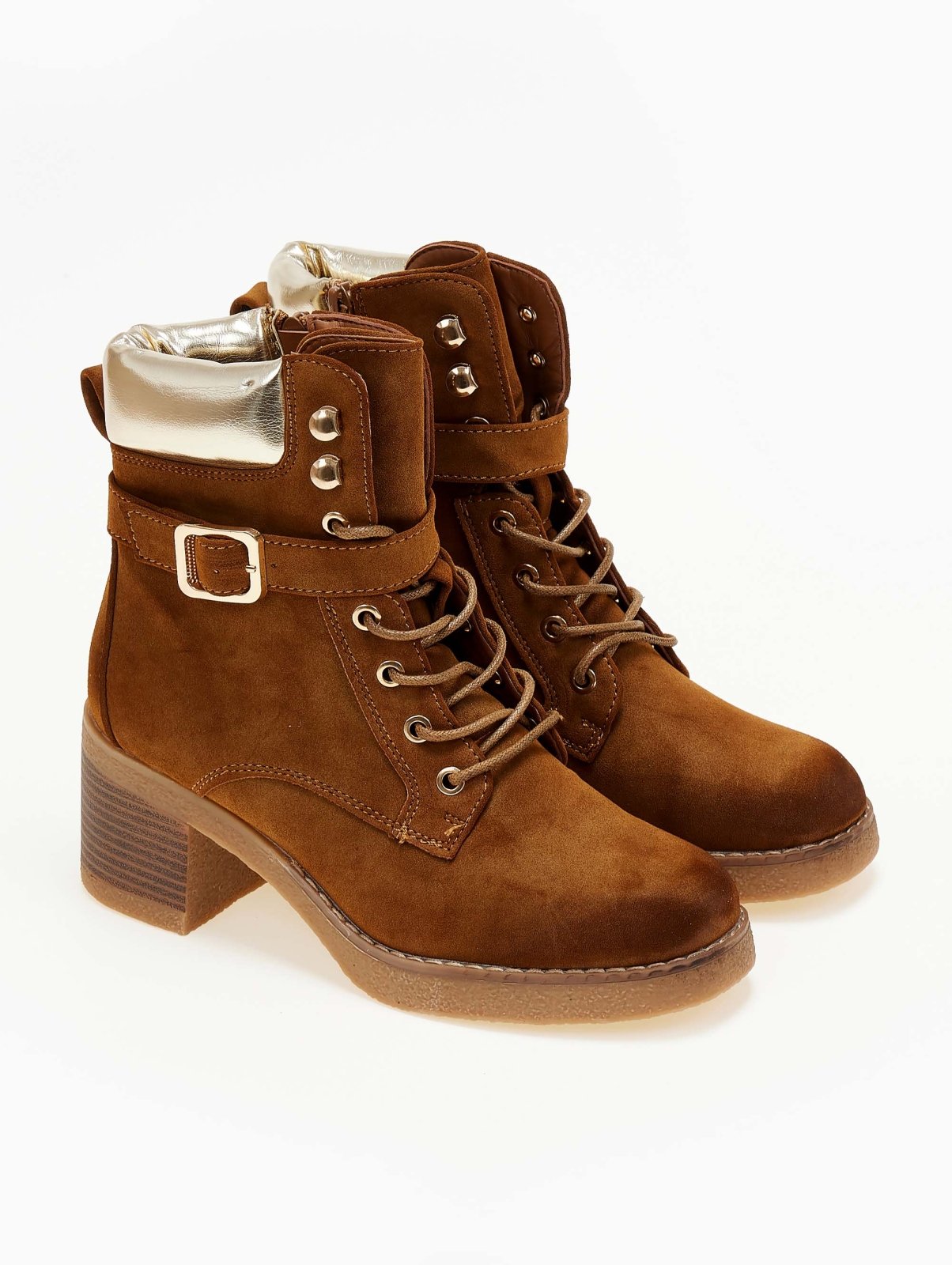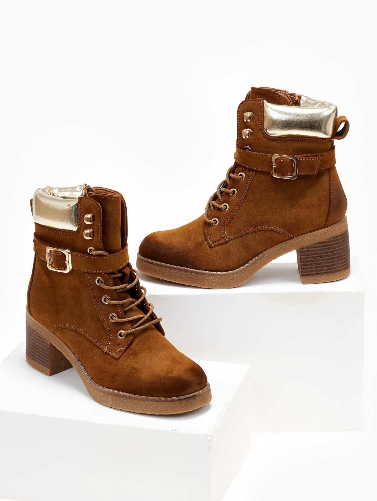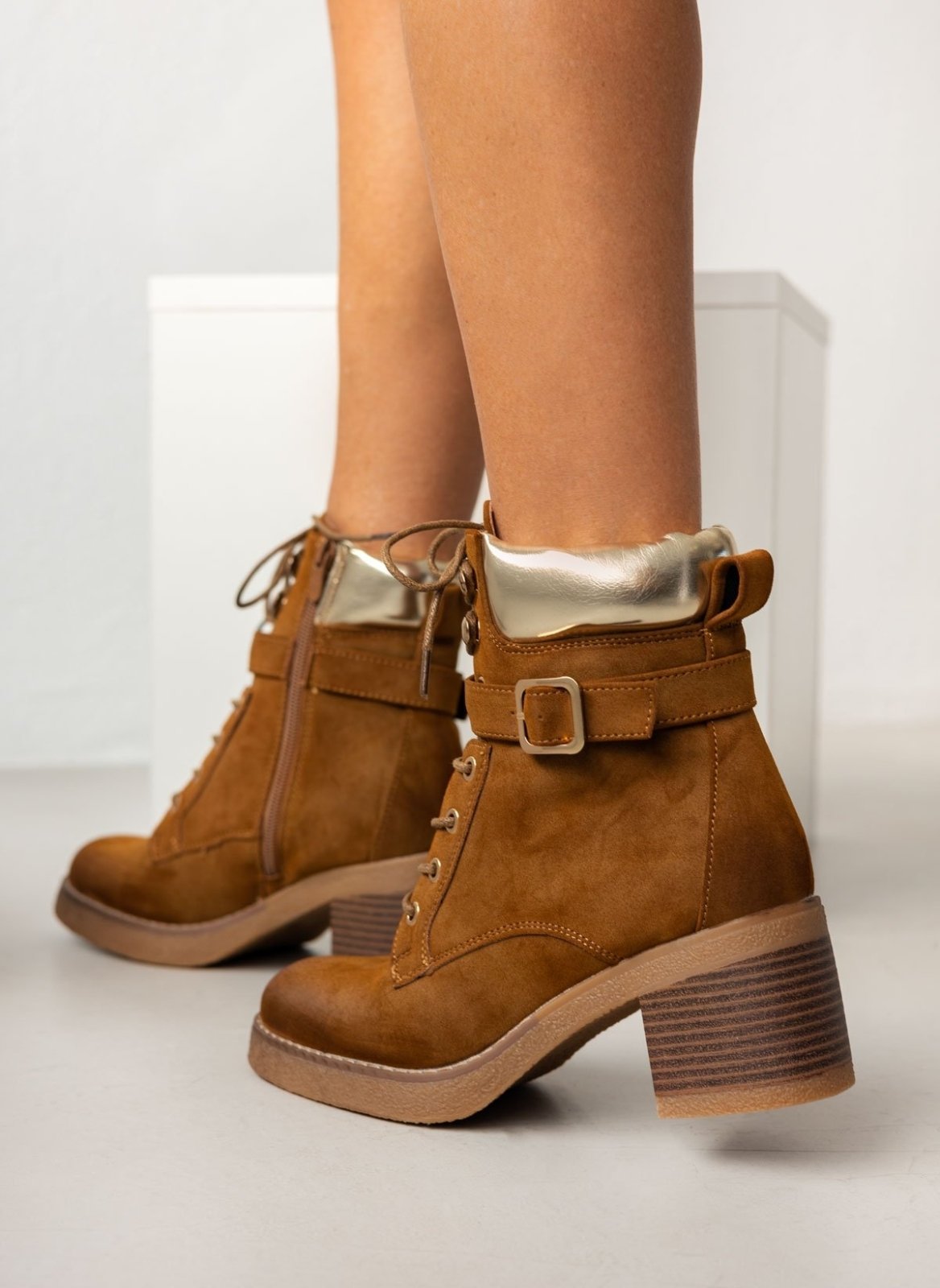 Αρβυλάκια με κορδόνια Erynn. Έχουν καπιτονέ λεπτομέρεια σε μεταλλικό χρώμα στο πίσω μέρος. Ζωνάκι με μεταλλικό κούμπωμα. Κρεπ σόλα με εφέ ξύλου στο τακούνι.