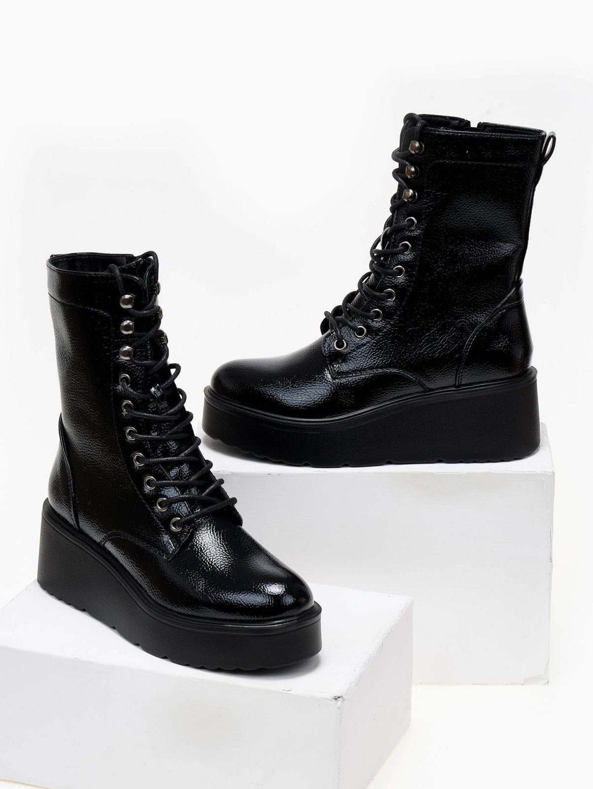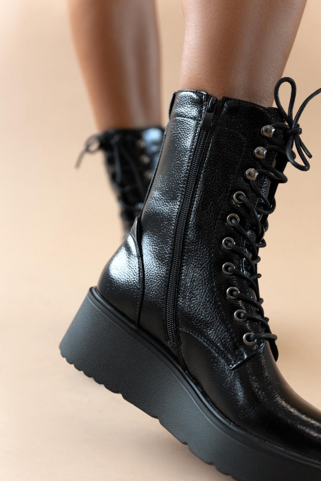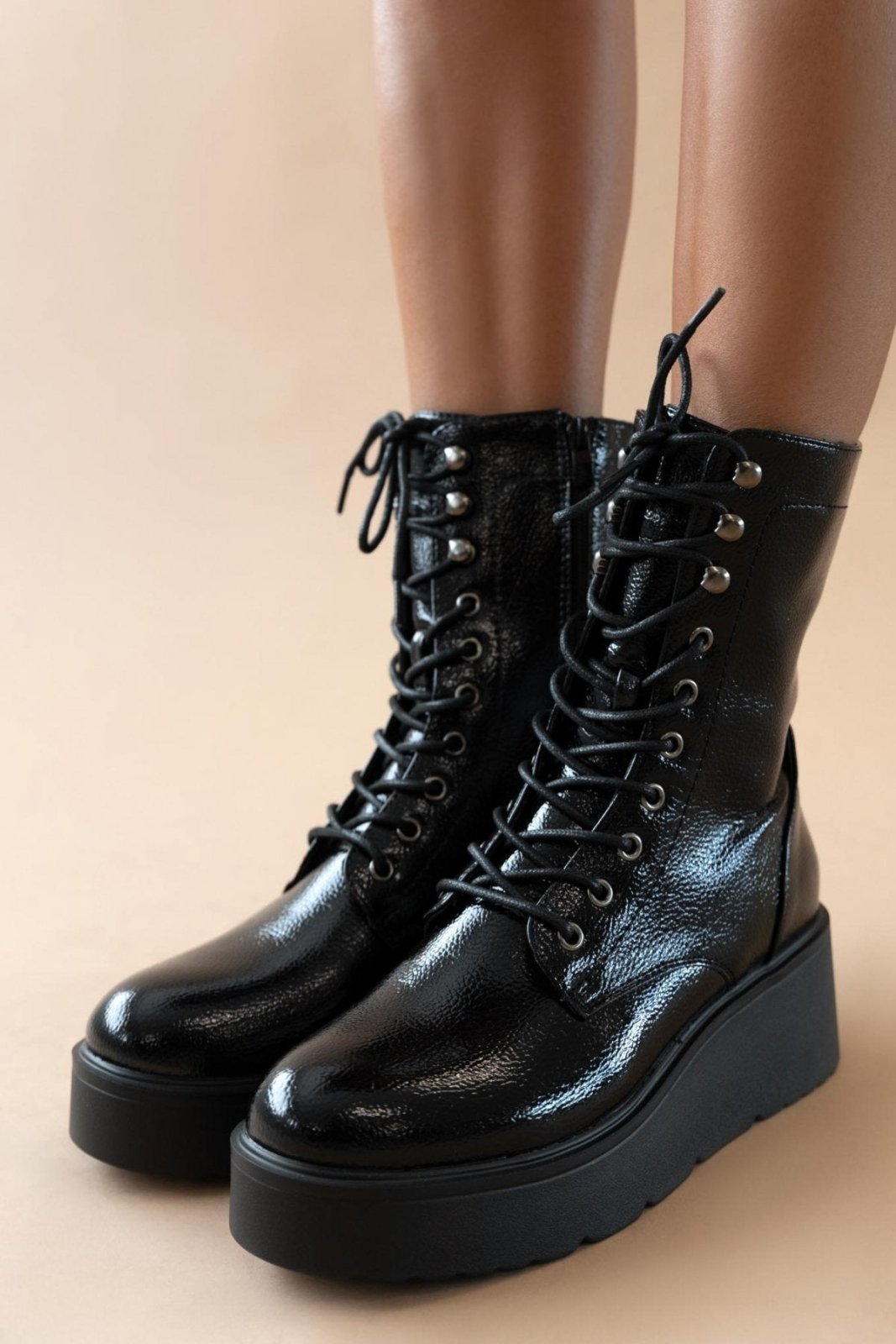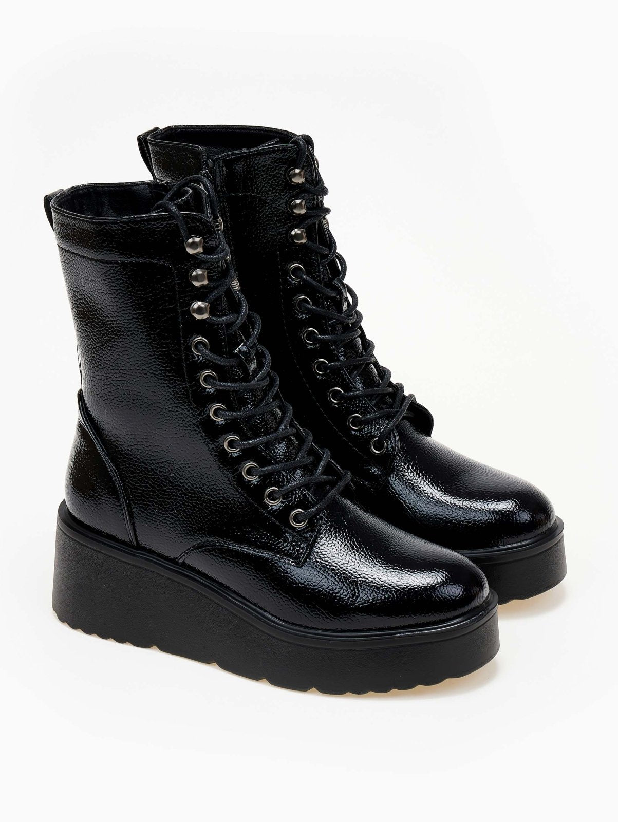 Αρβυλάκια flatforms λουστρίνι με ψηλή σόλα. Προσαρμόζονται με κορδόνια. Κλείνουν με φερμουάρ στο πλάι.