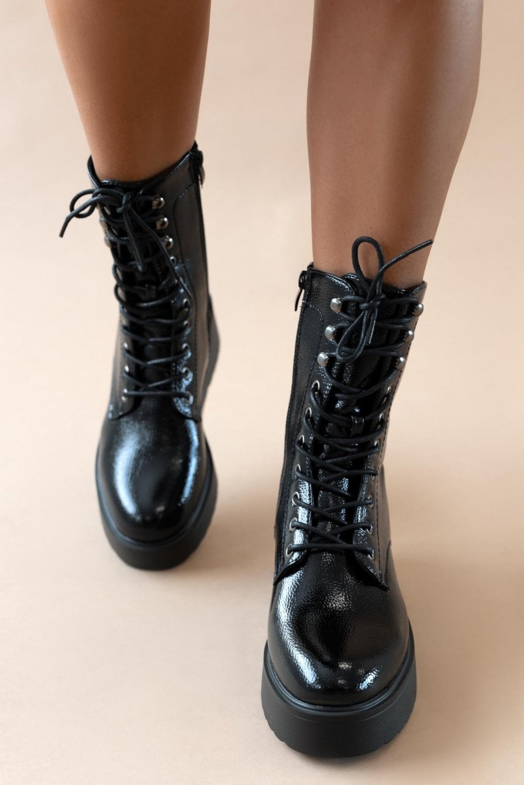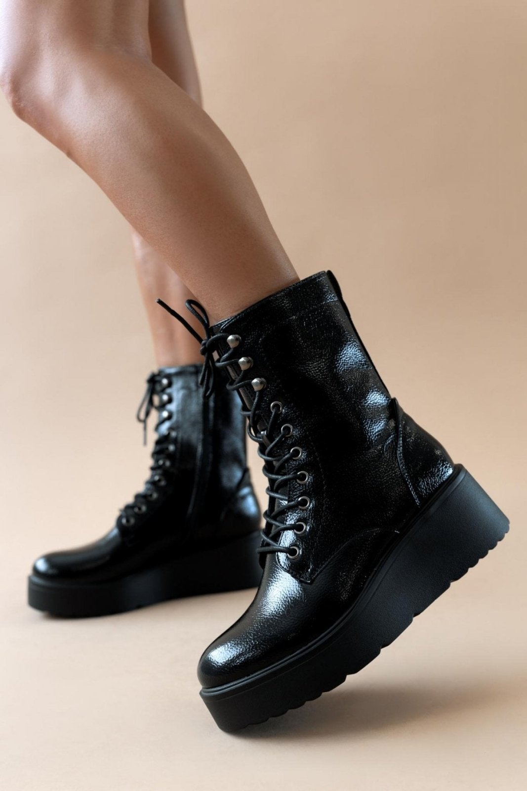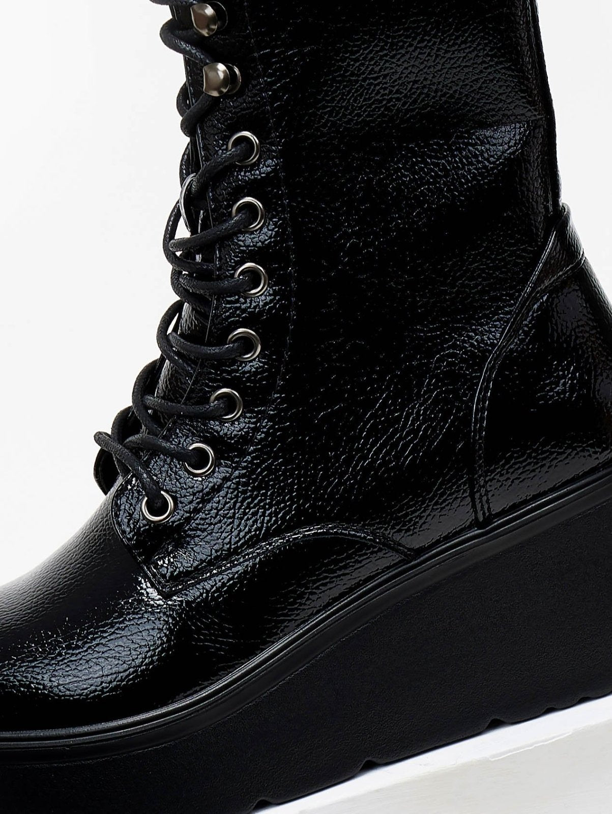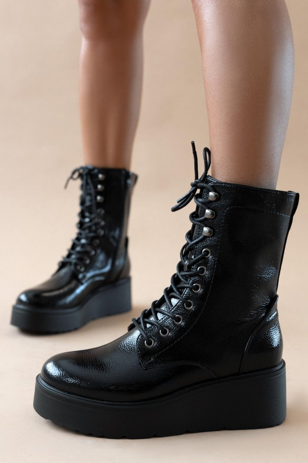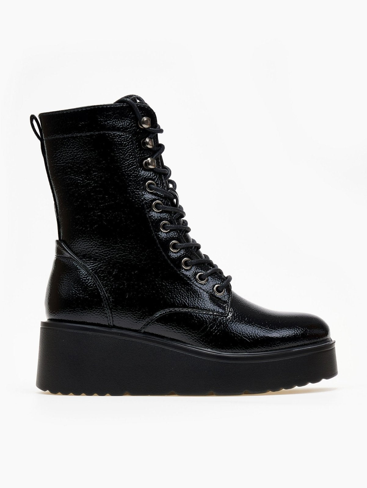 Αρβυλάκια flatforms λουστρίνι με ψηλή σόλα. Προσαρμόζονται με κορδόνια. Κλείνουν με φερμουάρ στο πλάι.