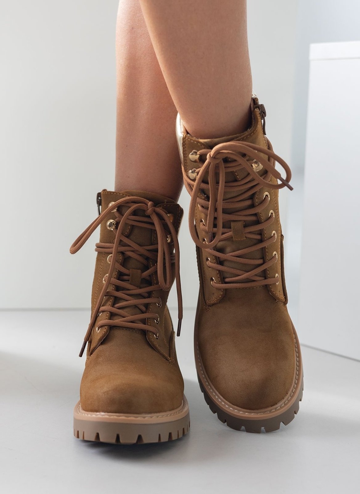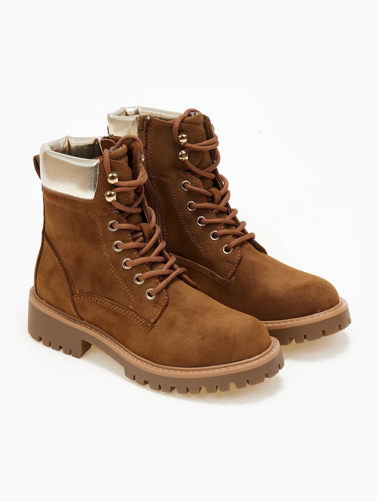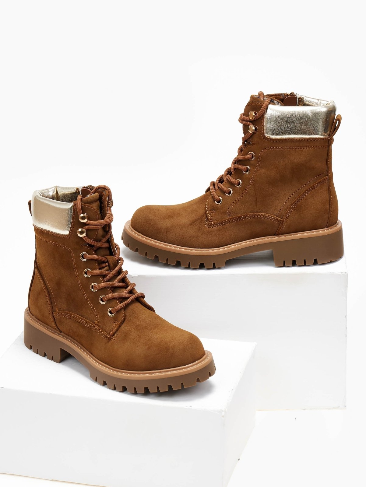 Αρβυλάκια Erynn. Έχουν λεπτομέρεια μεταλλικό χρώμα στο πίσω μέρος. Προσαρμόζονται με κορδόνια. Κλείνουν με φερμουάρ στην εσωτερική τους πλευρά. Τρακτερωτή σόλα