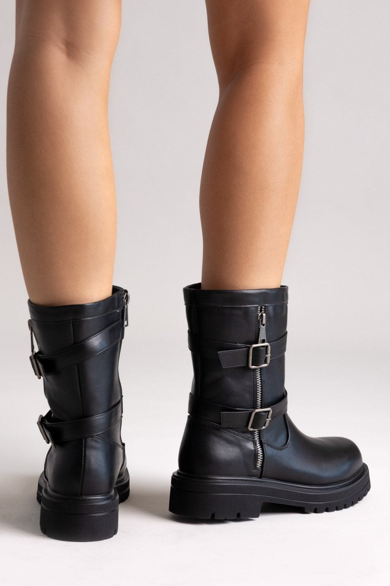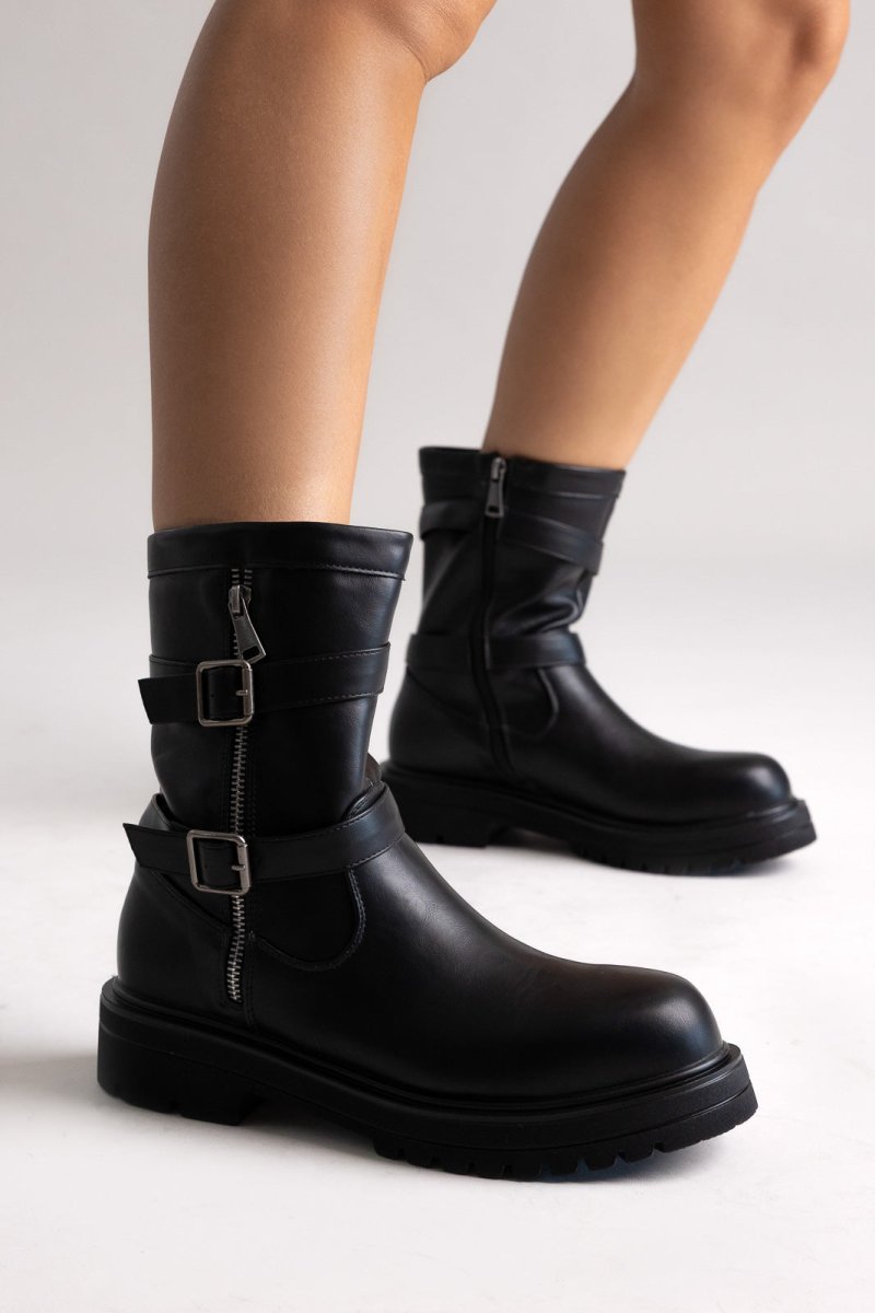 Edgy biker ankle boots with buckled straps and side zip. Secure fit, cushioned comfort, and a sleek profile crafted for modern style.