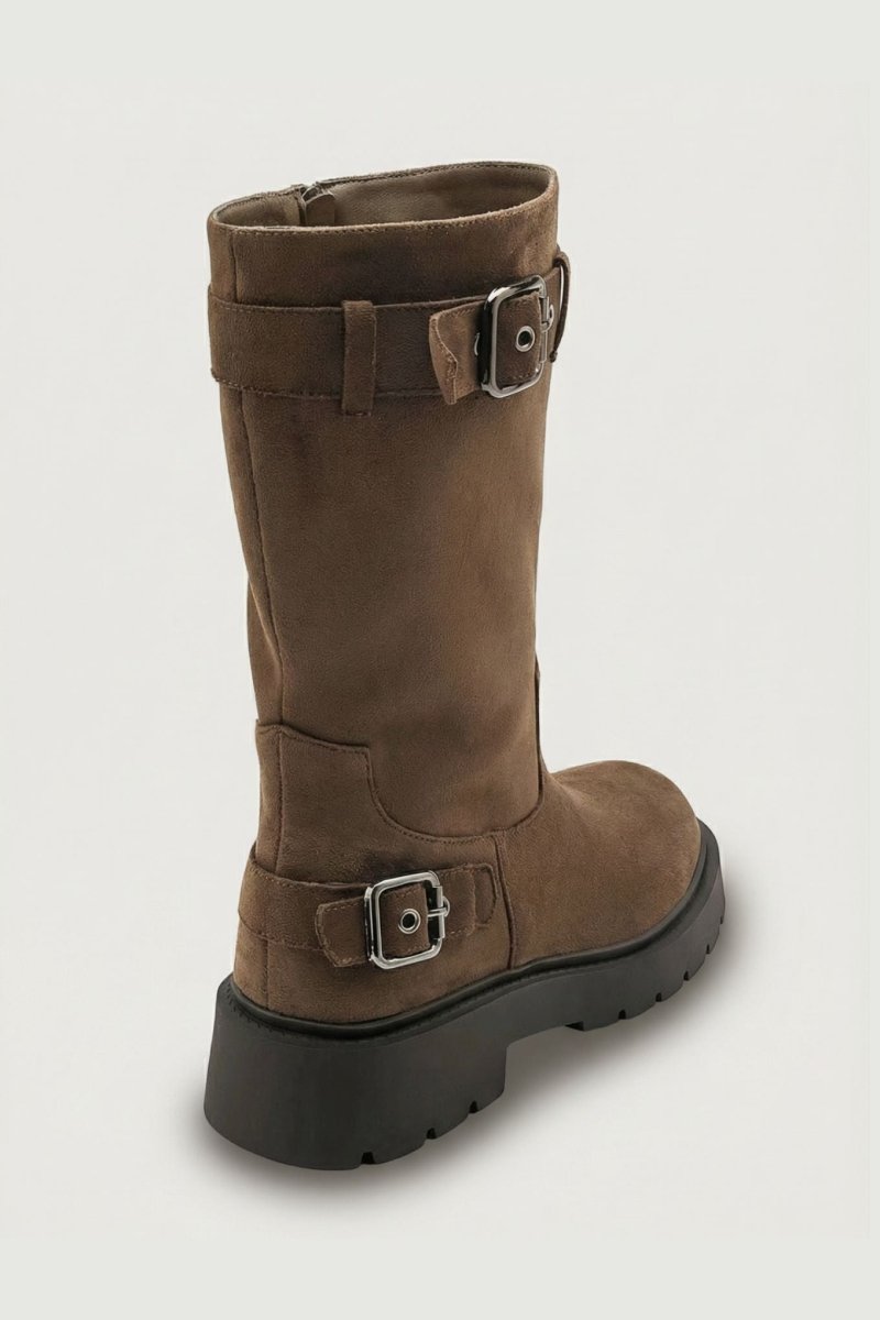 Suede biker boots with strap and buckle accents, mid calf height and easy side zip closure. A bold yet comfortable design crafted for modern everyday style.