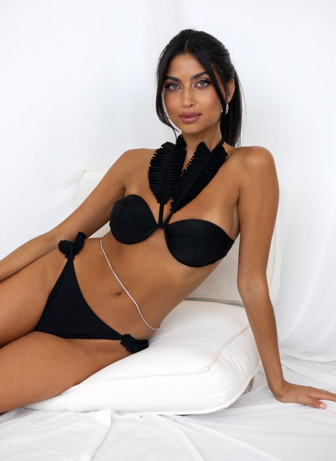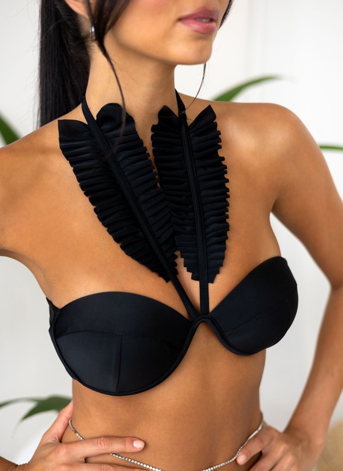 Bikini Set. Το τοπ έχει σταθερή ενίσχυση και μπανέλα. Halter δέσιμο με frilled κορδόνι με βολάν. Το σλιπ είναι mid waist με frilled βολάν στο πλάι. Πλήρης κάλυψη.