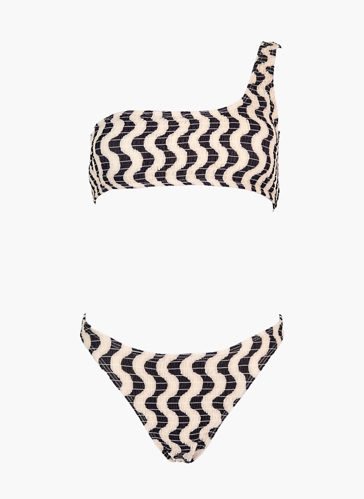 Σετ γκοφρέ μπικίνι. Το top έχει έναν ώμο και αποσπώμενη ενίσχυση. Δένει πίσω στην πλάτη. Το σλιπ είναι ψηλόμεσο. Print με γραμμές. Μέτρια κάλυψη.