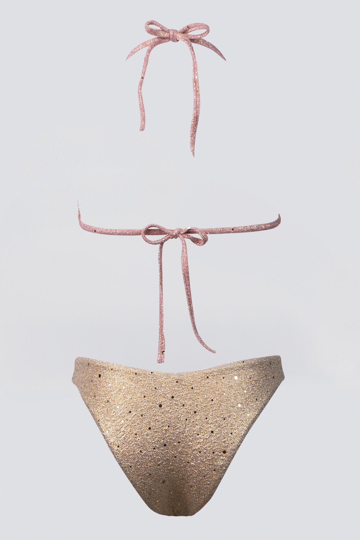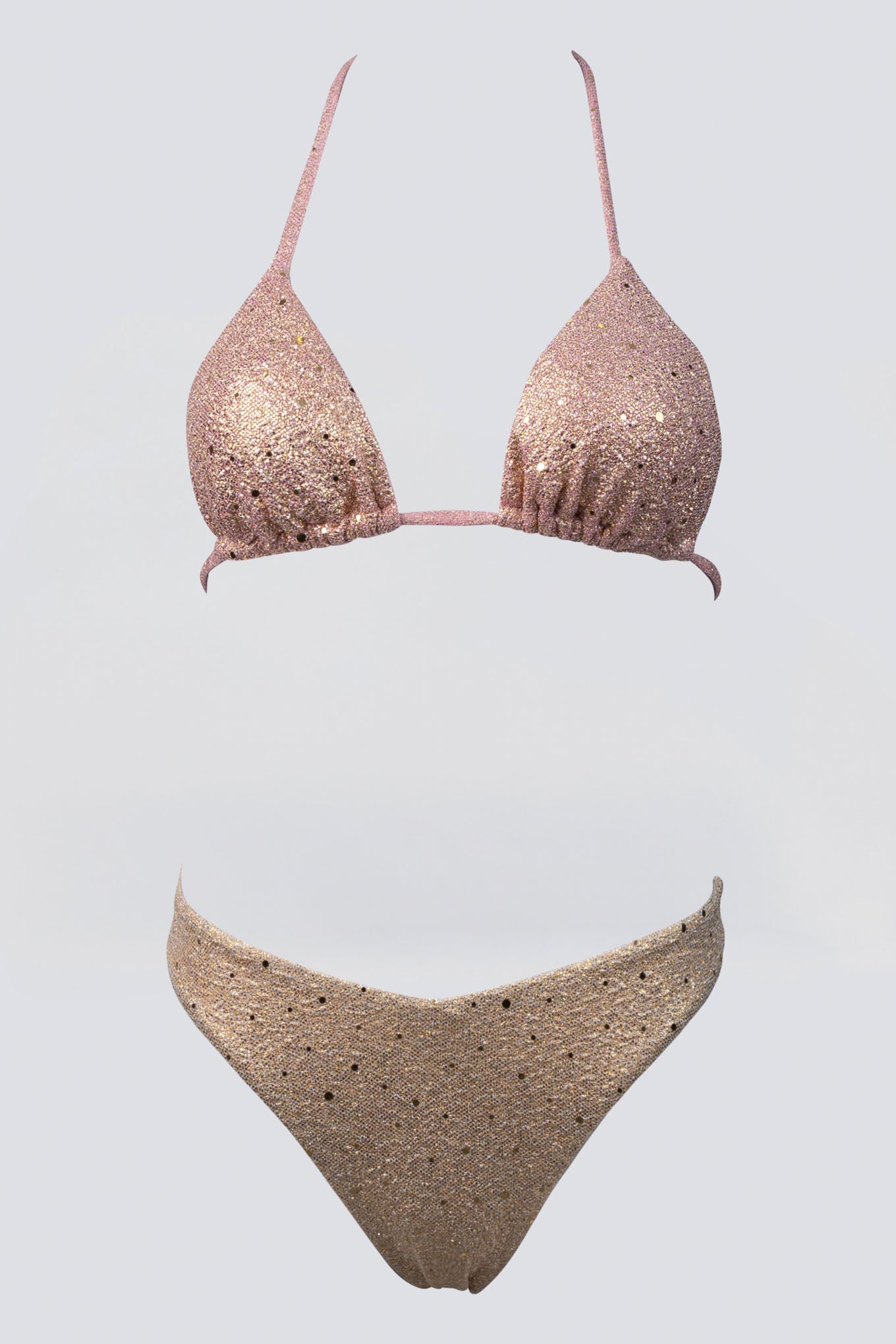 Bikini set γυαλιστερό . Το τοπ είναι τριγωνάκι με αποσπώμενη ενίσχυση. Δένει με κορδόνια. Το σλιπ είναι ψηλόμεσο με v cut στη μπροστινή πλευρά. Μέτρια κάλυψη.