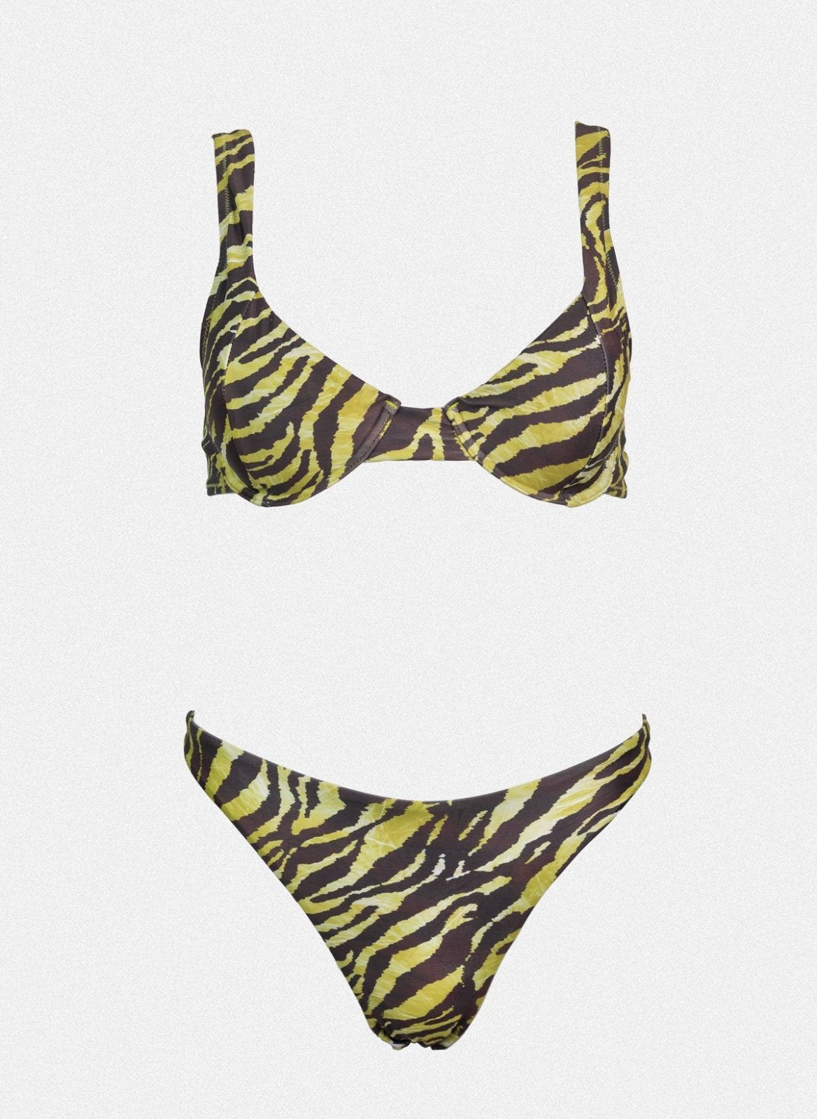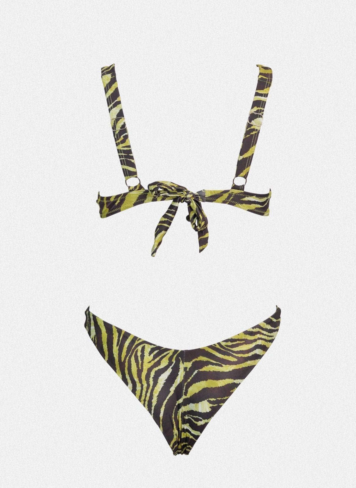 Μπικινι σετ με brazilian slip.Το τοπ έχει μπανέλα και αποσπώμενη ενίσχυση. Τιράντες που αυξομειώνονται. Δένει πίσω στην πλάτη. Animal print ύφασμα.