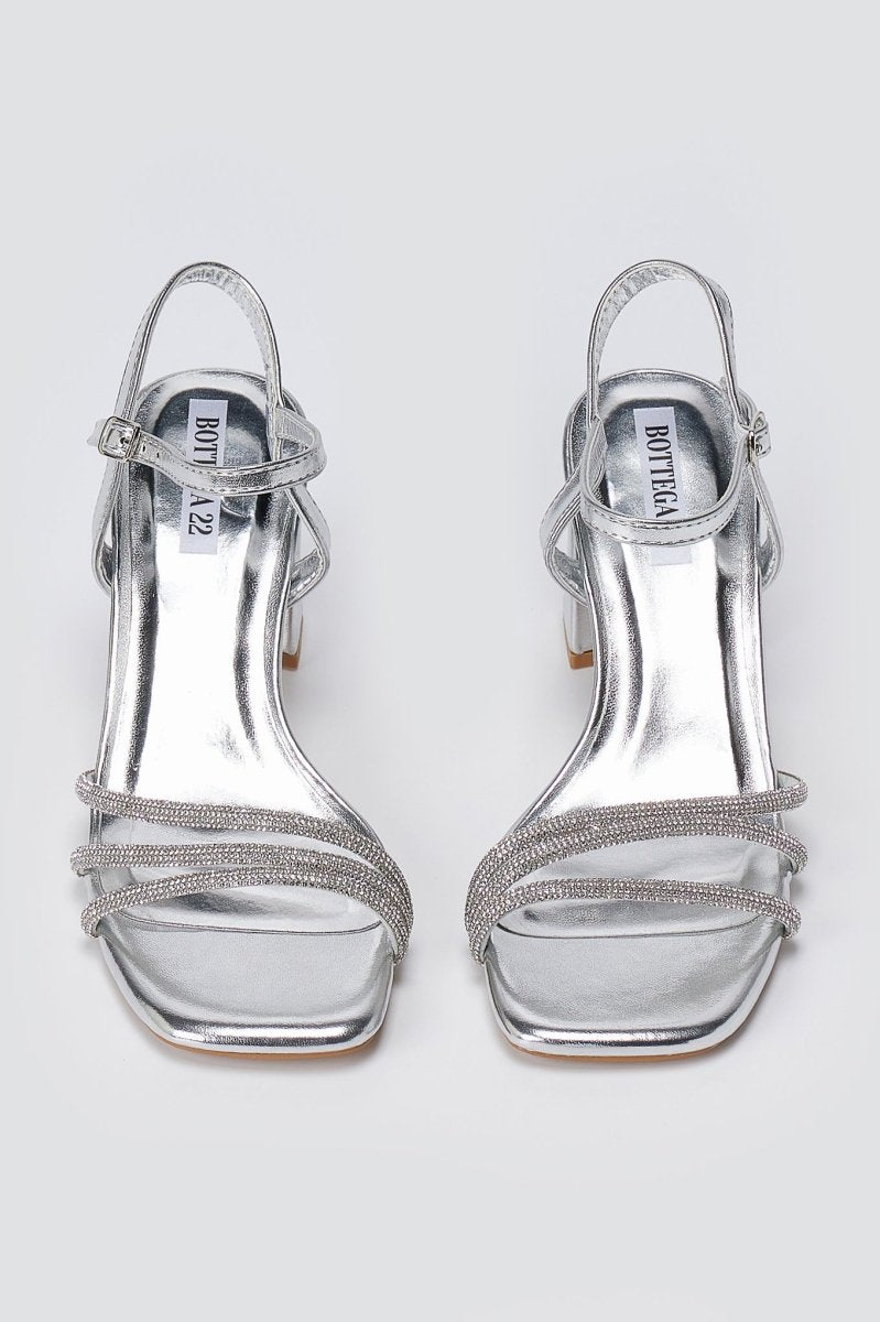 The BOTEGGA 22 Block Heel Sandals in Silver Metallic combine sophisticated style with everyday comfort. These elegant sandals feature delicate rhinestone-embellished straps that catch the light beautifully, paired with a sturdy block heel that provides reliable support. The adjustable ankle strap ensures a secure fit, making these versatile sandals perfect for transitioning seamlessly from daytime activities to evening occasions.