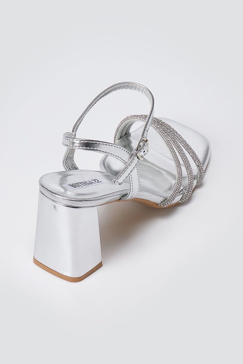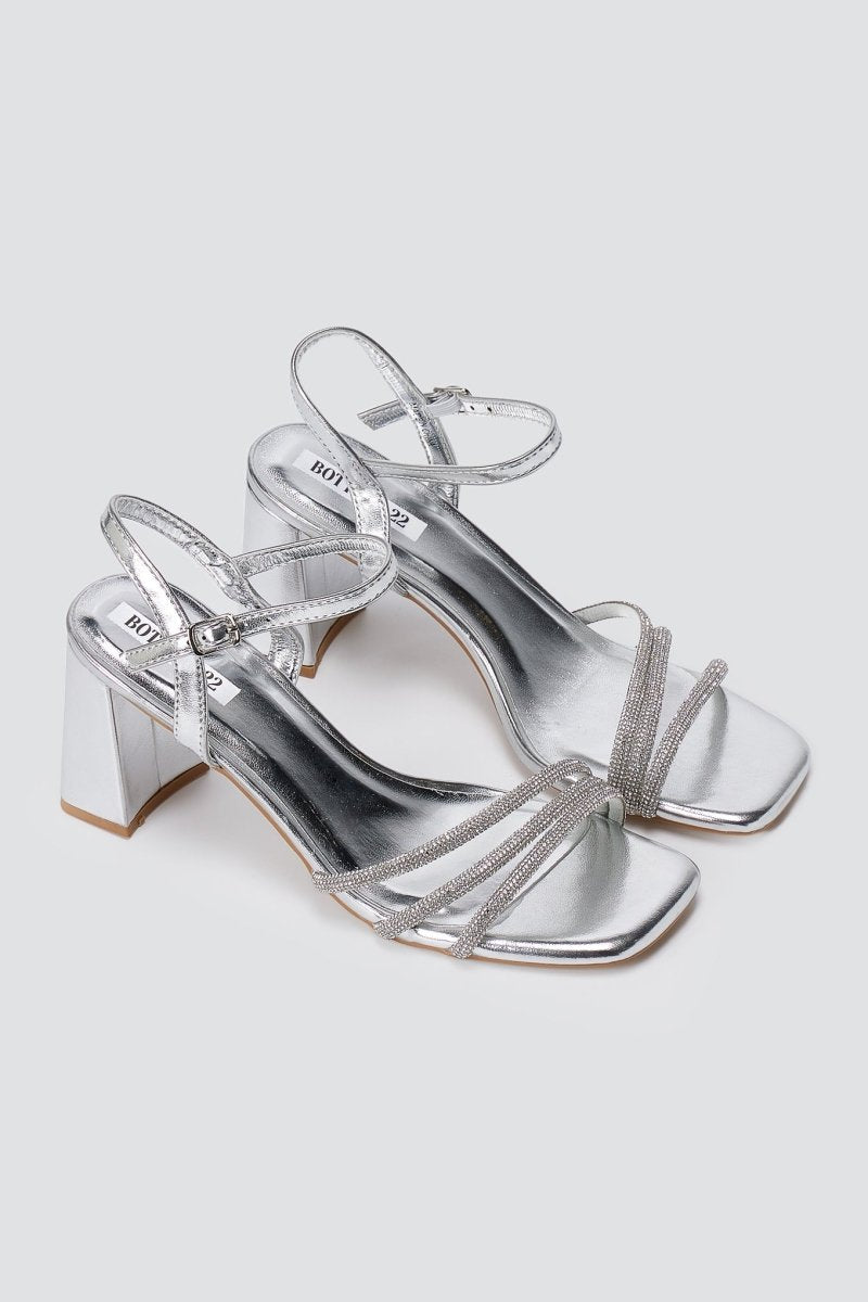 Block Heel Sandals Rhinestone Straps - Silver Metallic