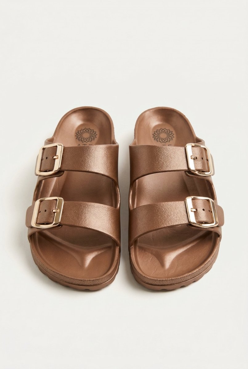 The ATENEO Buckle Slides Anatomical Footbed in Bronze combines style with comfort for the perfect warm-weather footwear. Featuring distinctive wide buckle straps and a supportive anatomical footbed, these beach slides deliver relaxed elegance for holidays and everyday wear. Designed for effortless slip-on convenience, they're the ideal choice for those seeking functional summer sandals that don't compromise on comfort.