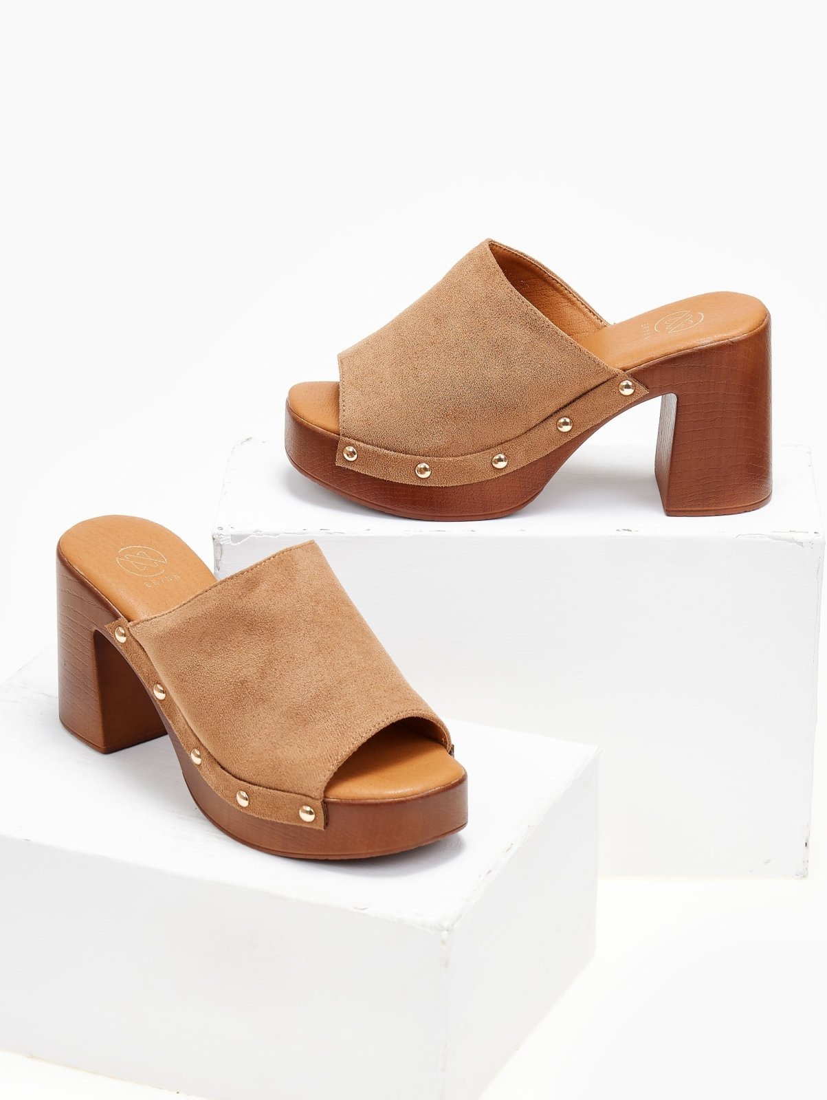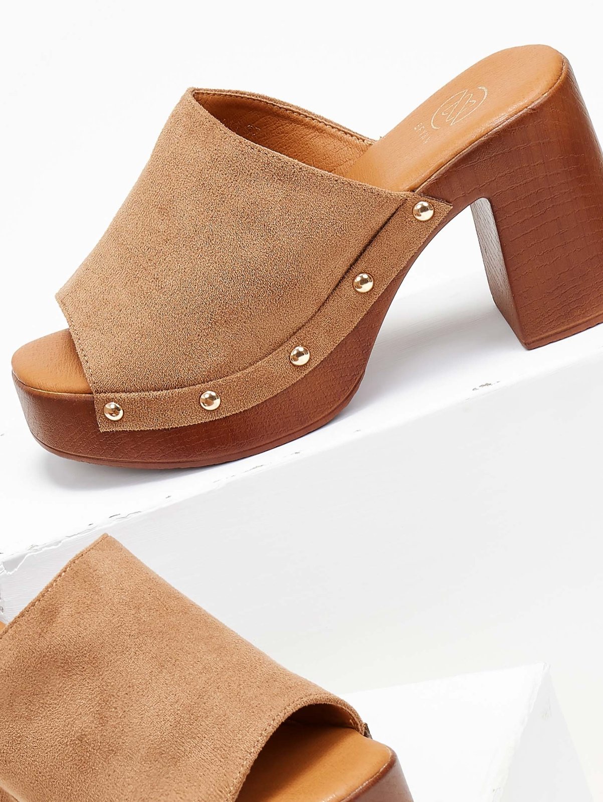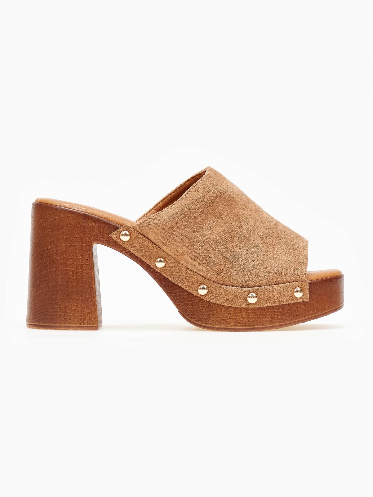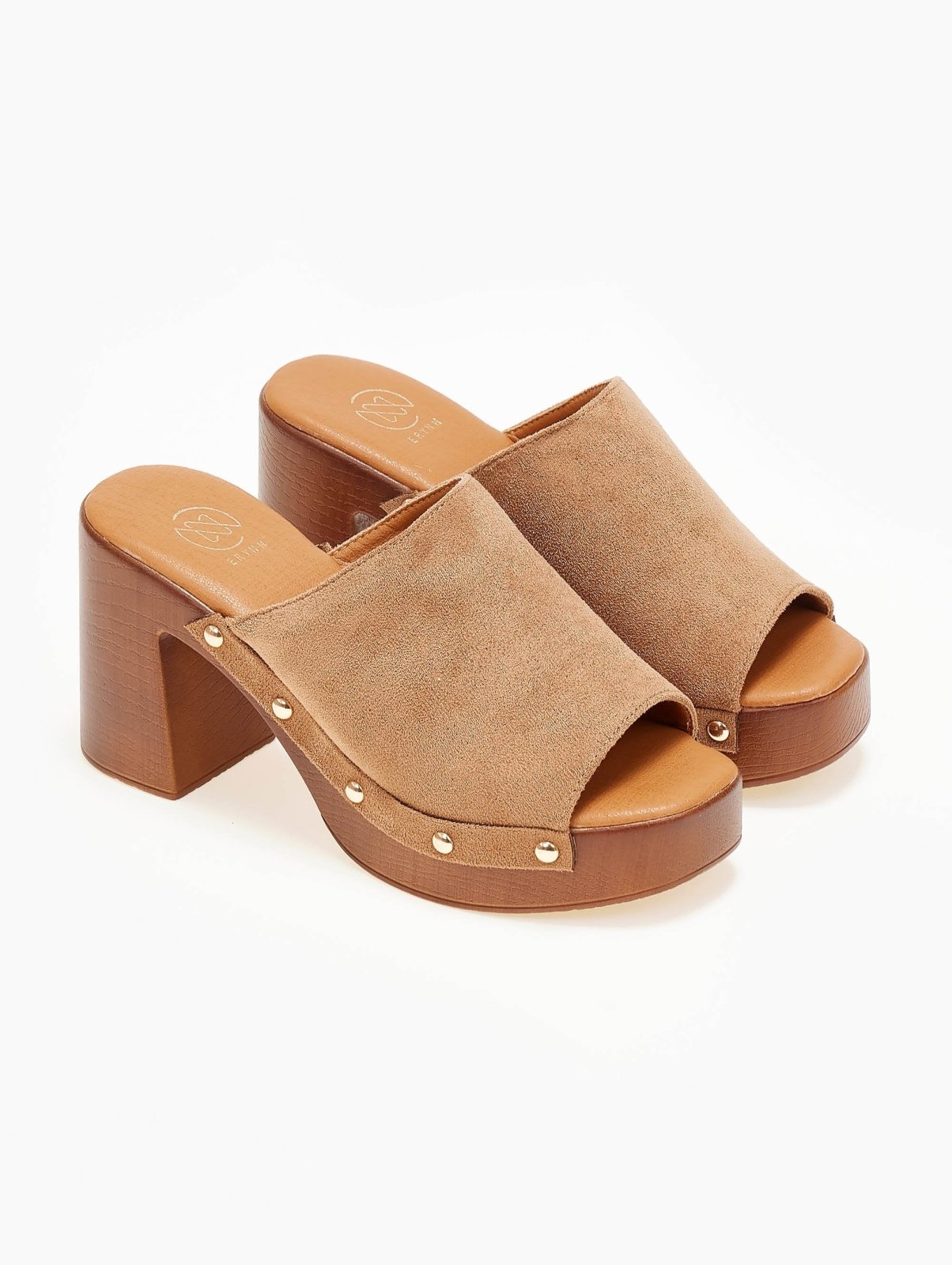 Clogs suede με φαρδιά φάσα Erynn. Έχουν εφέ ξύλινη σόλα και τακούνι. Τρουκς σε μεταλλικό χρώμα. Μαλακός πάτος με ενίσχυση.