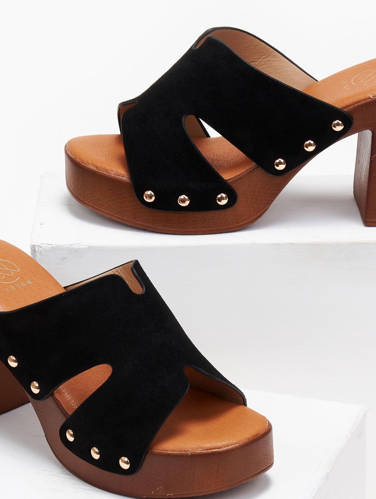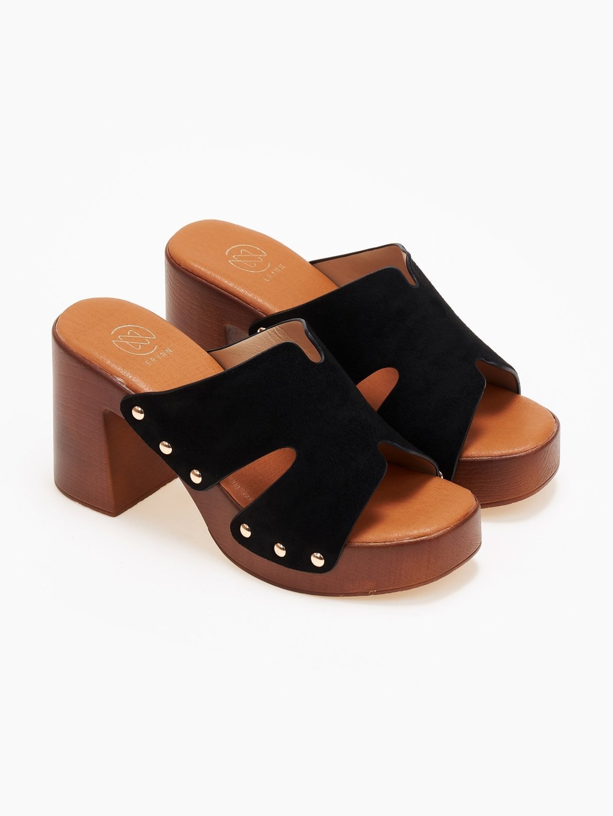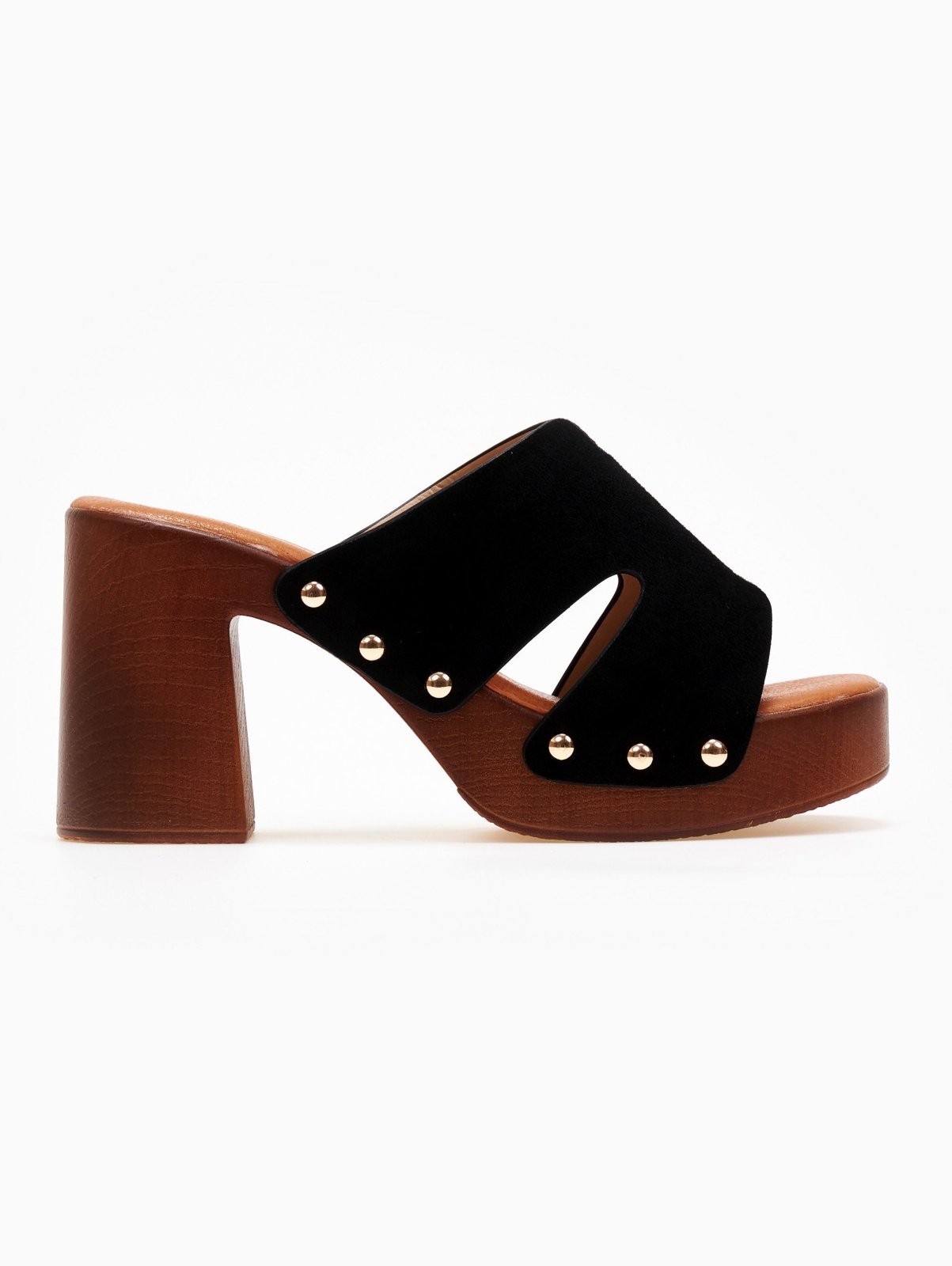 Clogs suede ανοιχτά ERYNN. Έχουν φαρδιά φάσα με ανοίγματα στο πλάι. Τρουκς σε μεταλλικό χρώμα στα πλαϊνά. Ψηλή σόλα με χοντρό τακούνι.