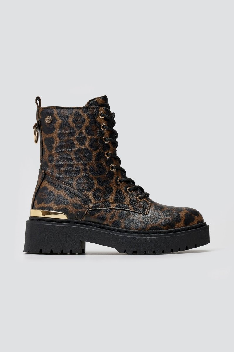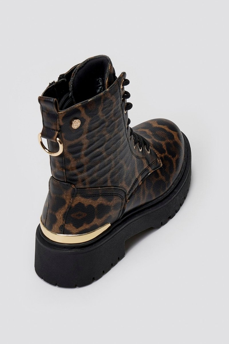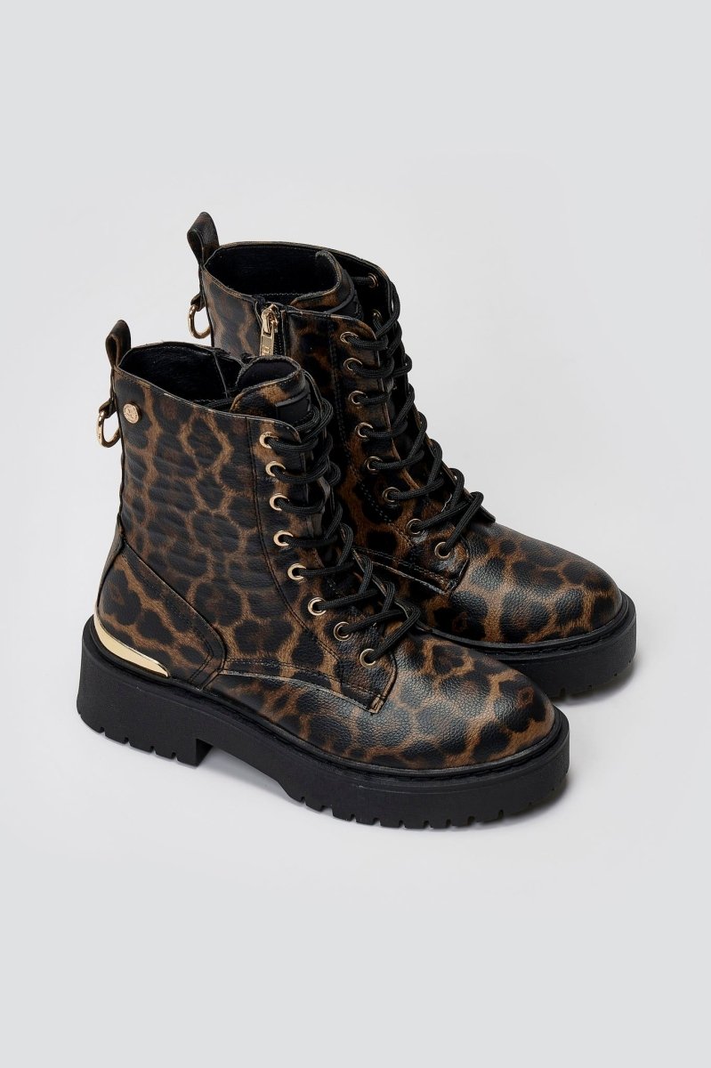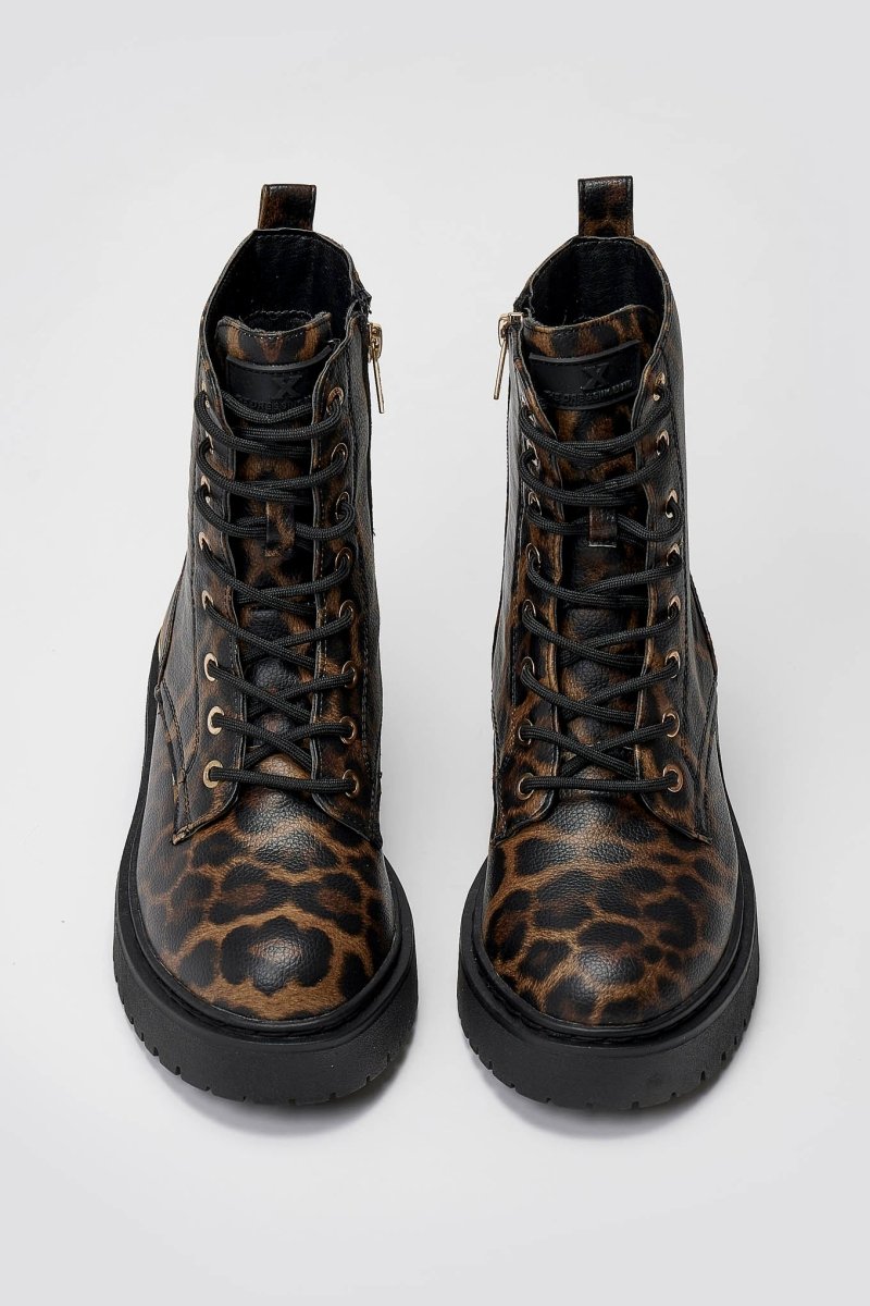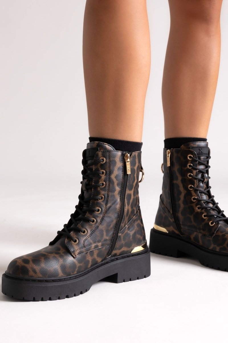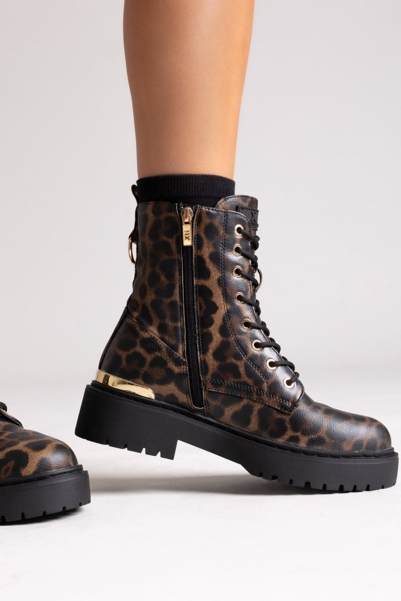Xti 144391 vegan combat boots with leopard print, side zipper, and suede memory foam insole. Comfort style, PETA approved.