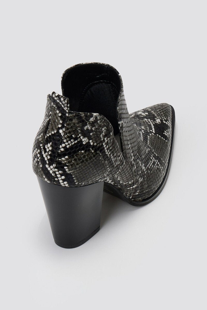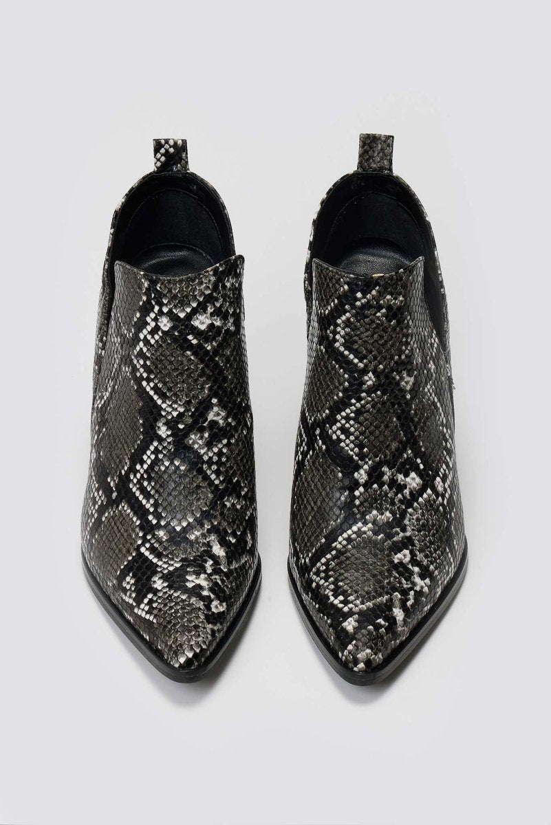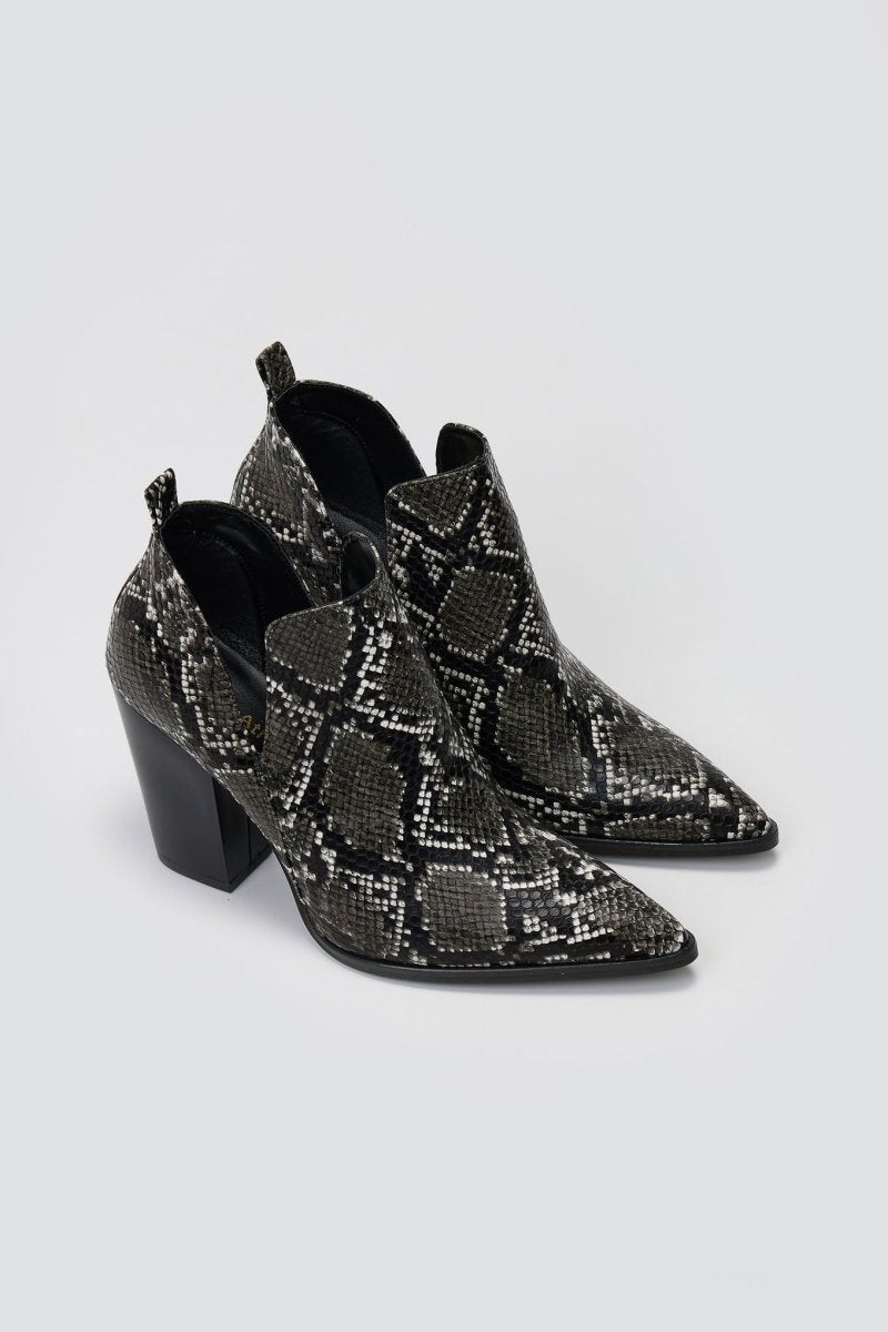 Pointed toe western ankle boots with bold snake print and side cutouts. Stable block heel and cushioned footbed blend striking style with comfort for modern women.