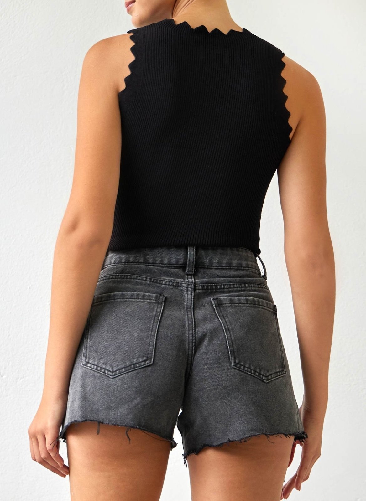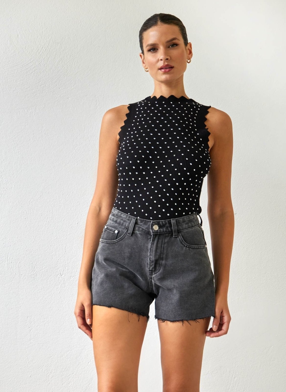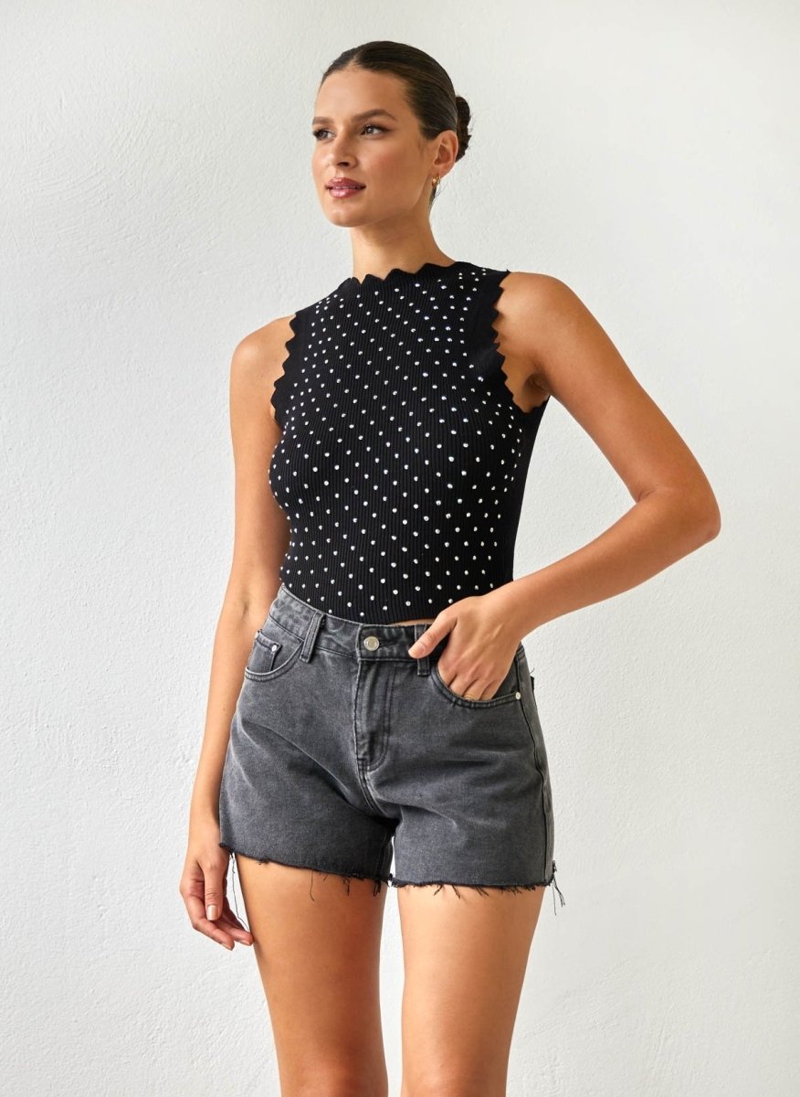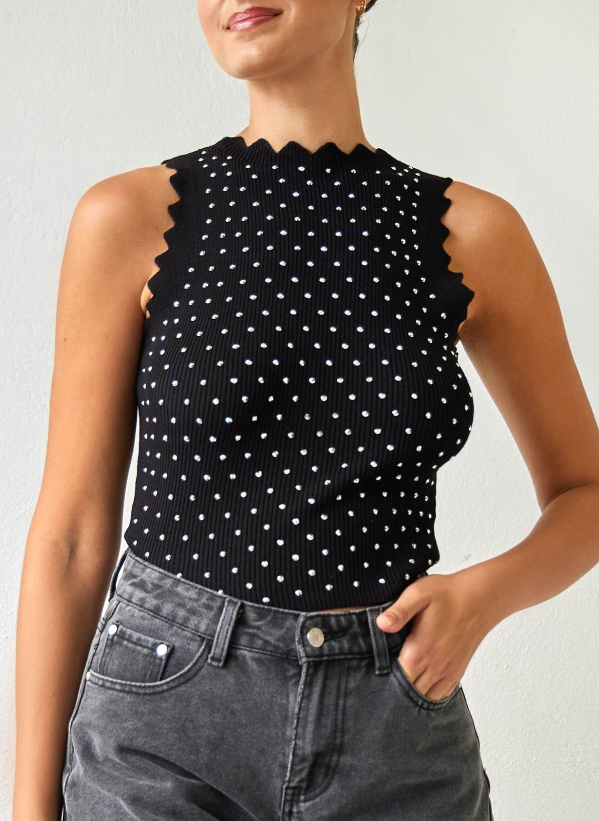Crop τοπ με ριμπ πλέξη. Έχει στρας στη μπροστινή πλευρά. Wavy τελείωμα στη λαμόκοψη και τους ώμους. Εφαρμοστή γραμμή.