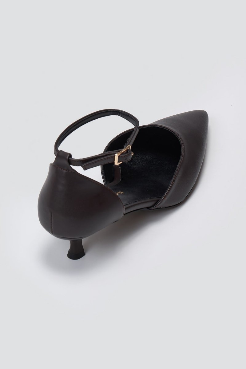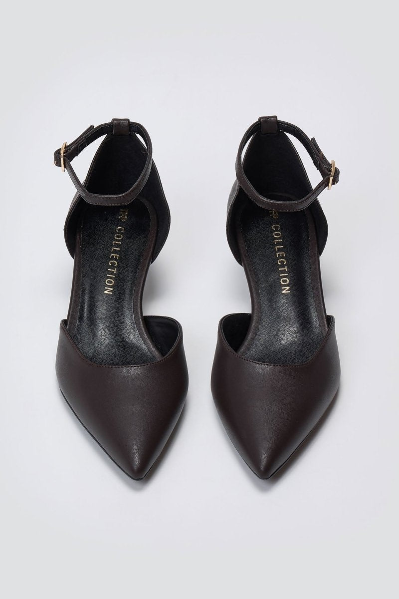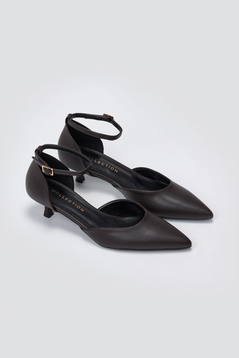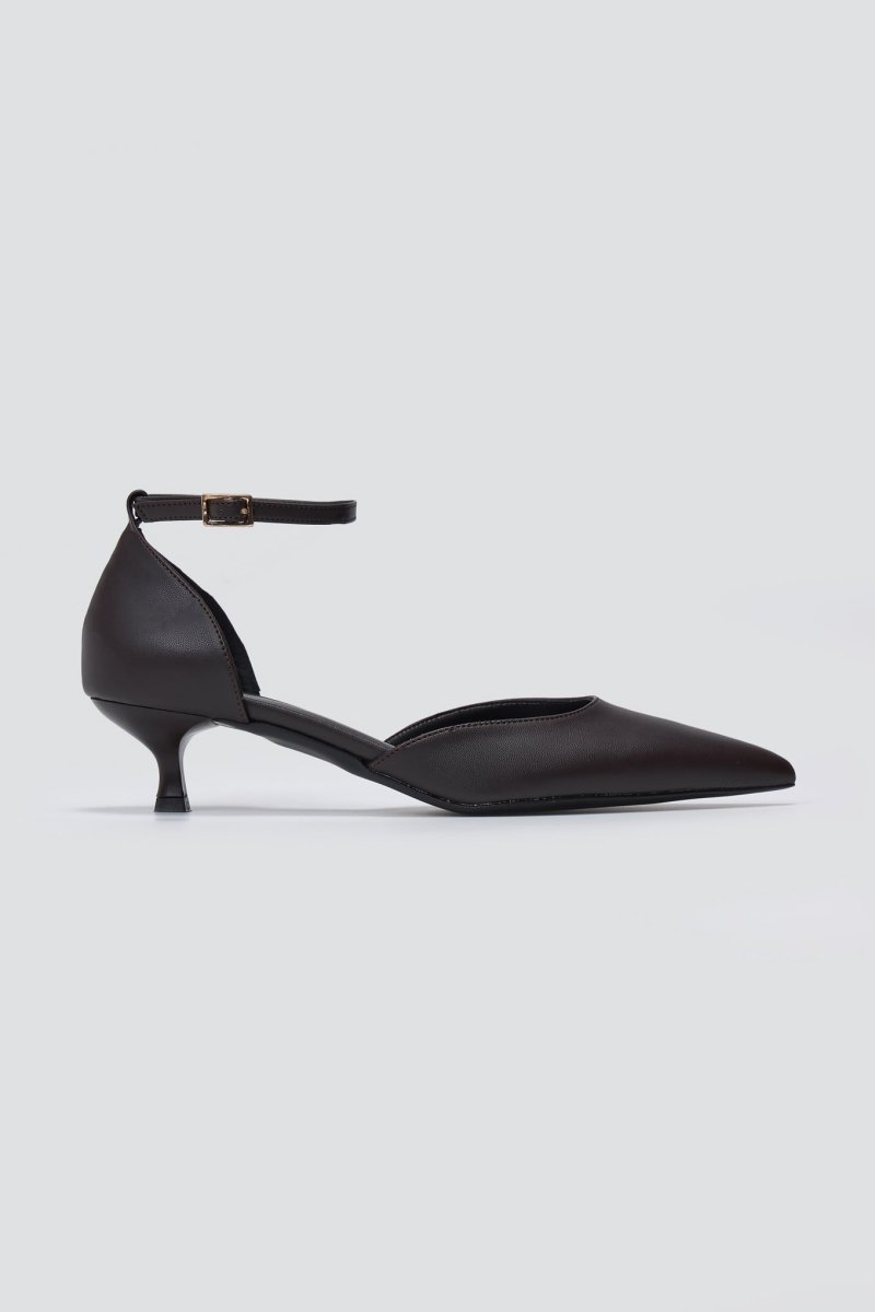 TFP cutout kitten heel pumps with a pointed toe. Ankle-strap fit, cushioned insole, elegant profile—versatile heels crafted for every occasion.