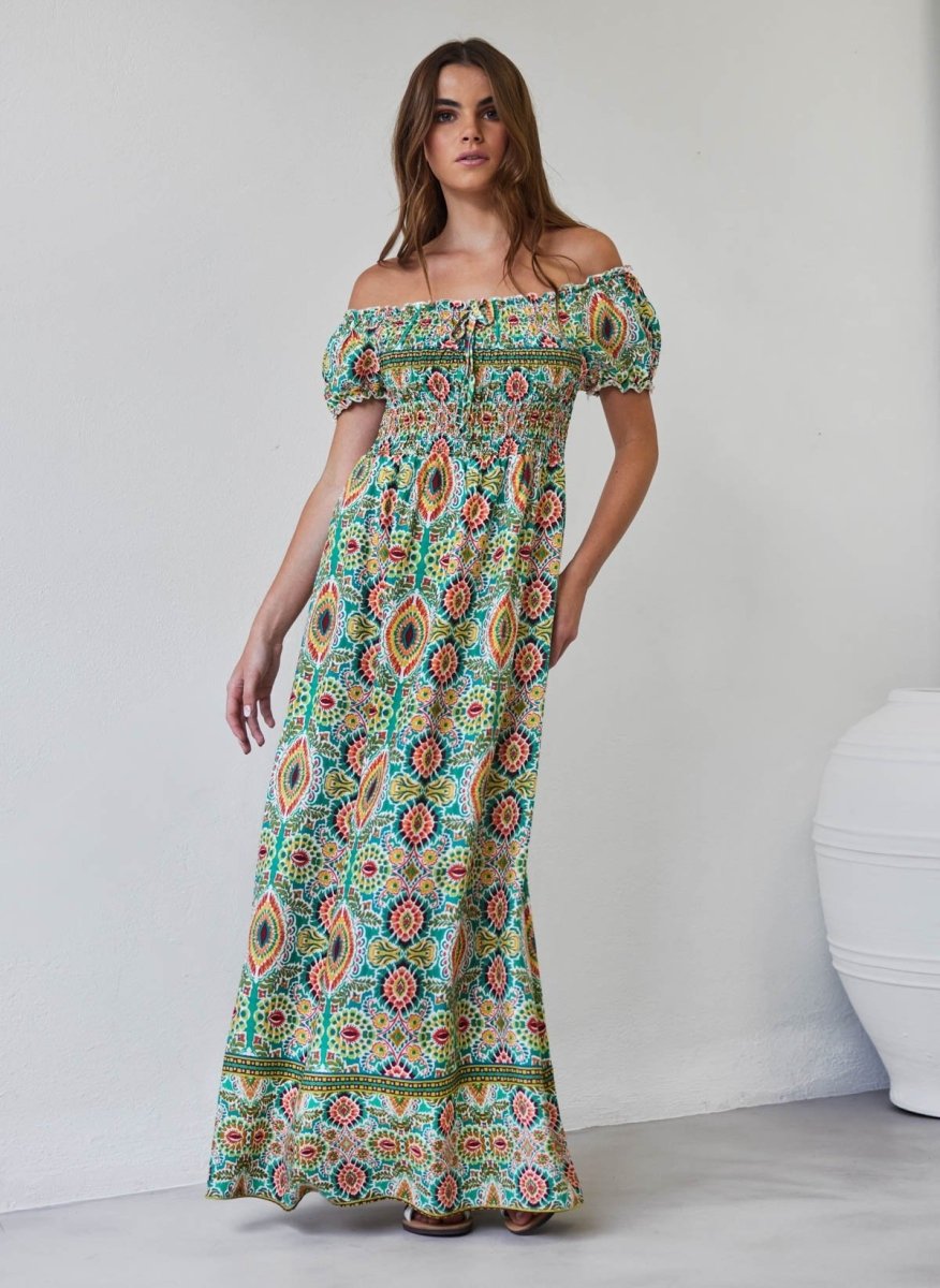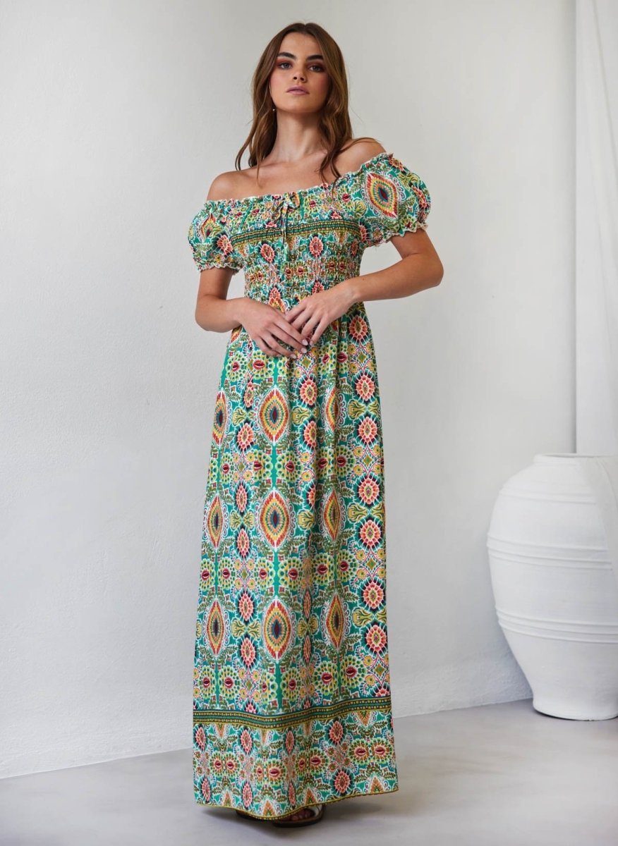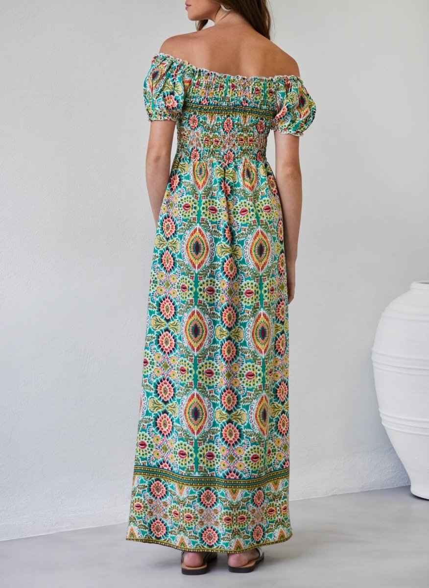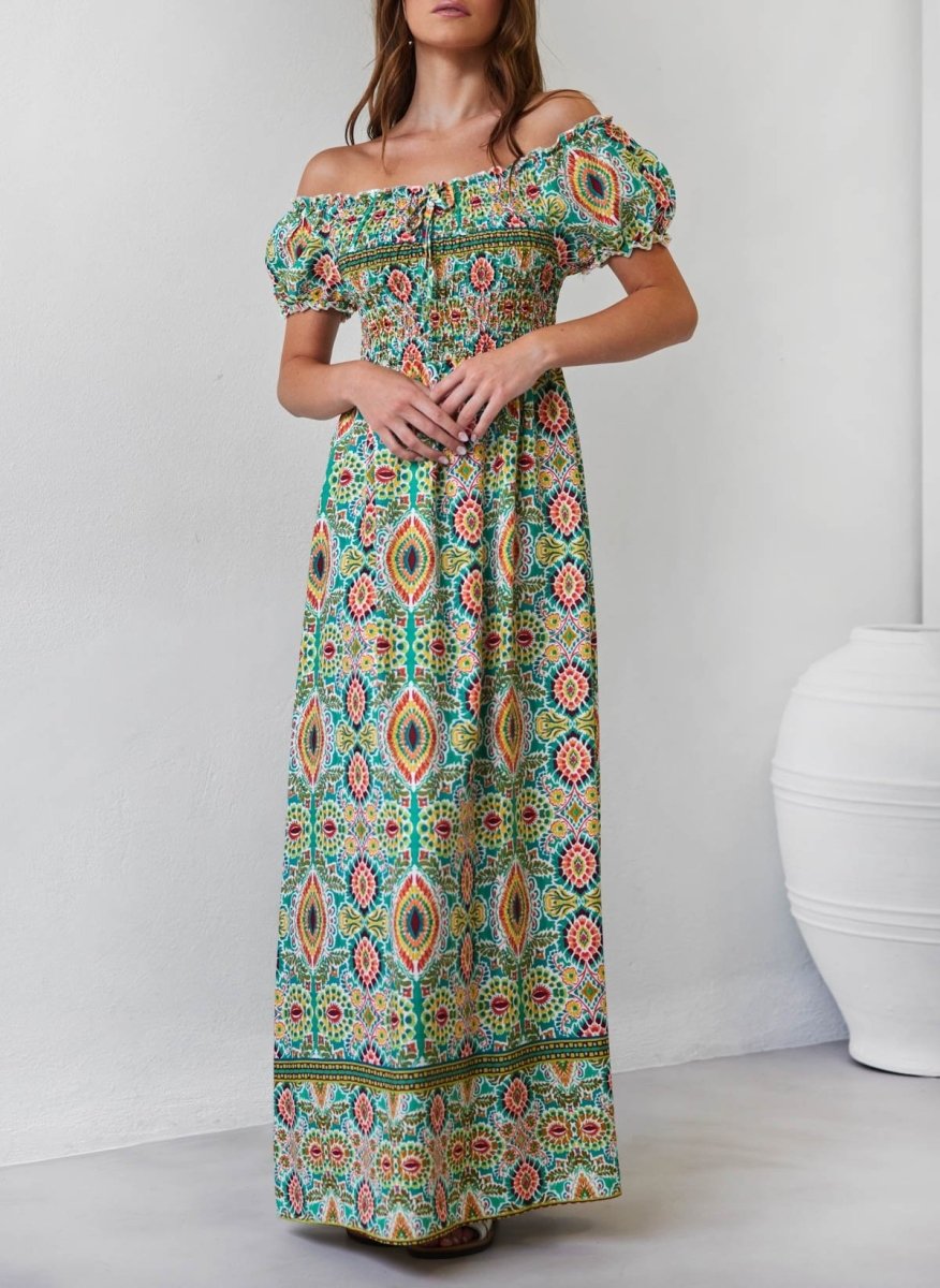 Φόρεμα μάξι με εμπριμέ σχέδιο σε συνδυαμούς χρωμάτων. Έχει frilled ελαστική μπάσκα κάτω από το μπούστο. Ανοιχτή λαιμόκοψη με λάστιχο. Φουσκωτά μανίκια.