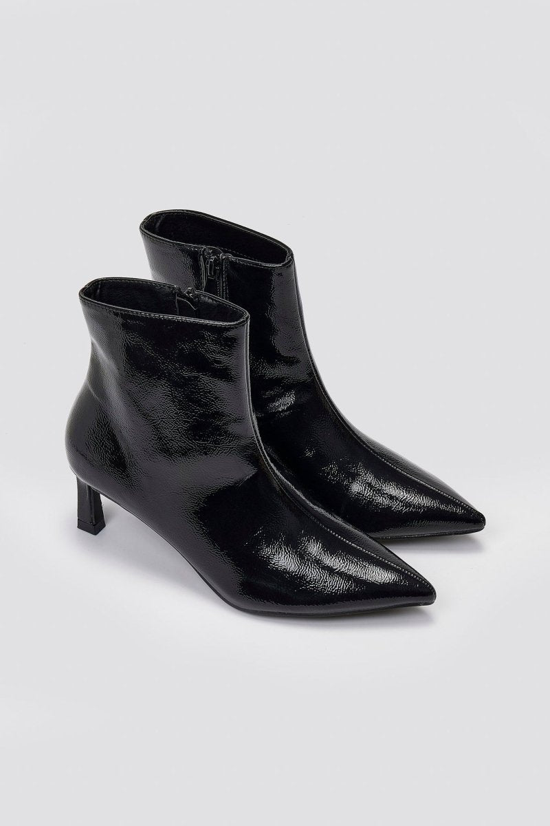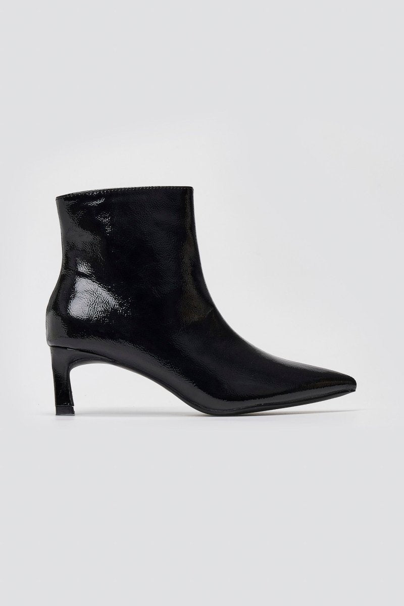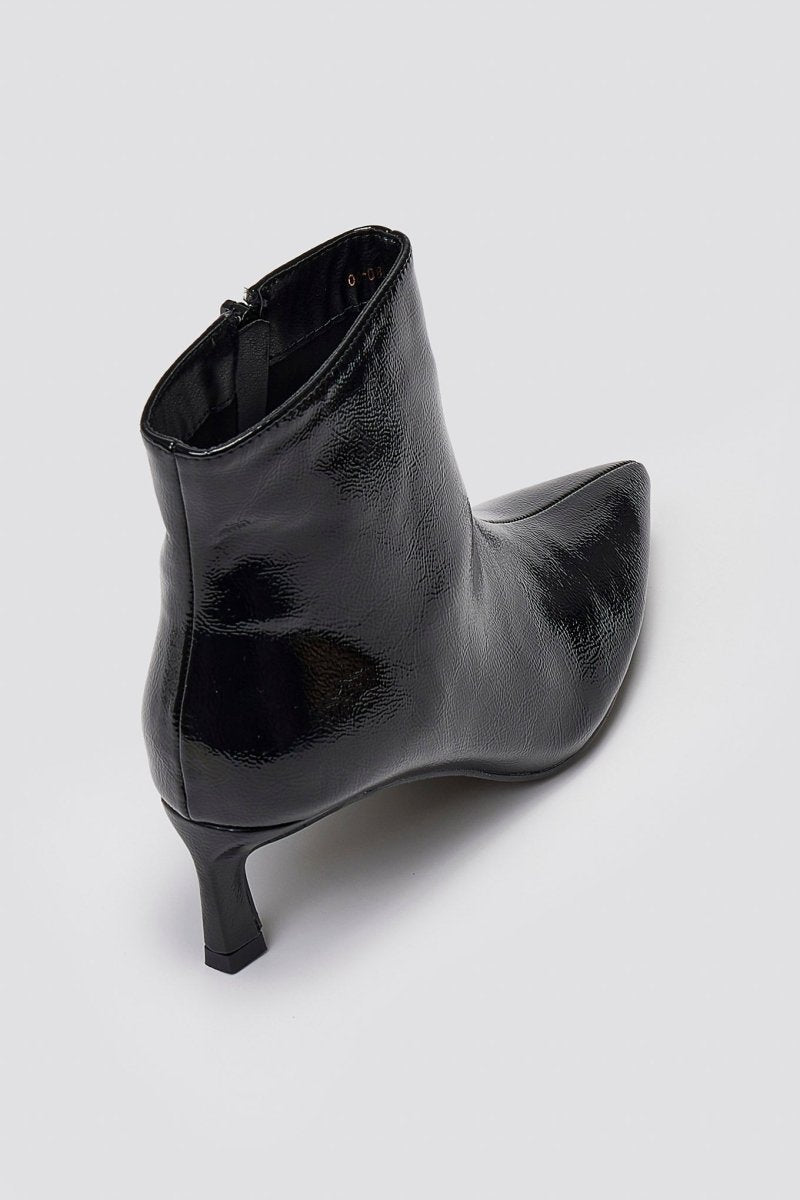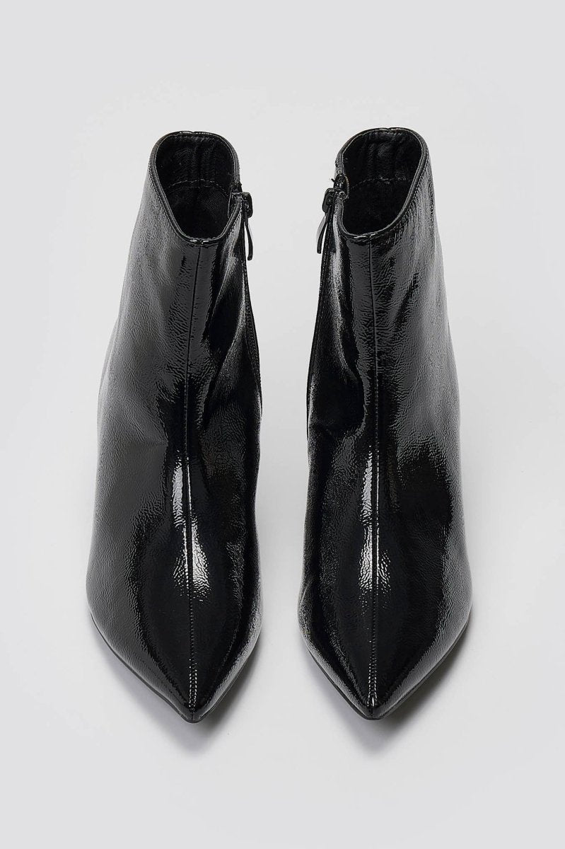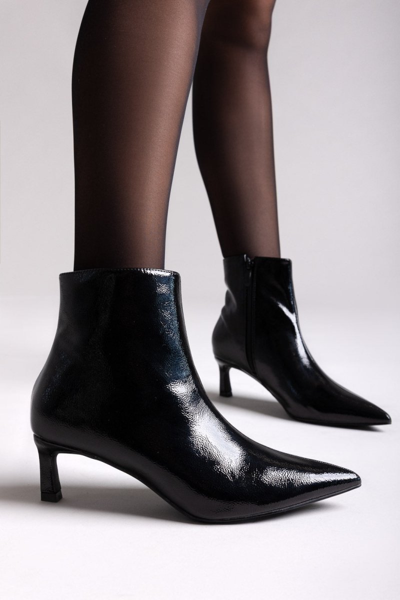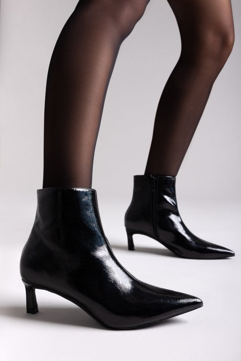 ERYNN Pointed Patent Ankle Boots with Low Heel - Black Crinkled Patent