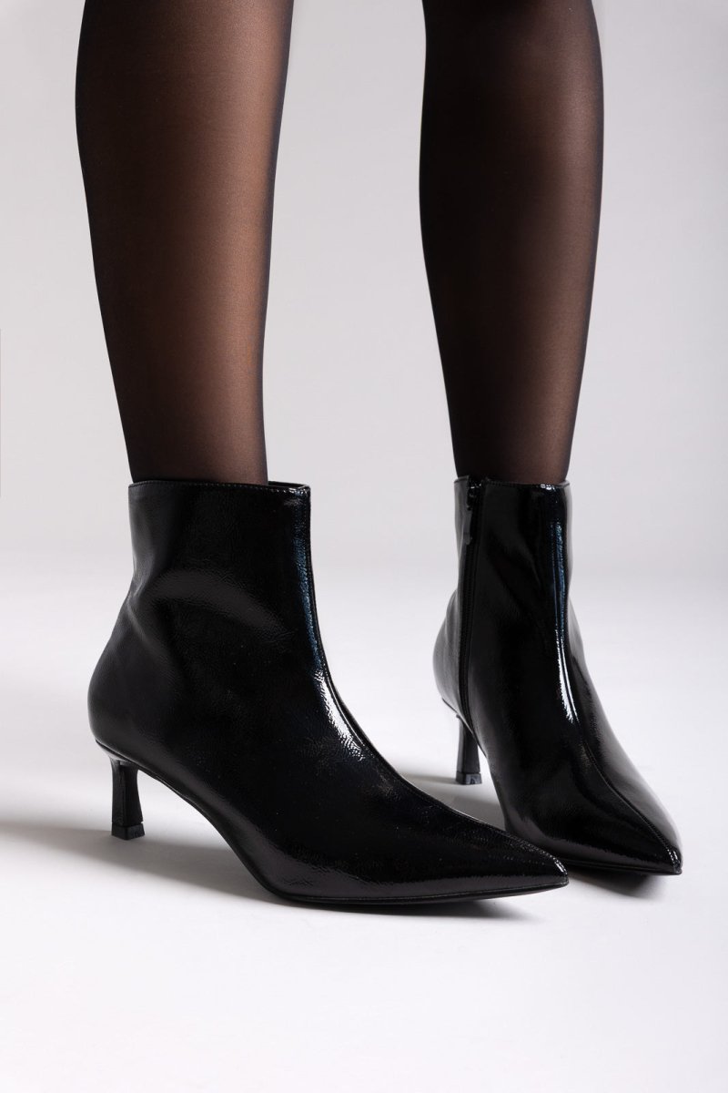ERYNN pointed ankle boots in glossy patent finish with slim low heel and side zipper. Elegant design with a modern glossy touch
