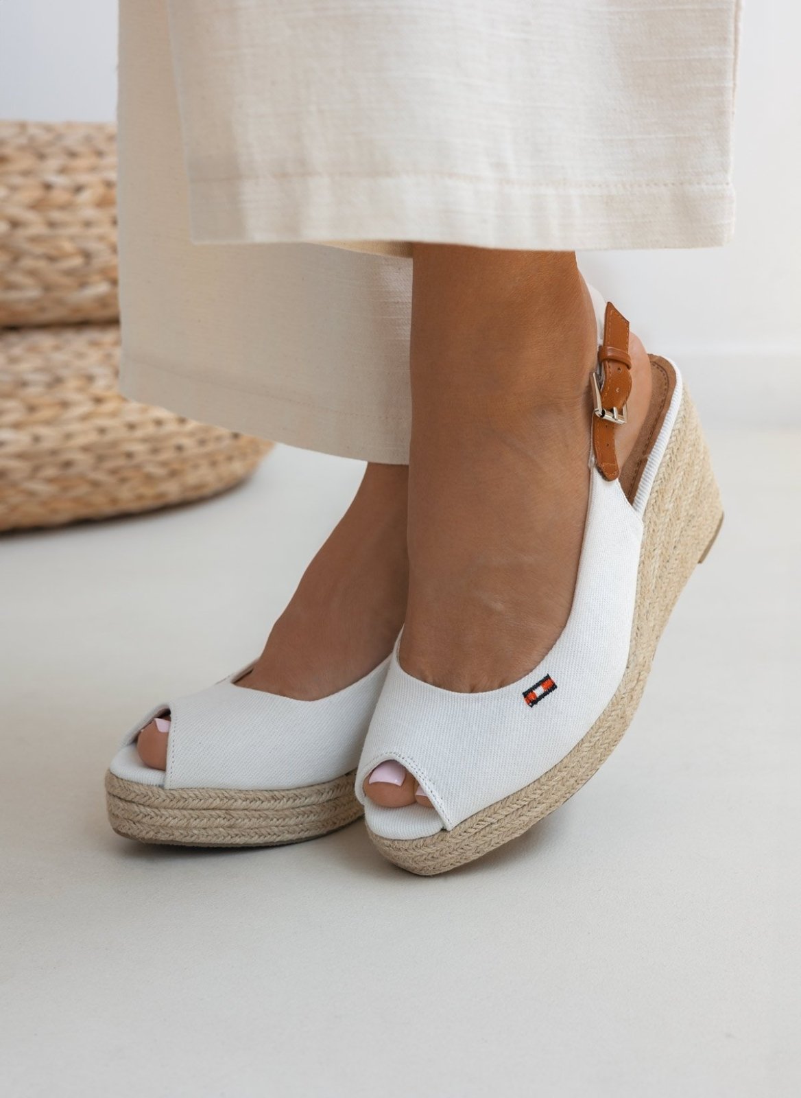 Εσπαντρίγιες platforms με ανοιχτή φτέρνα. Άνοιγμα peep toe στα δάκτυλα. Δένουν στο πλάι με διακριτικό μεταλλικό τοκά. Έχουν ελαστικό τμήμα στο κούμπωμα για καλύτερη εφαρμογή. Μαλακός πάτος με ενίσχυση. Σόλα ντυμένη με σχοινί.