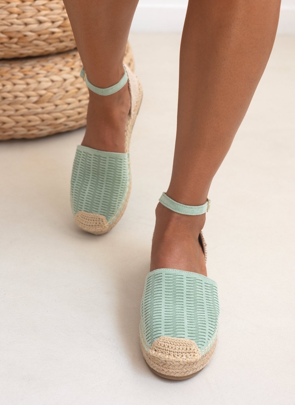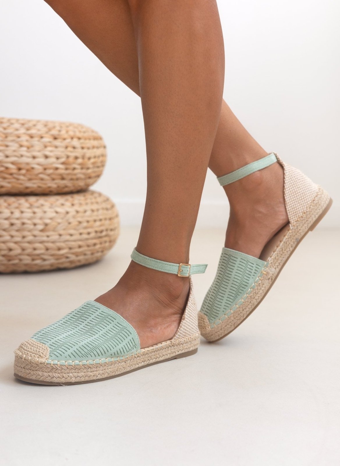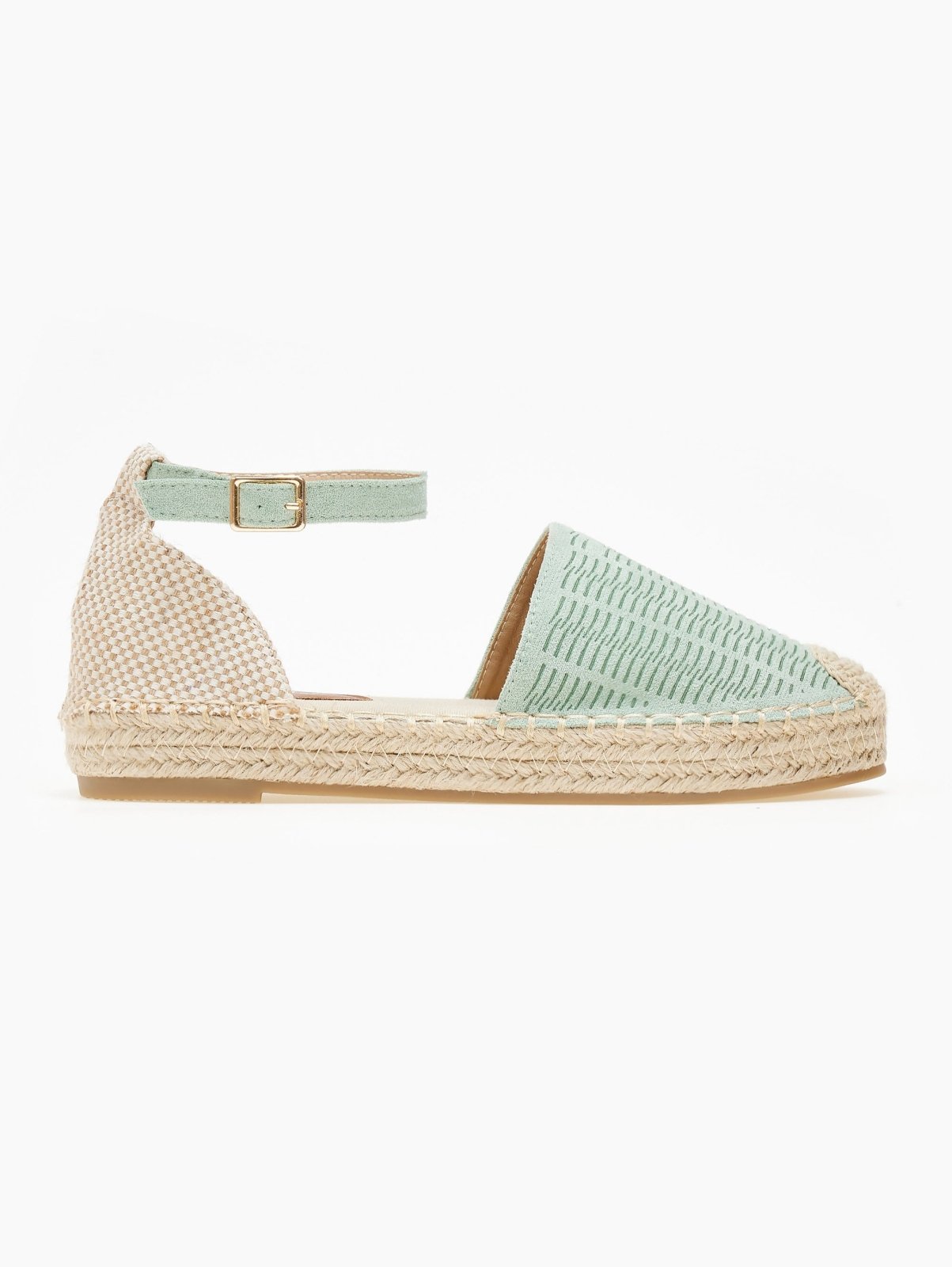 Εσπαντρίγιες suede με ανάγλυφο σχέδιο. Έχουν ανοιχτά πλαϊνά. Κλειστή φτέρνα. Δένουν με μπαρέτα στο ύψος του αστραγάλου.