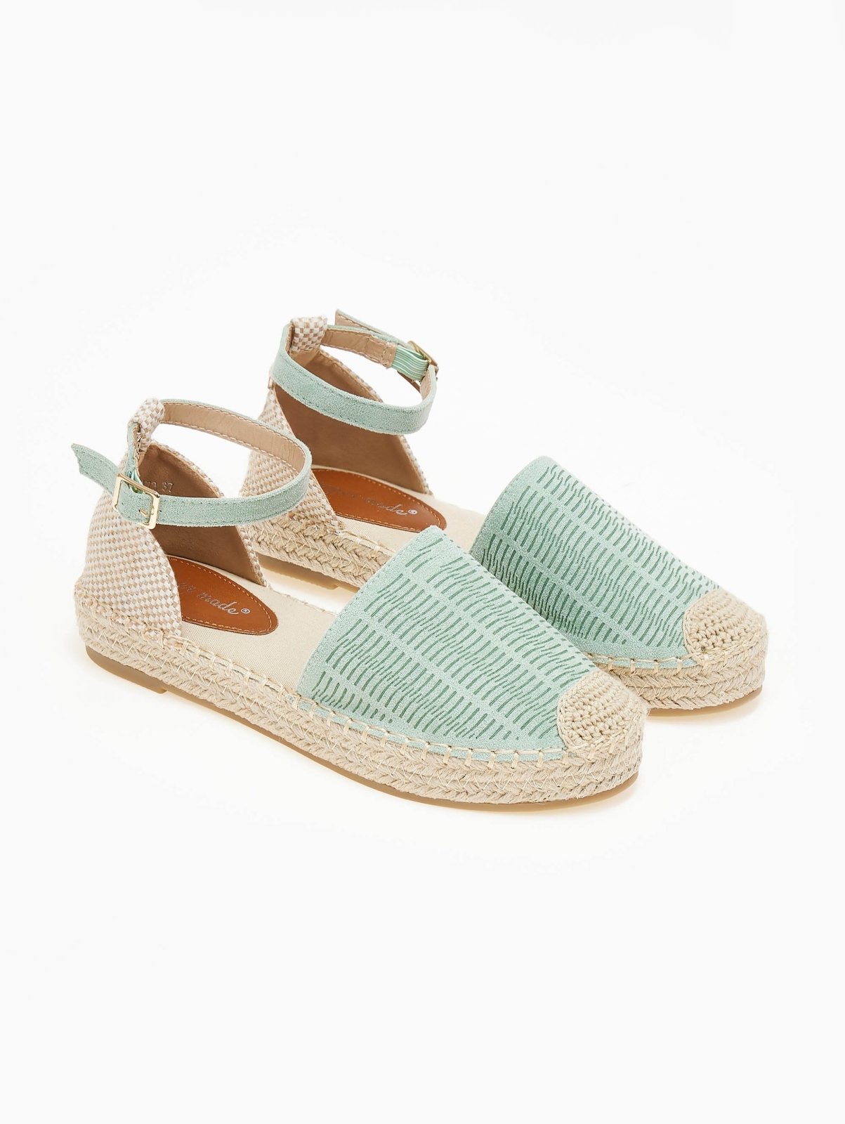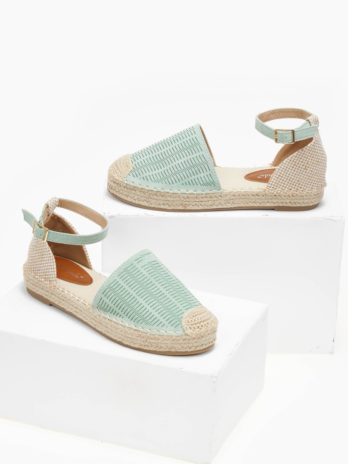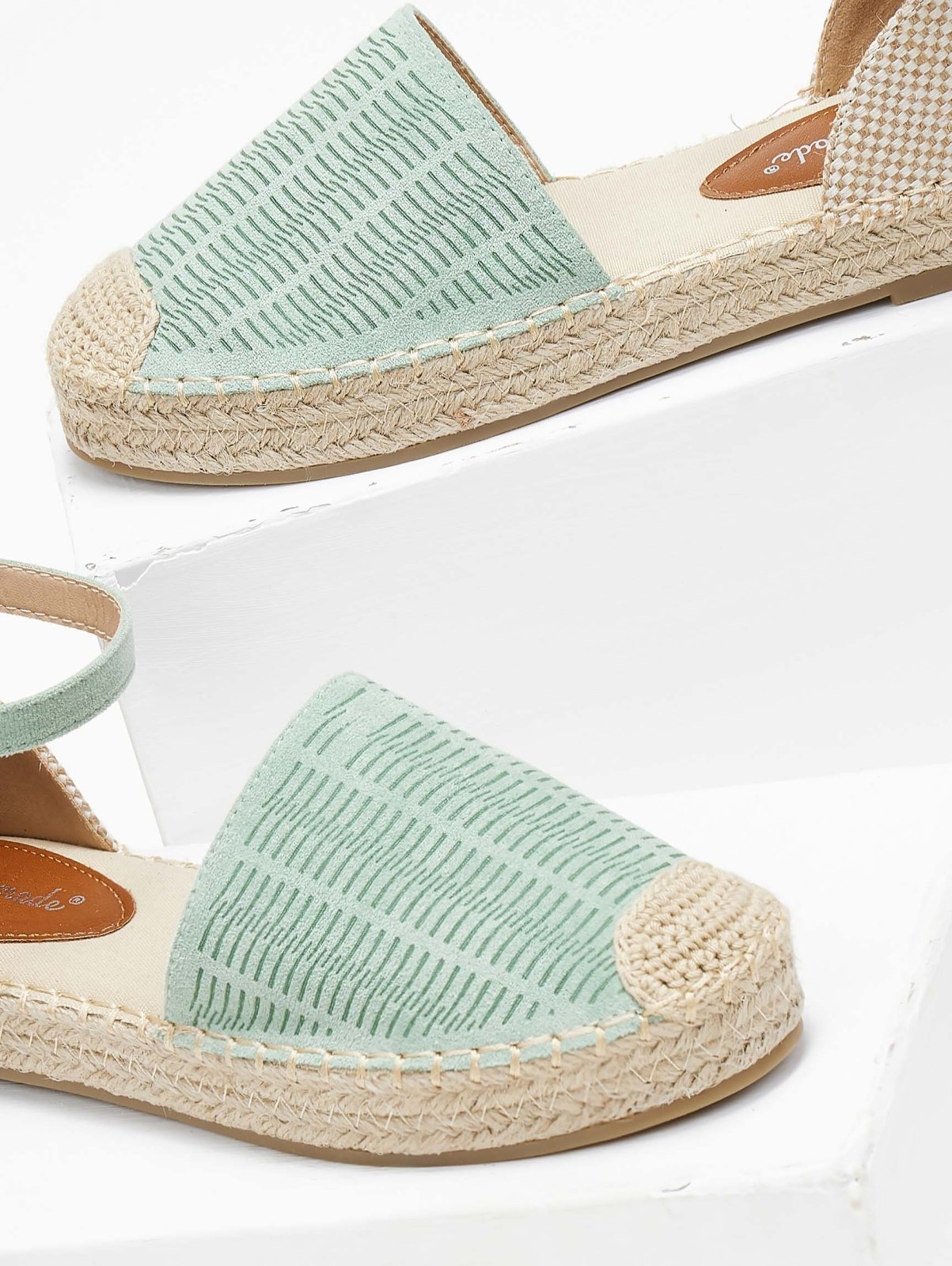 Εσπαντρίγιες suede με ανάγλυφο σχέδιο. Έχουν ανοιχτά πλαϊνά. Κλειστή φτέρνα. Δένουν με μπαρέτα στο ύψος του αστραγάλου.