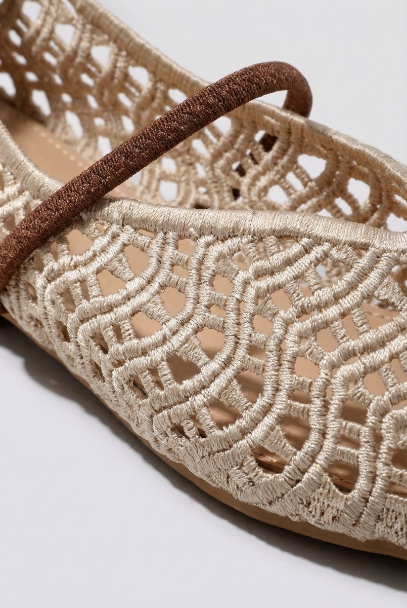 Flat ballet flats with a woven perforated design and elegant V cut at the toe. Finished with a slim instep strap for a secure fit. Lightweight style crafted for modern women.