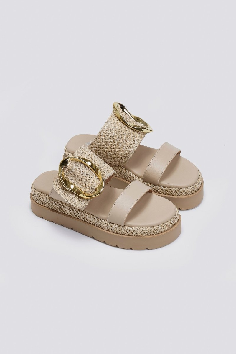 Flatfforms σανδάλια Mariella Fabiani. Φαρδιά φάσα με velcro αυτοκόλλητο και ελαστικό τμήμα για καλύτερη εφαρμογή. Oversized μεταλλικός τοκάς. Μαλακός πάτος με ενίσχυση. Λεπτομέρεια ψάθα στη σόλα.
