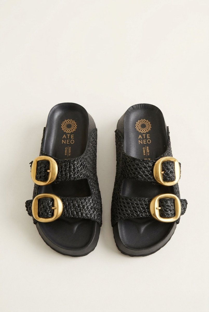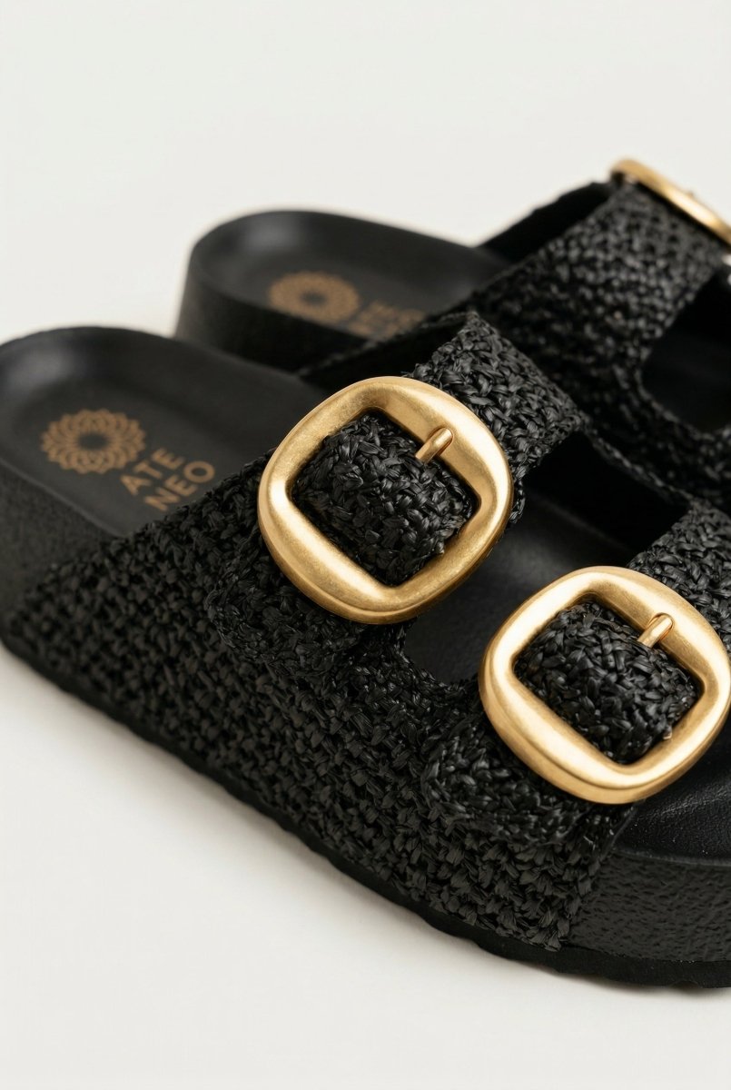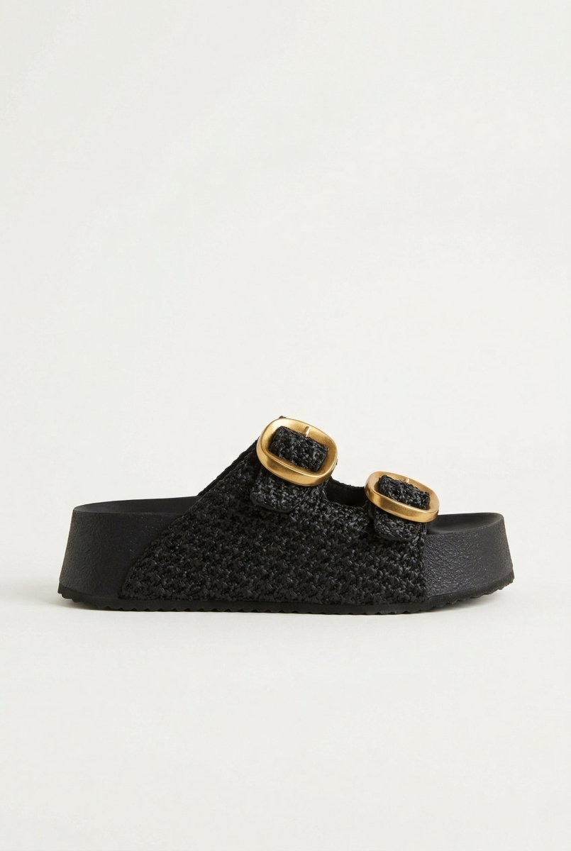 Flatform Sandals Buckle Detail - Black Raffia