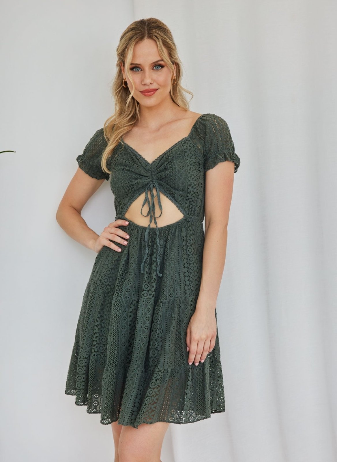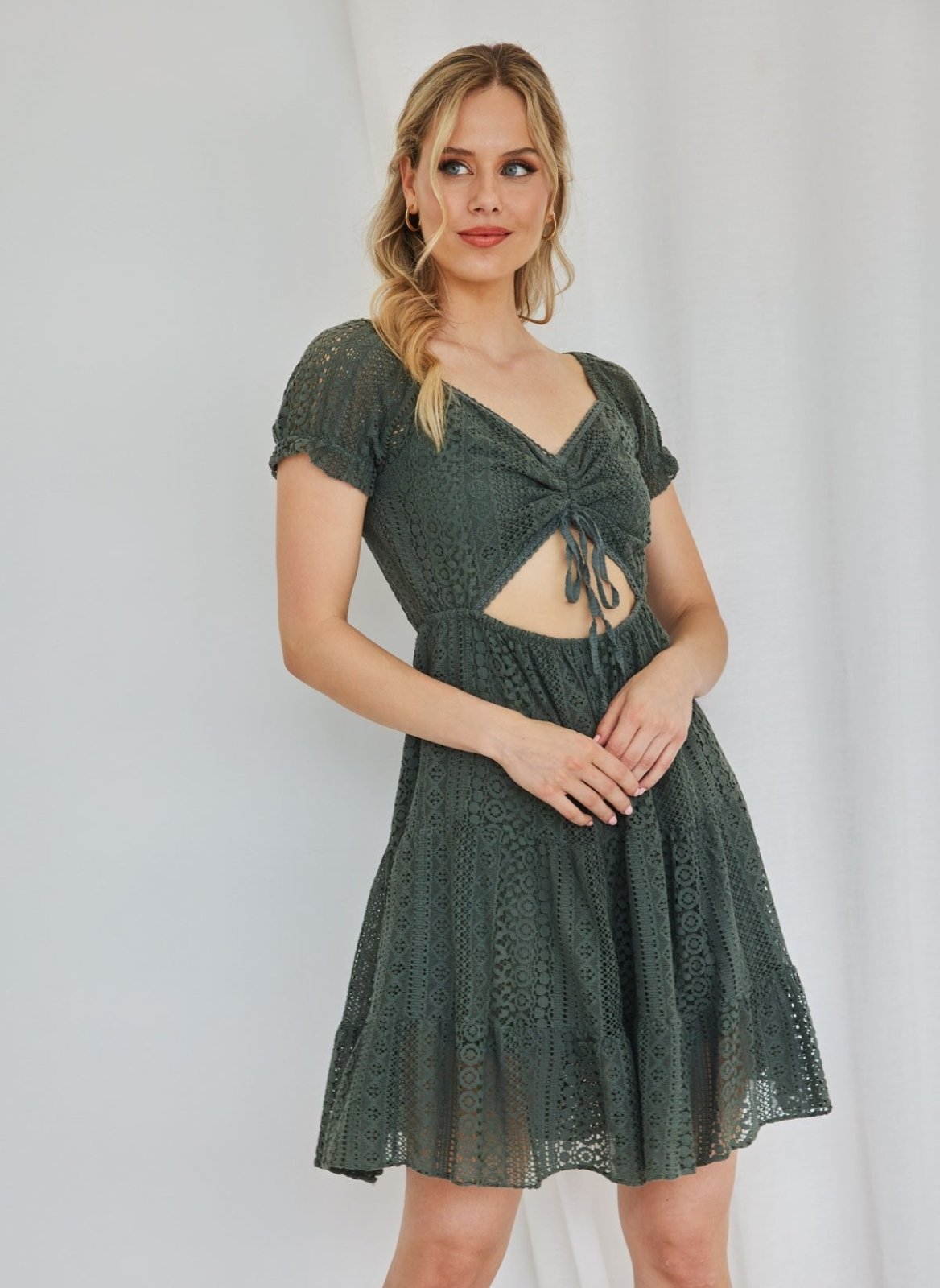 Φόρεμα μίνι με φαντέλα και διπλό ύφασμα. Έχει ανοιχτούς ώμους και λάστιχο στα μανίκια. Σχέδιο με κορδόνι στο μπούστο και cut out στη μπροστινή πλευρά.