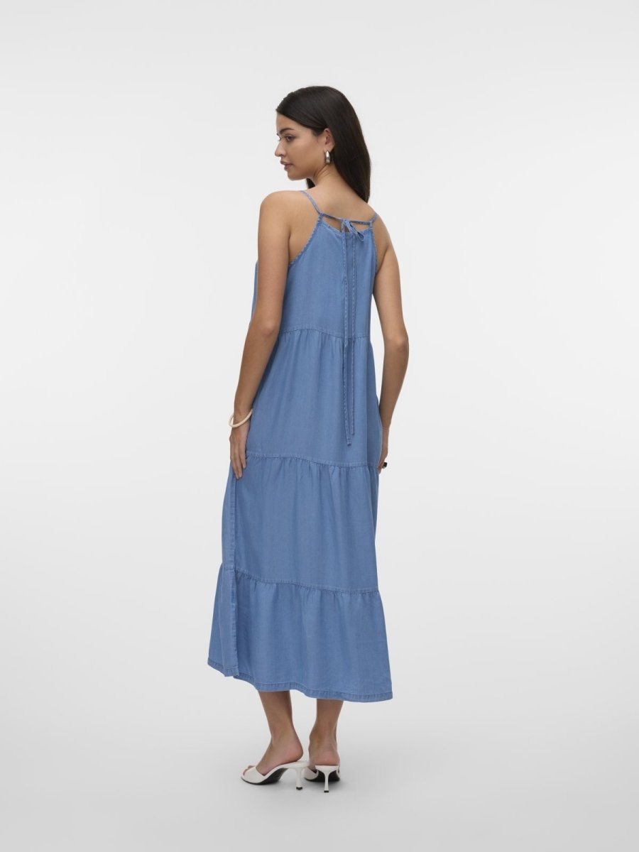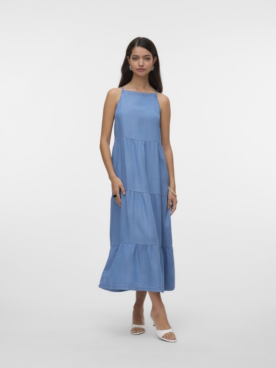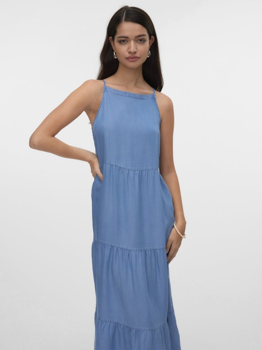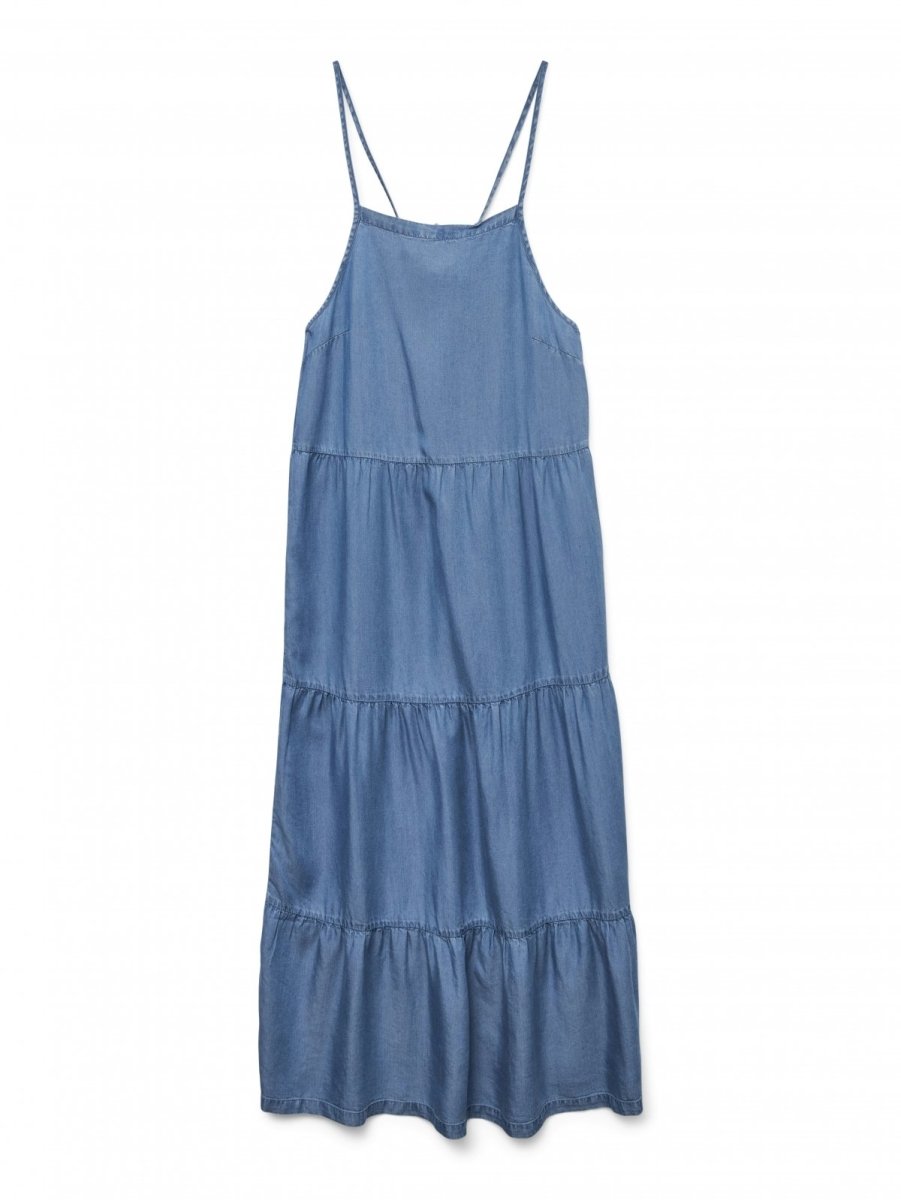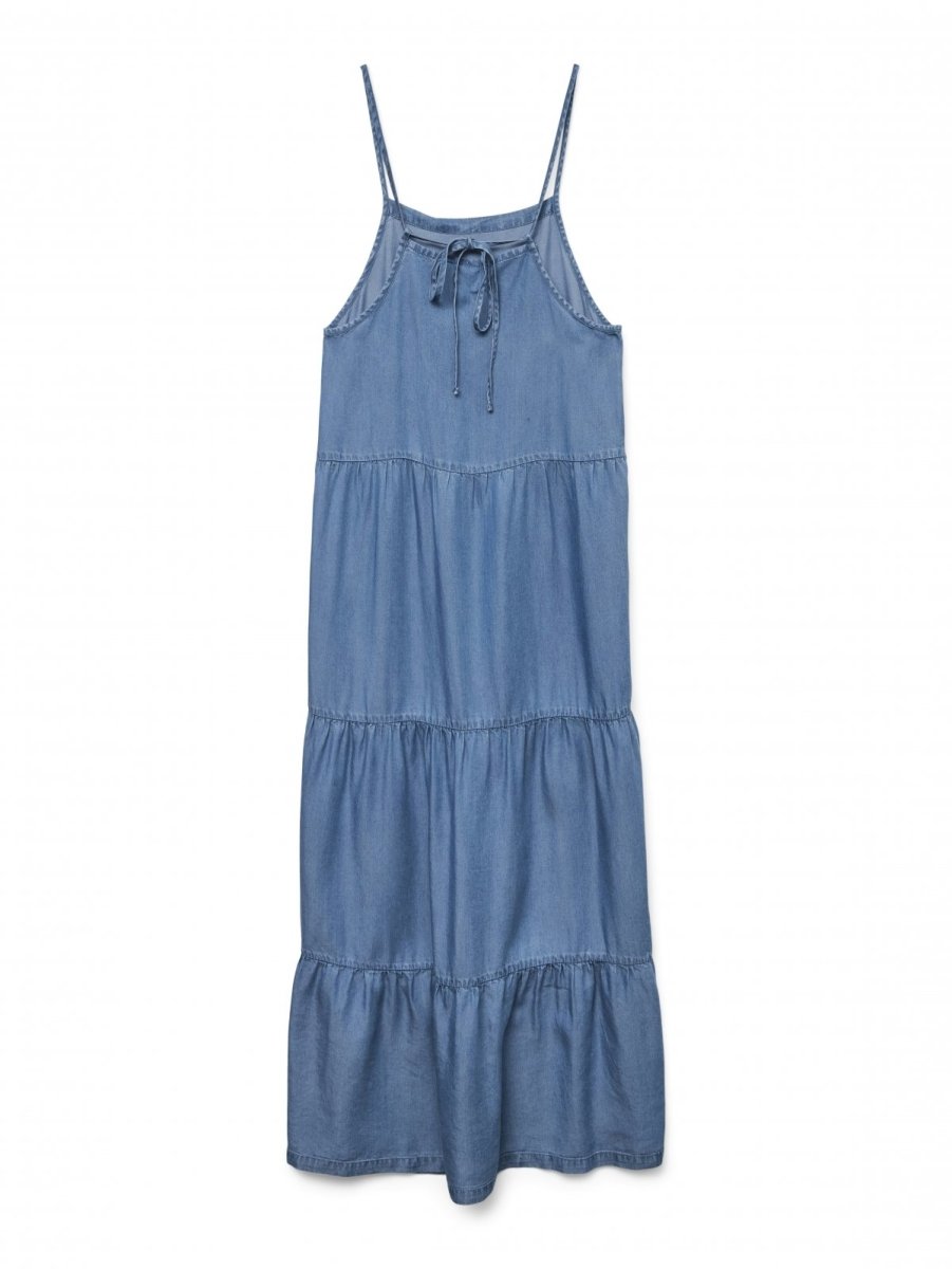 Φόρεμα μάξι με denim όψη Vero Moda. Halter λαιμόκοψη και δετά ρυθμιζόμενα ραντάκια.