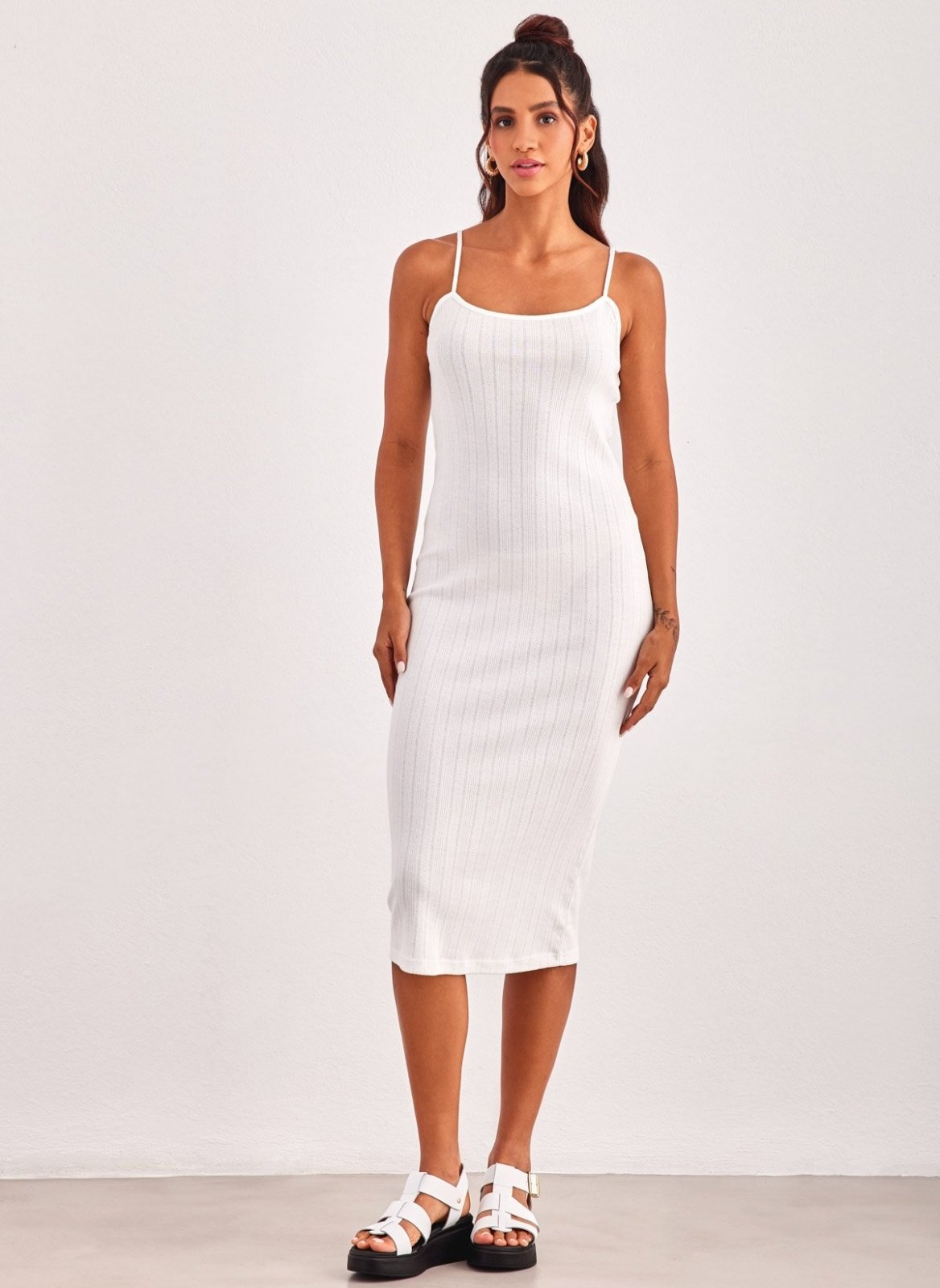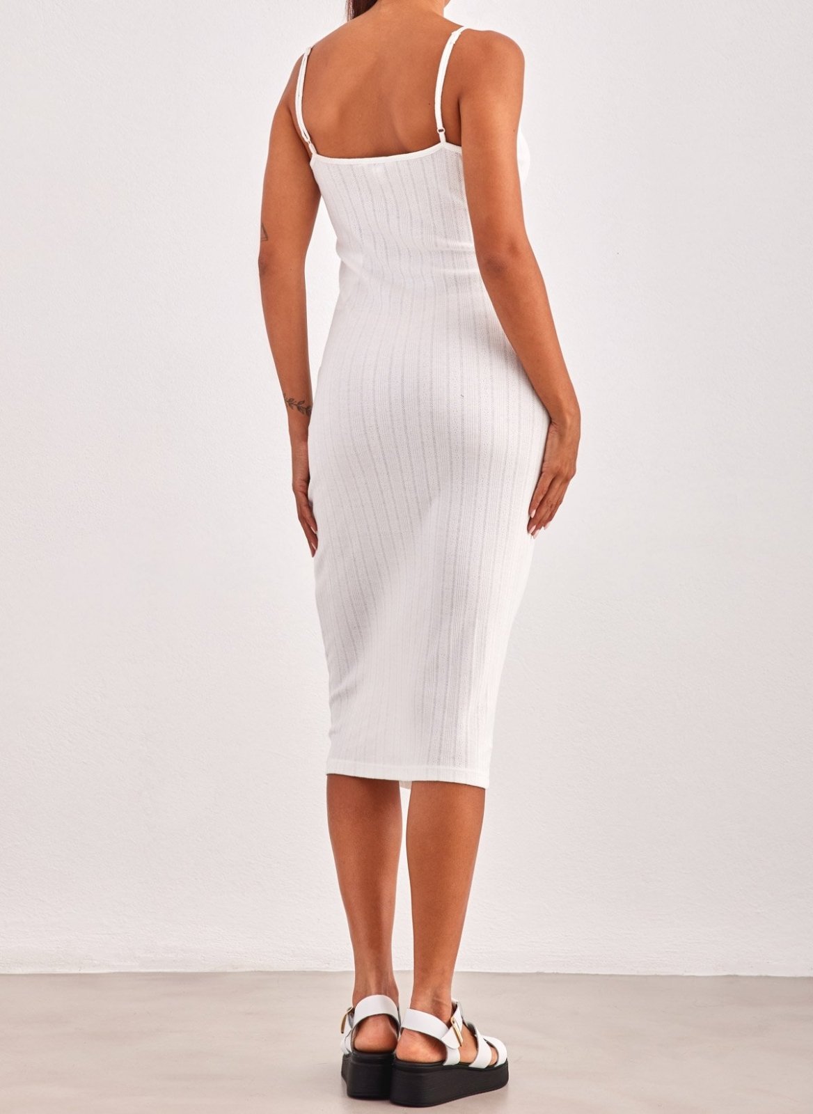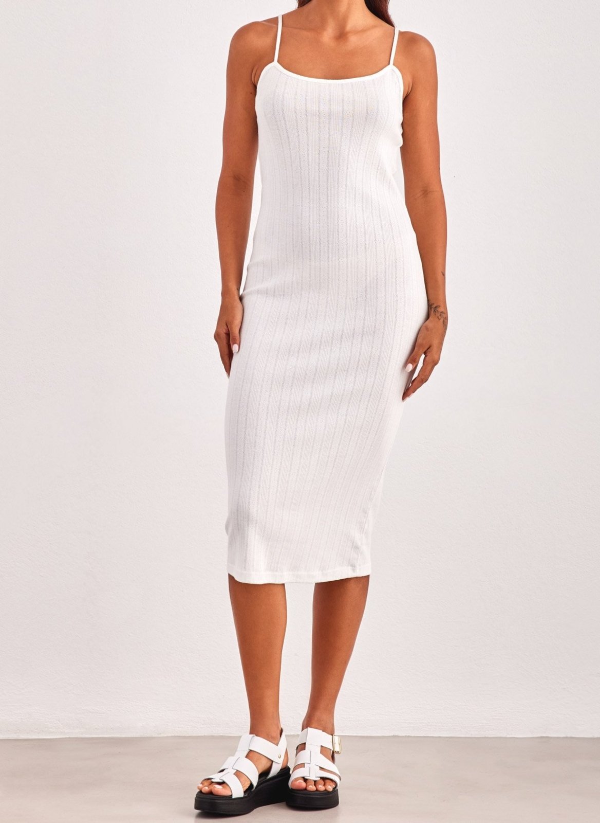 Φόρεμα βαμβακερό μίντι. Έχει λεπτά ραντάκια που αυξομειώνονται. Διάτρητο σχέδιο.