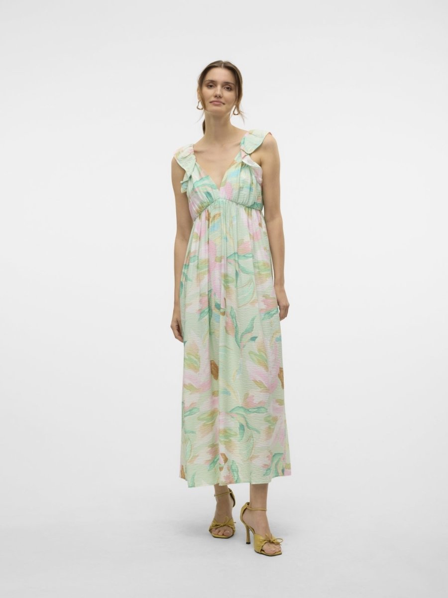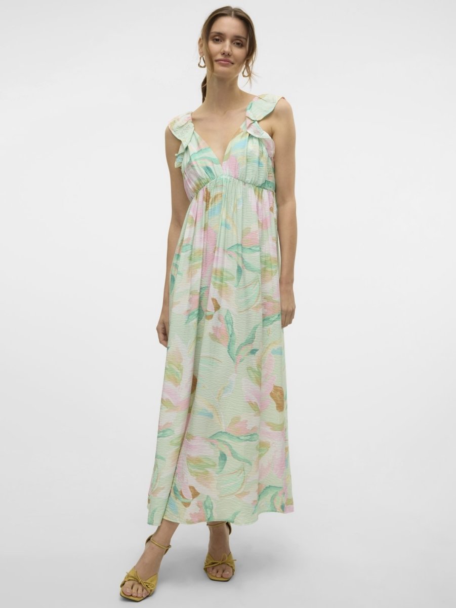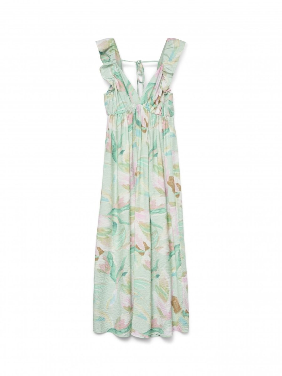Φόρεμα μακρύ σε συνδυασμούς χρωμάτων Vero Moda. V cut λαιμόκοψη με βολάν στους ώμους. Ανοιχτή πλάτη με δέσιμο.