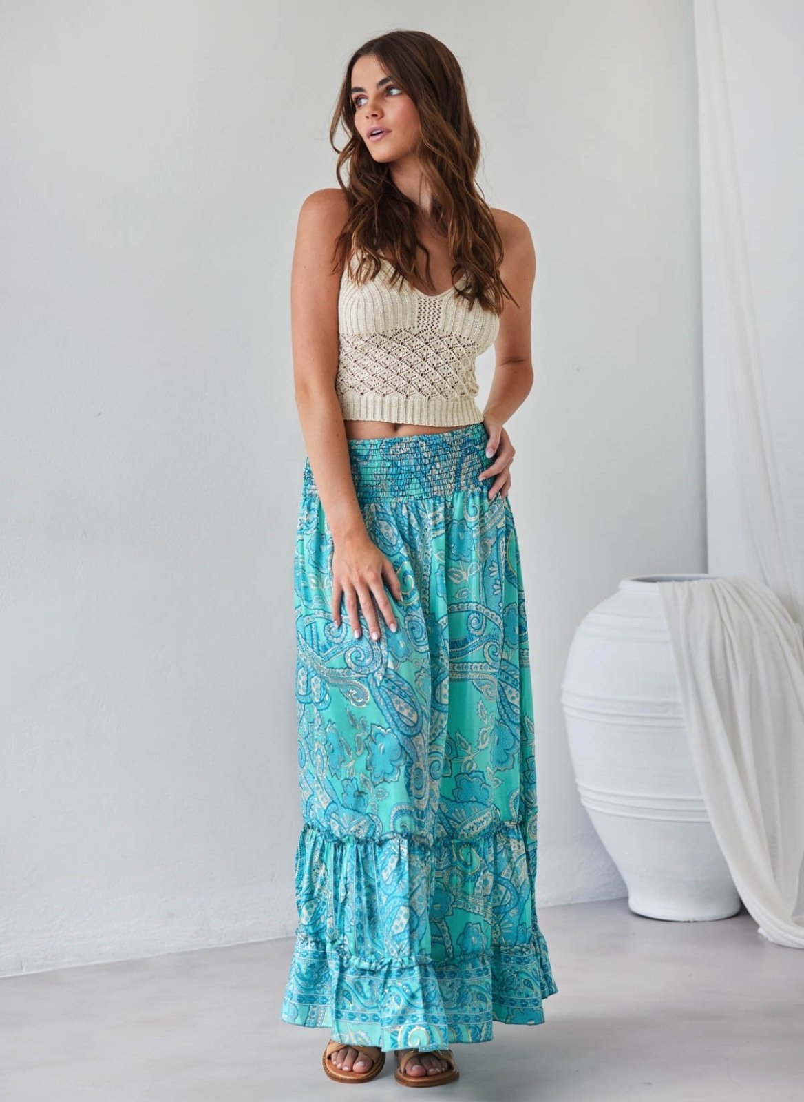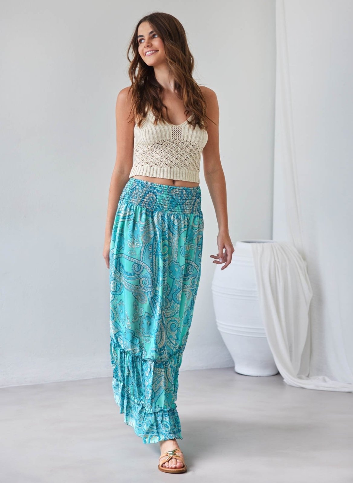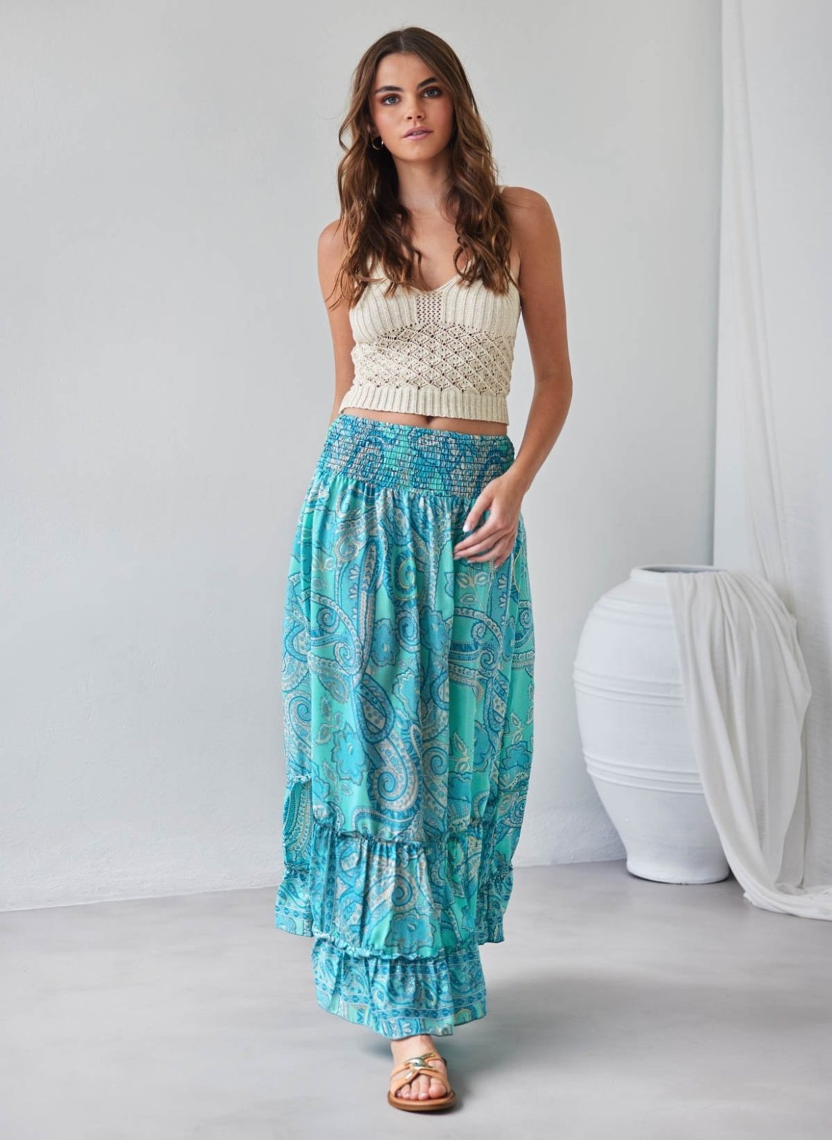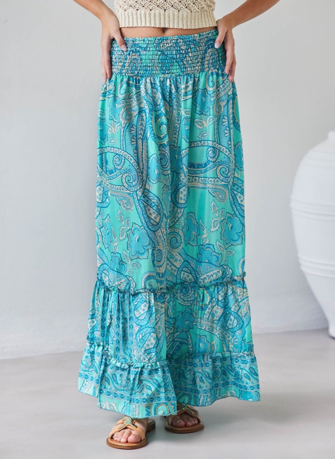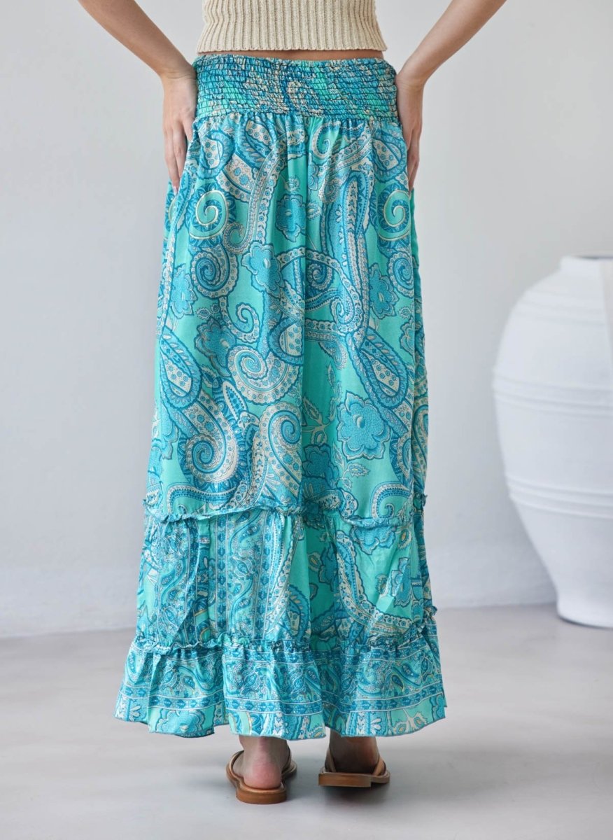 Φούστα μάξι με boho λαχούρια. Έχει μπάσκα με μαλακό λάστιχο στη μέση. Βολάν στο τελείωμα. Limited edition. Made in India.