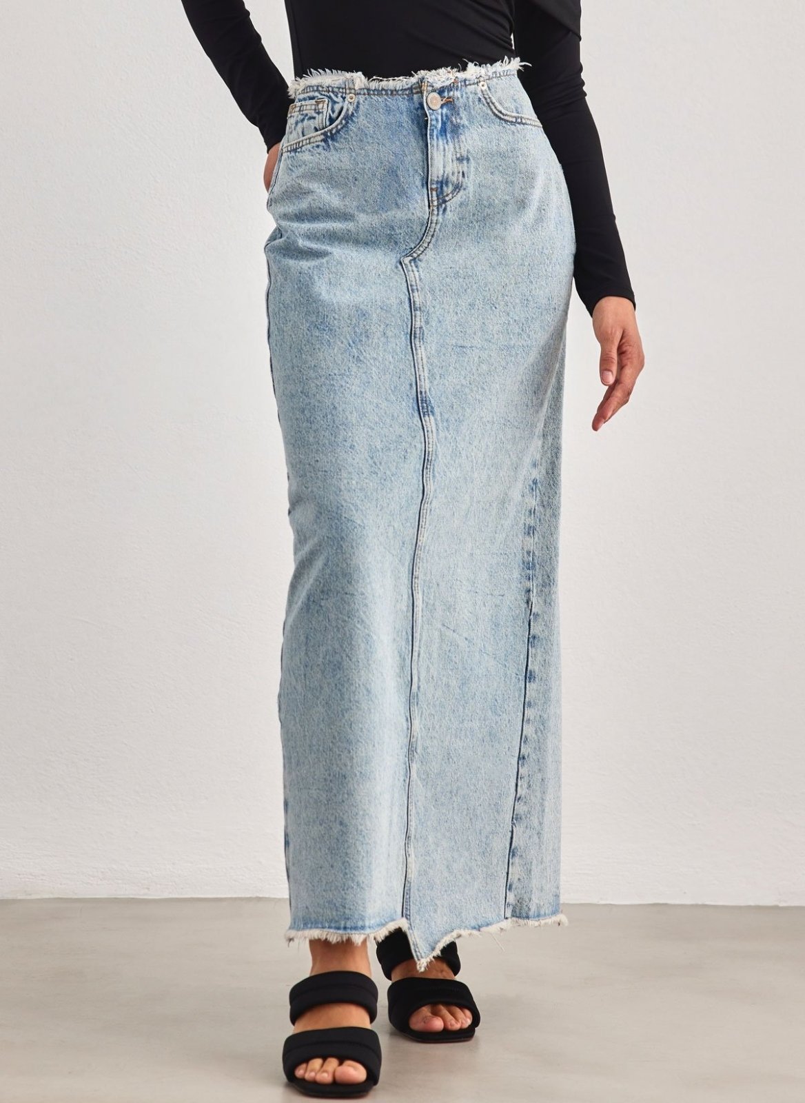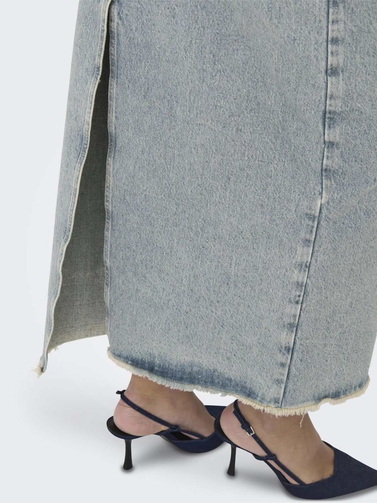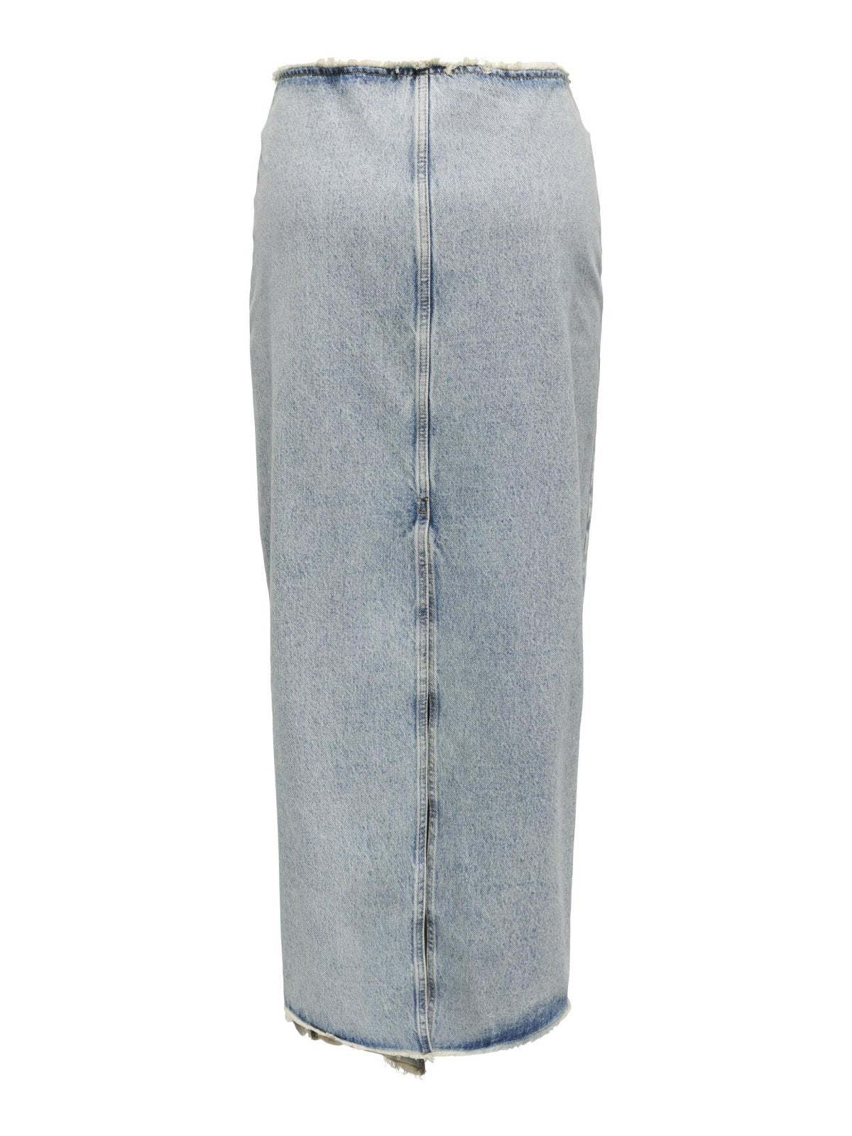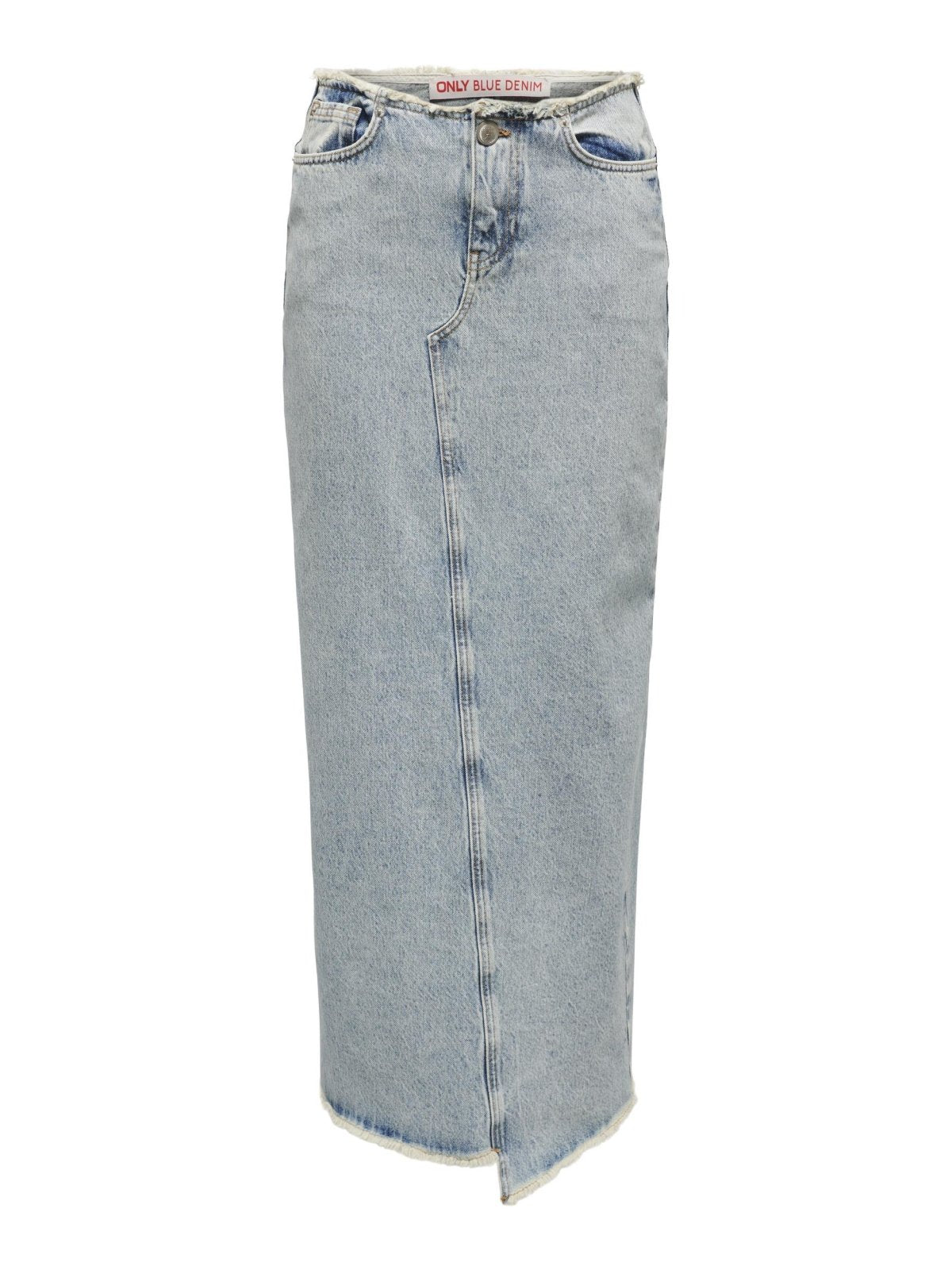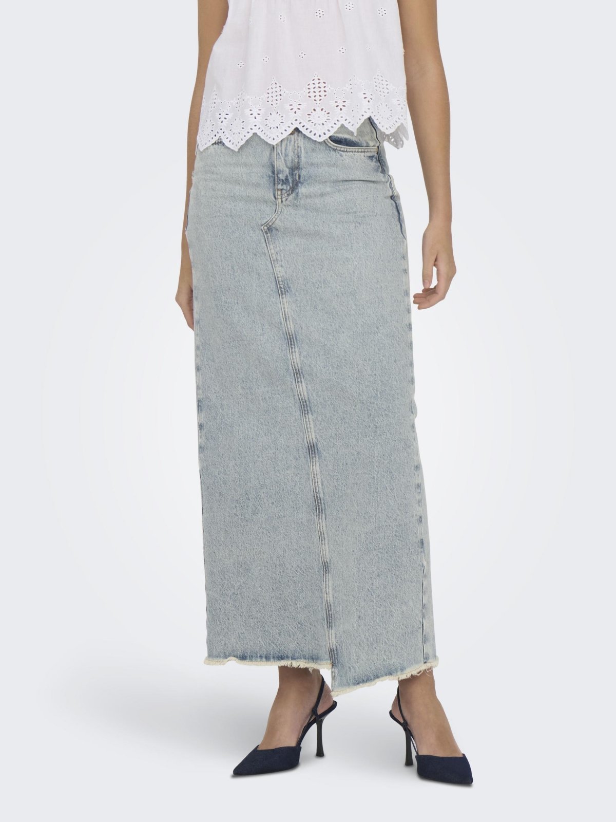 Φούστα τζιν μακριά ONLY. Ξέφτια στη μέση και άνοιγμα στην πίσω πλευρά. Ασύμμετρο τελείωμα με ξέφτια. Έχει τσέπες στο πλάι.