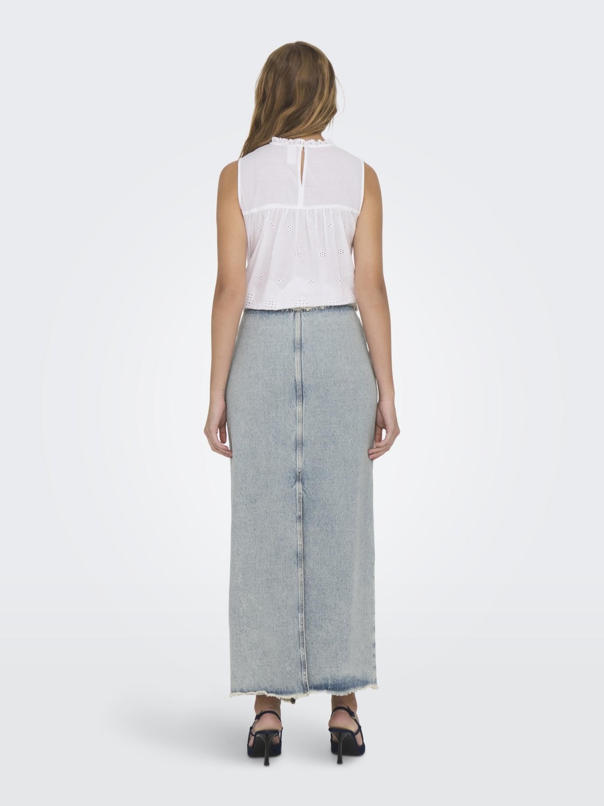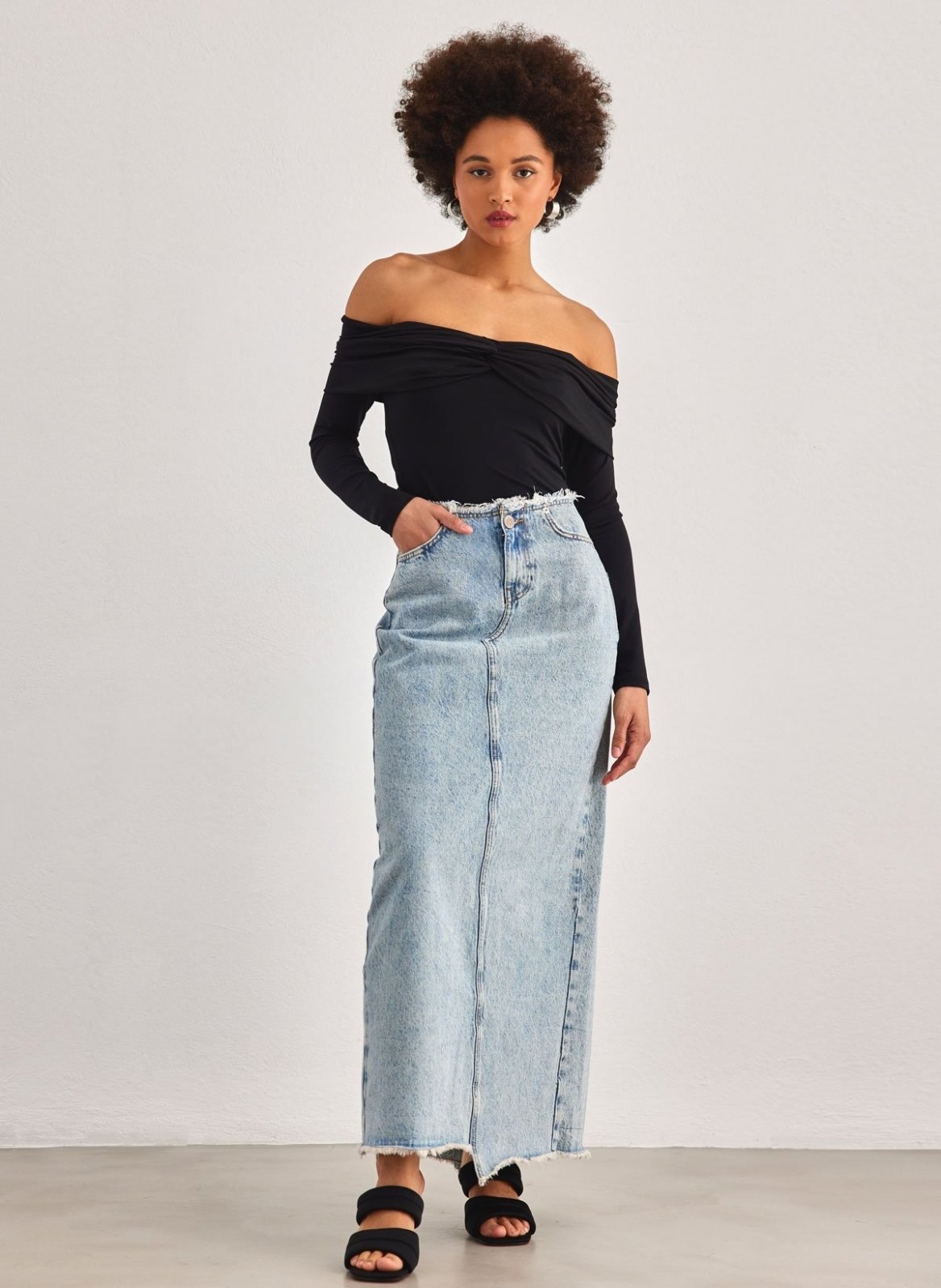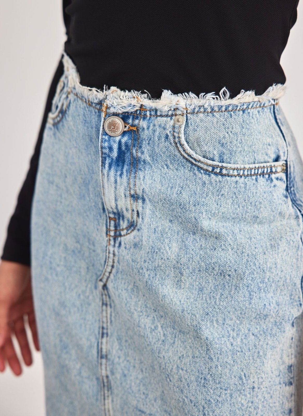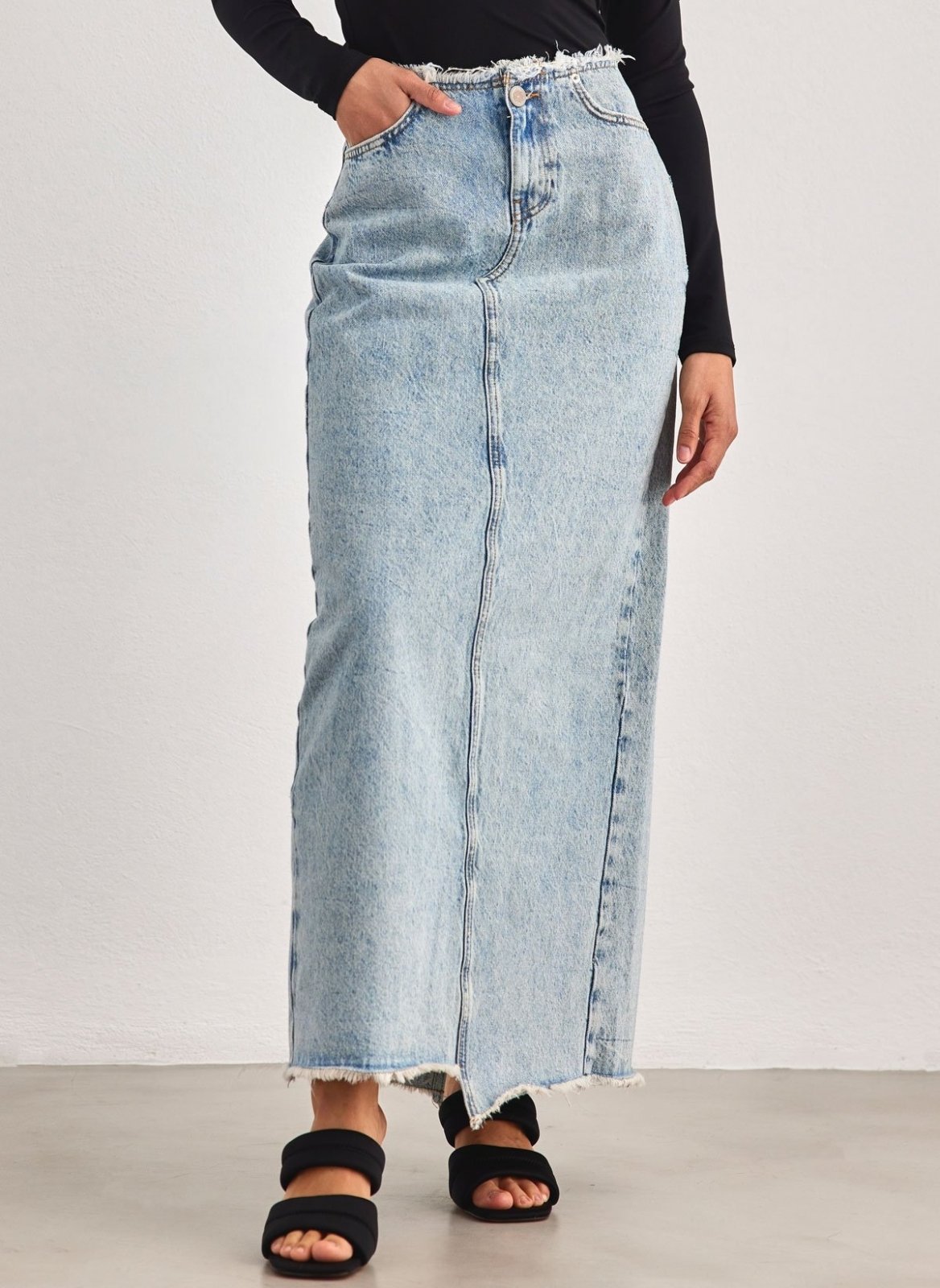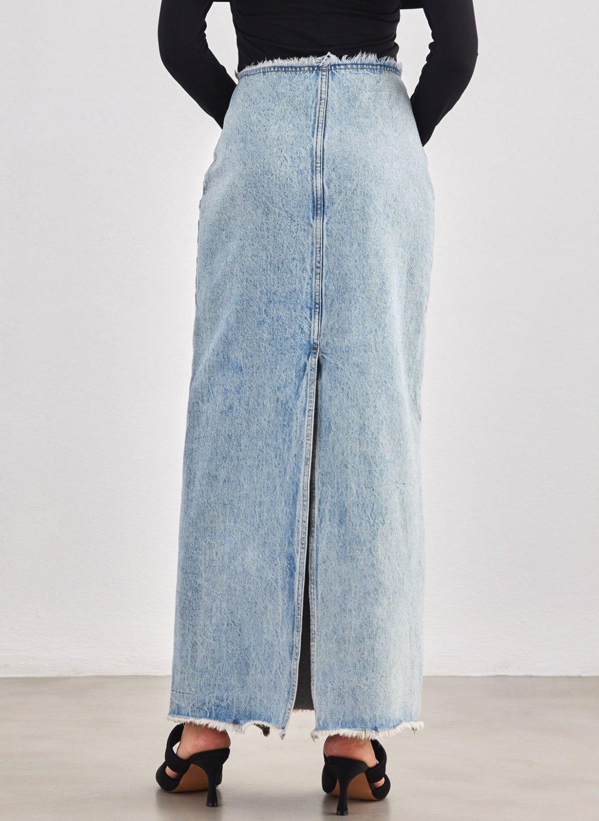Φούστα τζιν μακριά ONLY. Ξέφτια στη μέση και άνοιγμα στην πίσω πλευρά. Ασύμμετρο τελείωμα με ξέφτια. Έχει τσέπες στο πλάι.