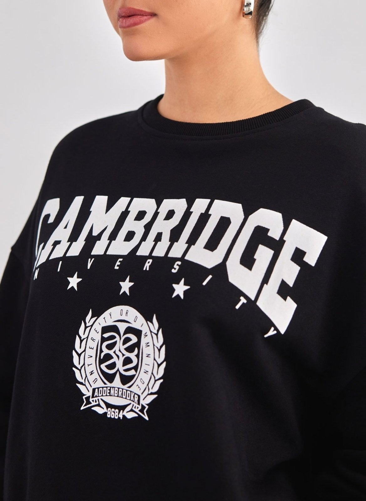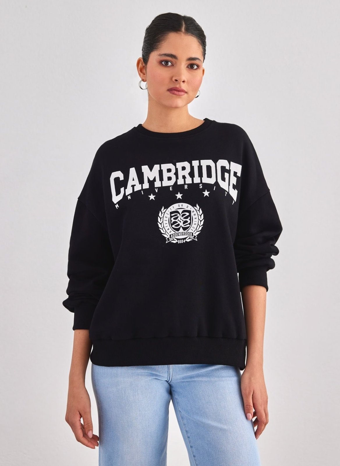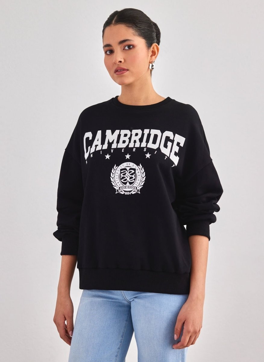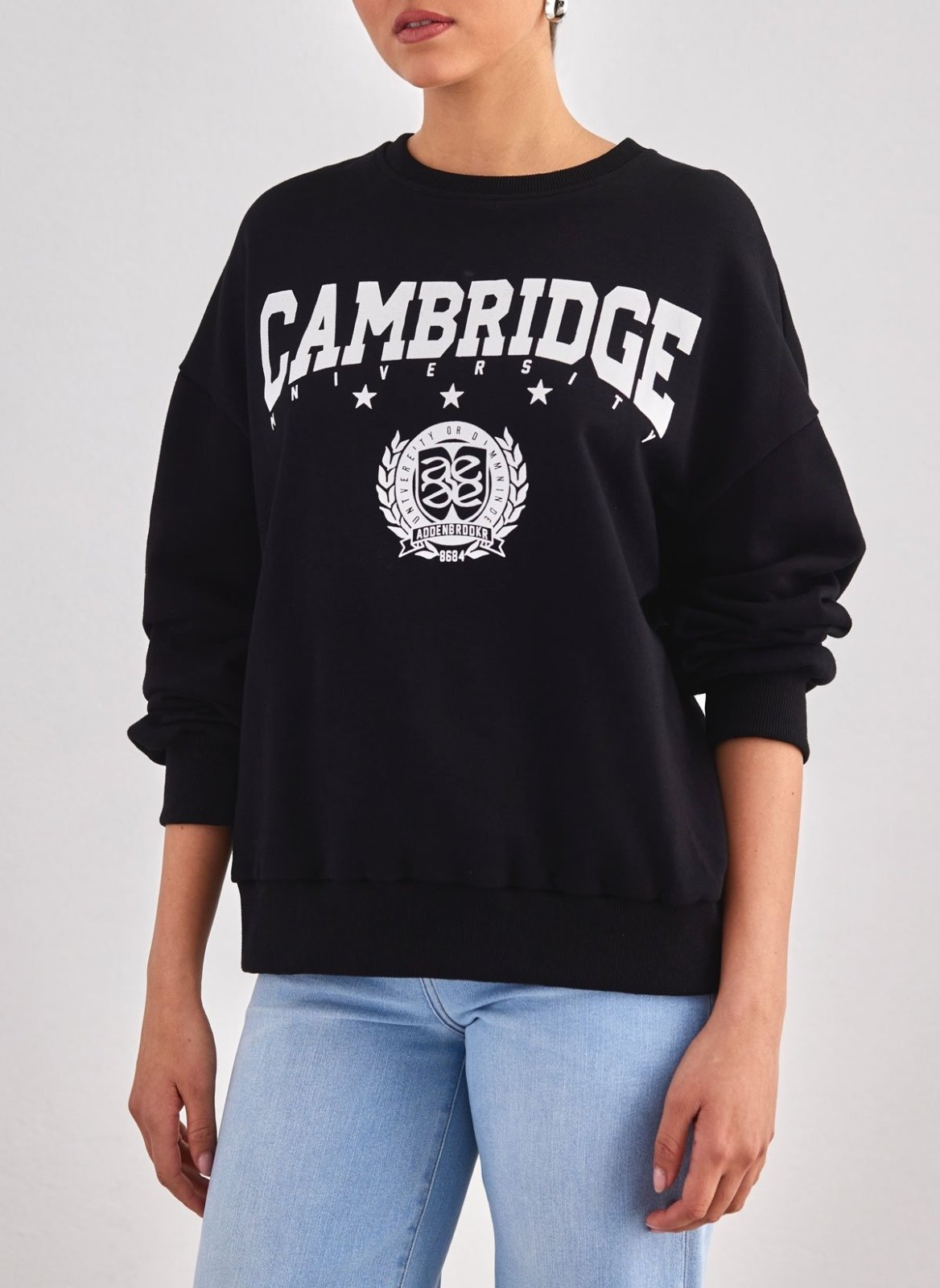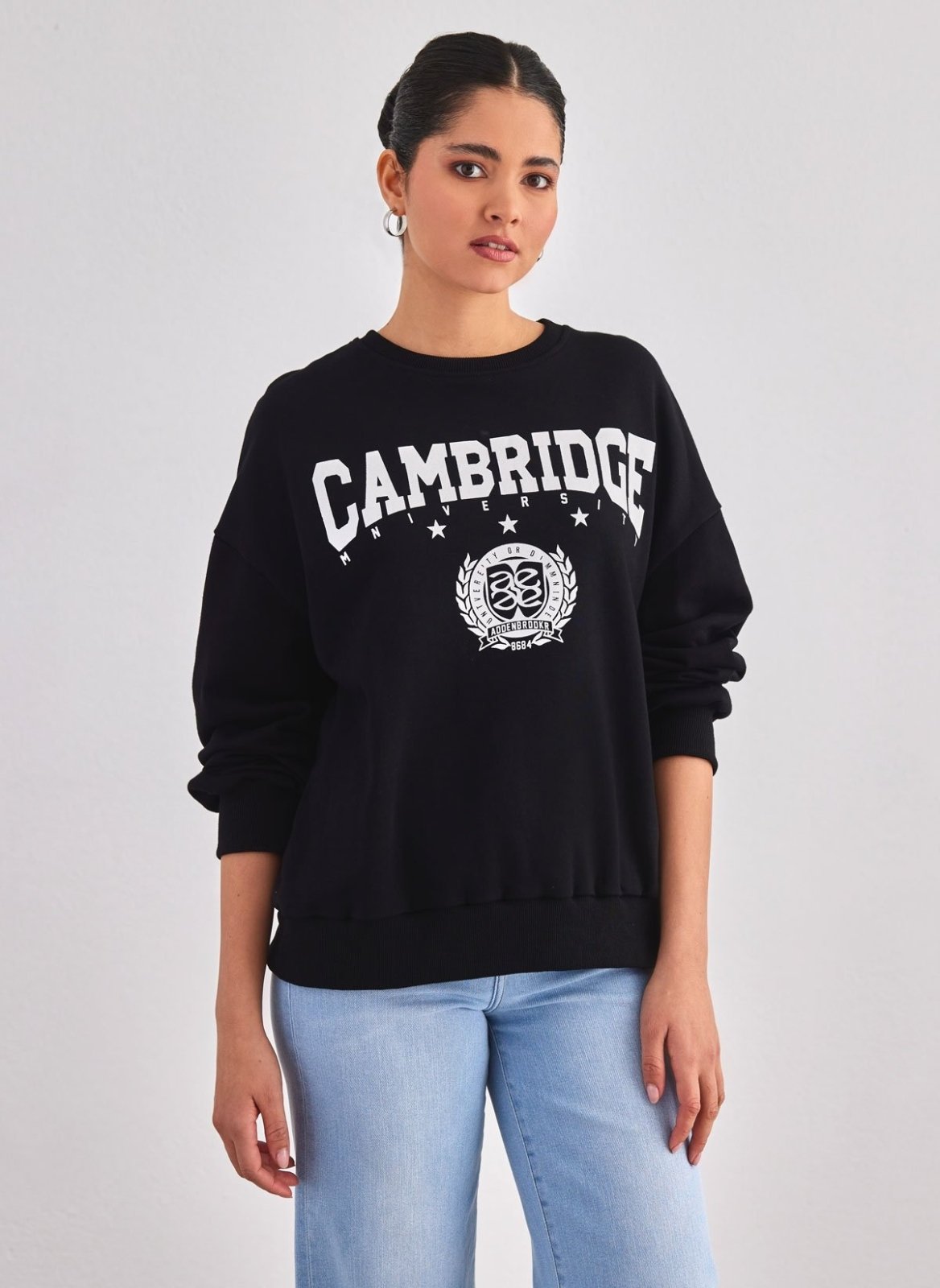 Φούτερ με στάμπα. Ίσια άνετη γραμμή. Ριμπ λεπτομέρεια στα μανίκια και το τελείωμα. Στρογγυλή λαιμόκοψη.