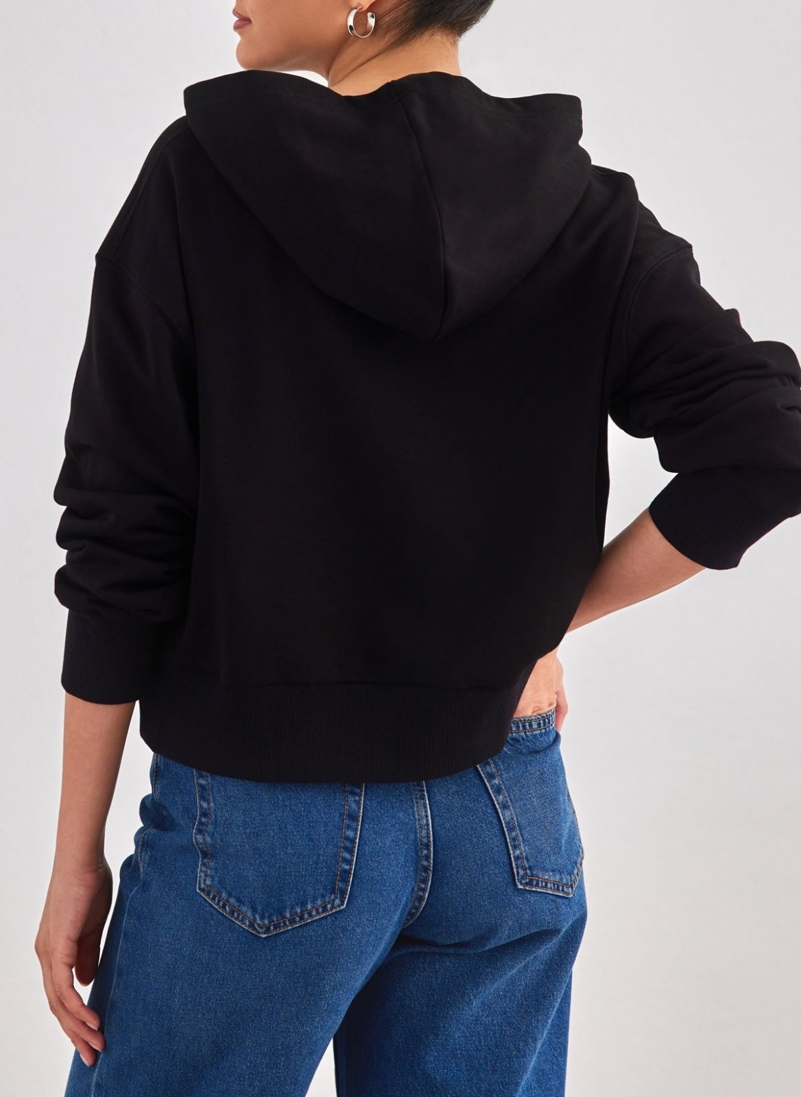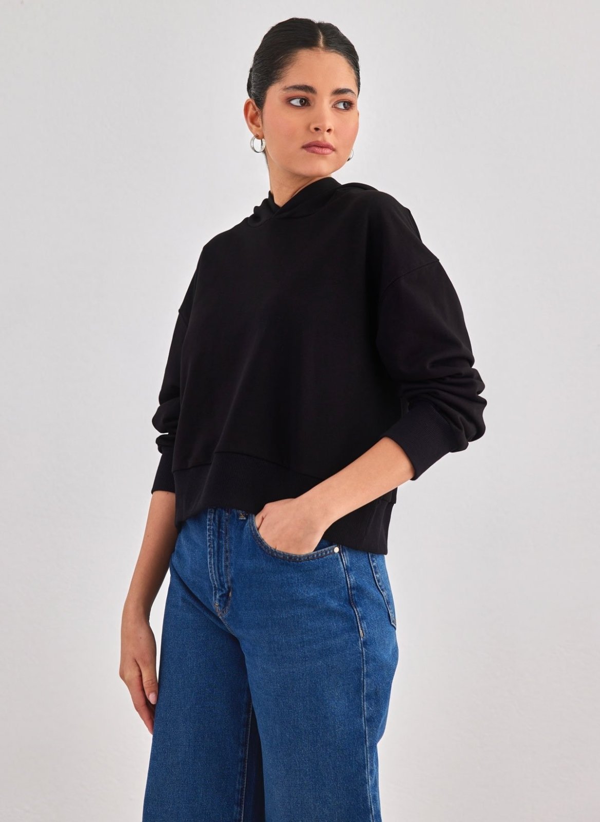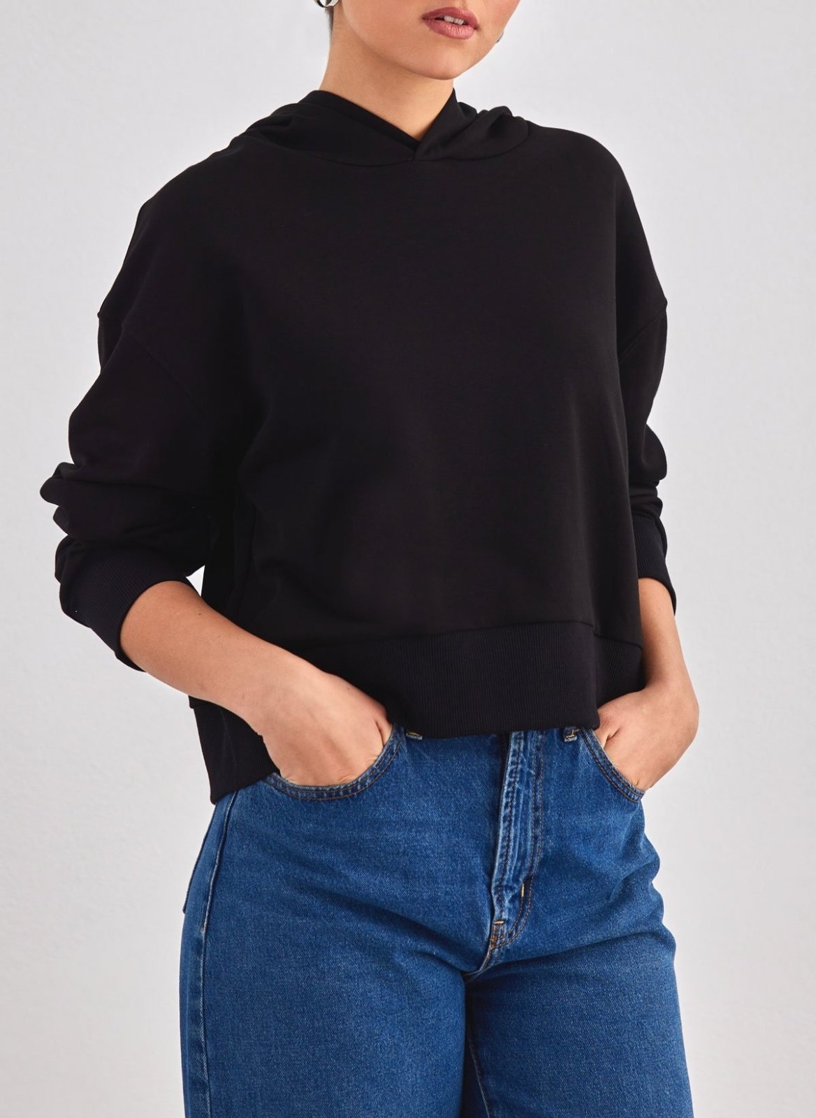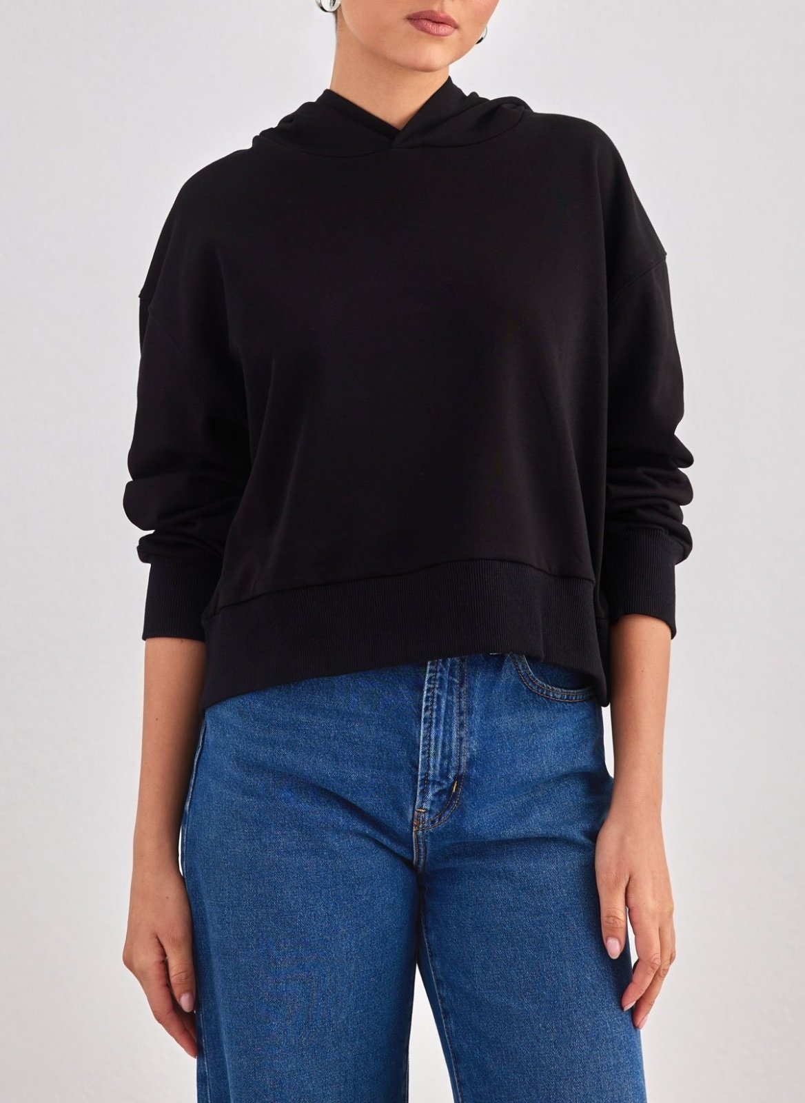 Φούτερ κοντό με κουκούλα. Ίσια γραμμή. Φαρδύ ριμπ τελείωμα στα μανίκια και το κάτω μέρος.