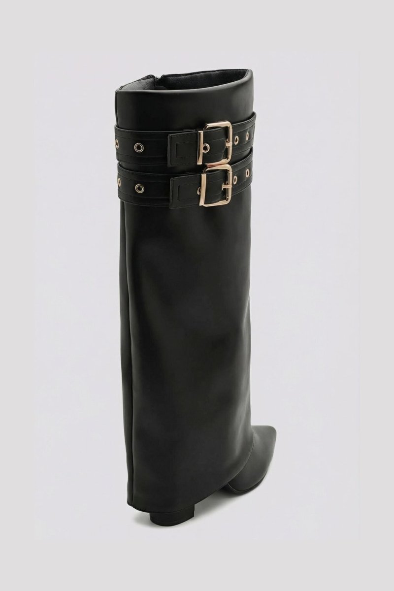 Statement gaiter boots with pointed toe, bold buckle straps and high block heel. A striking silhouette crafted for confident, modern style.