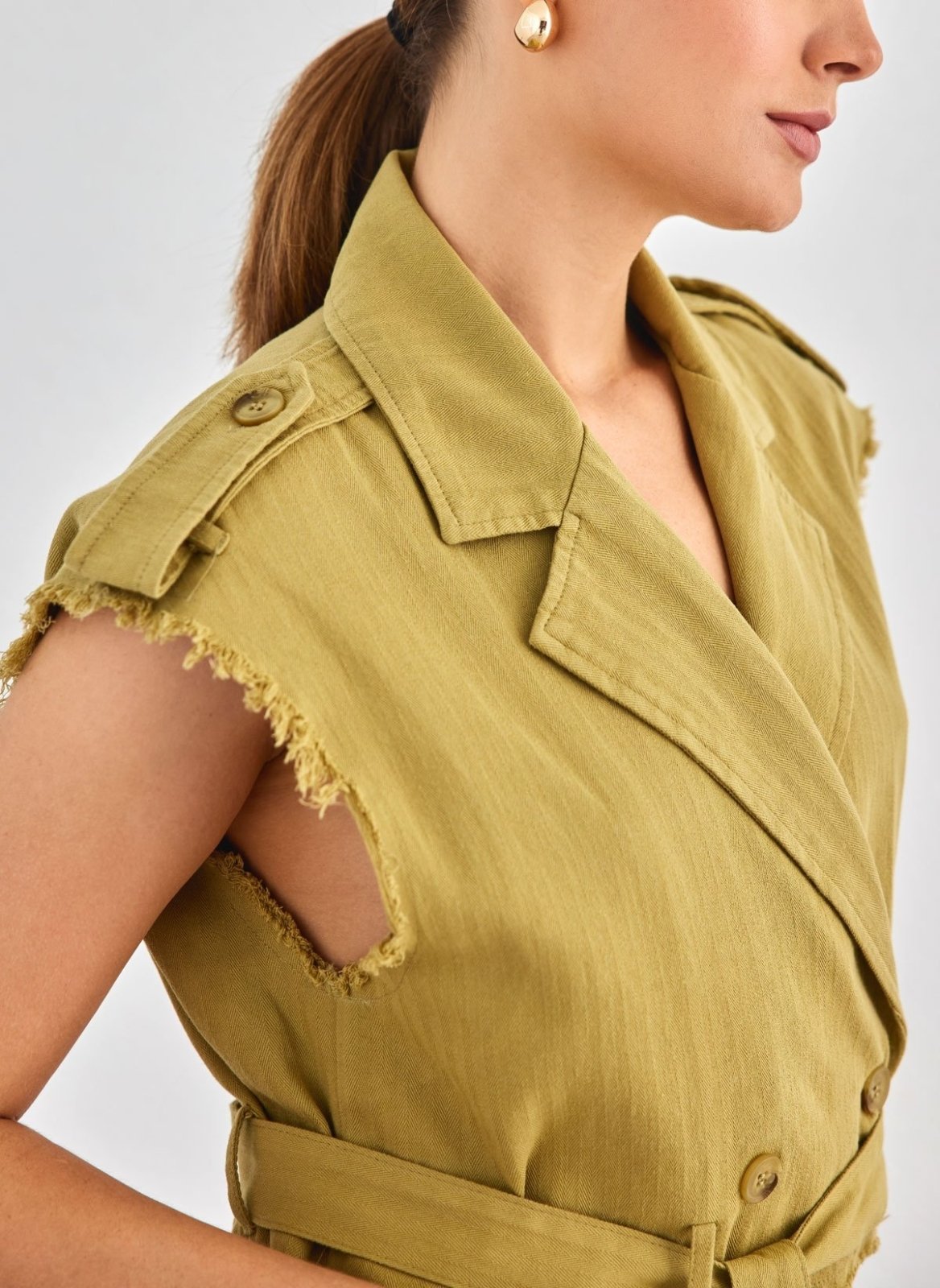 Γιλέκο υφασμάτινο με κουμπιά. Έχει τελειώματα με ξέφτια χωρίς ραφές. Σταυρωτό κούμπωμα με κουμπιά. Ζωνάκι δετό στο ίδιο χρώμα στο τελείωμα.
