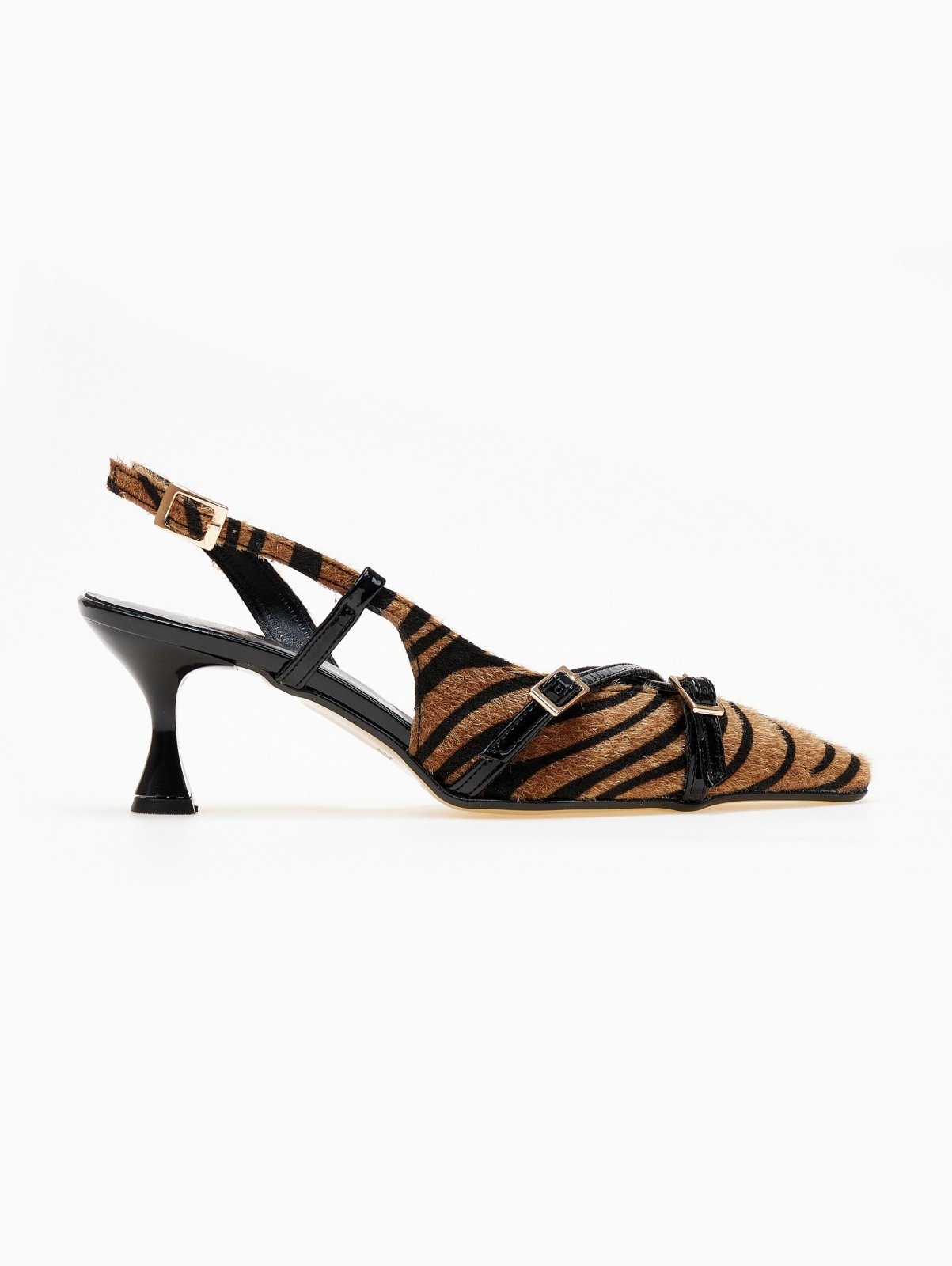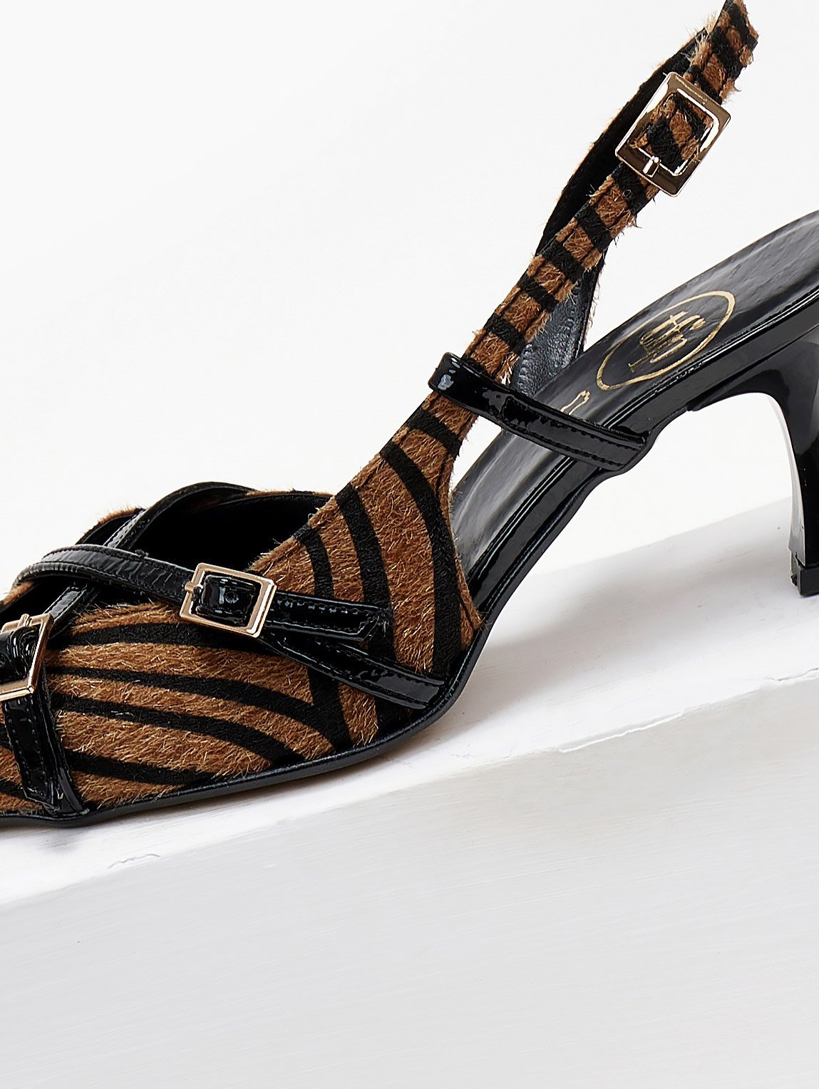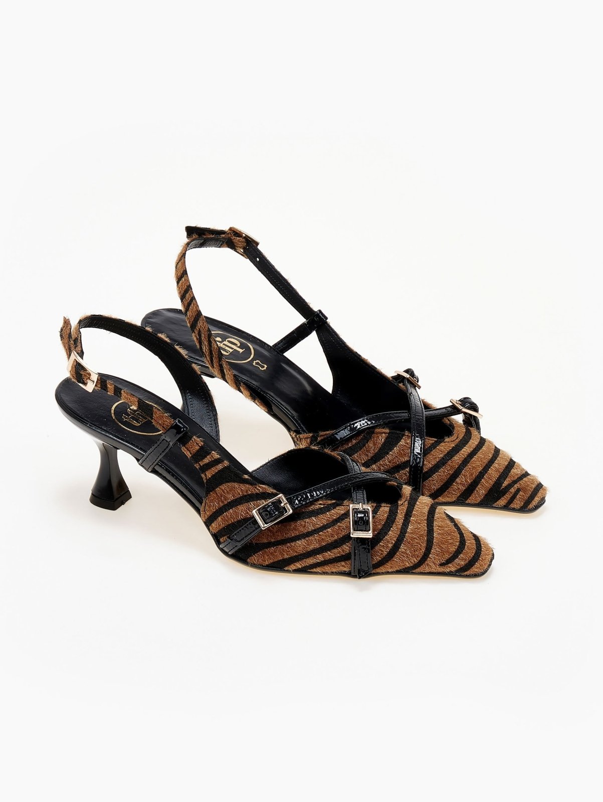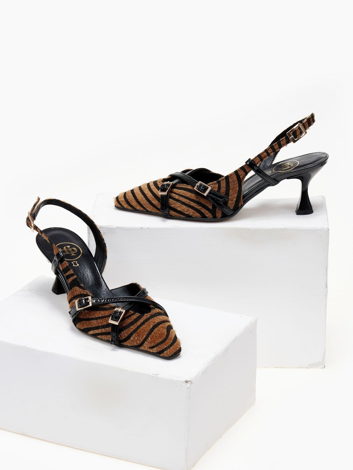 Γόβες μυτερές slingback από συνθετικό ponyskin TFP. Μυτερή φόρμα. Σχέδιο crossover λουράκι στο κουτεπιέ. Δερμάτινος πάτος. Ελληνικής κατασκευής.