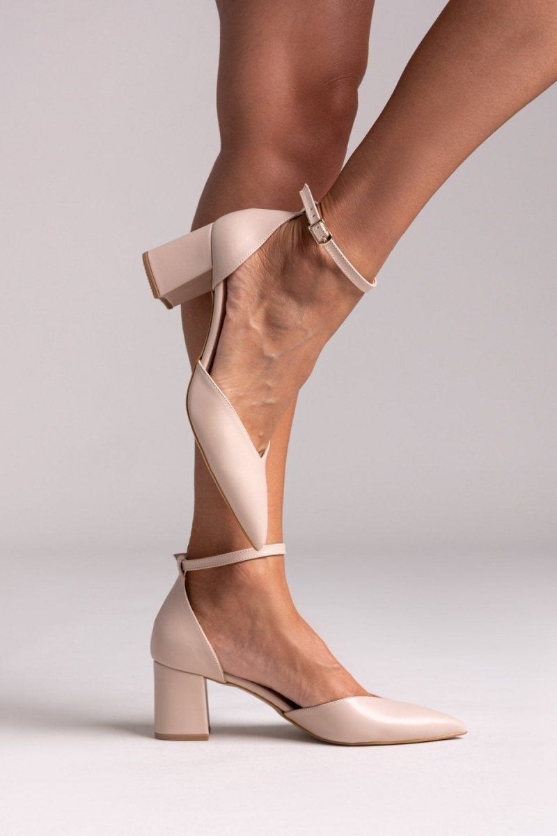 Elegant pointed pumps with side cut, closed heel, and ankle strap. Designed with a low square heel for refined style and lasting comfort.